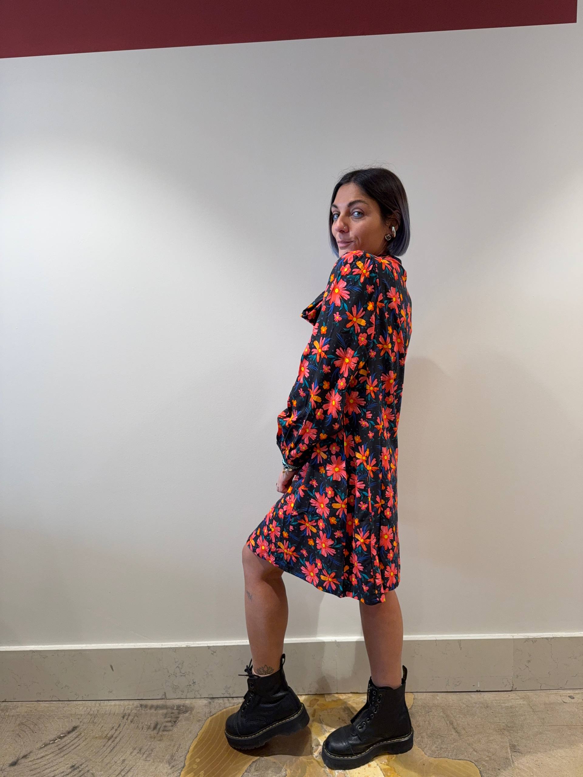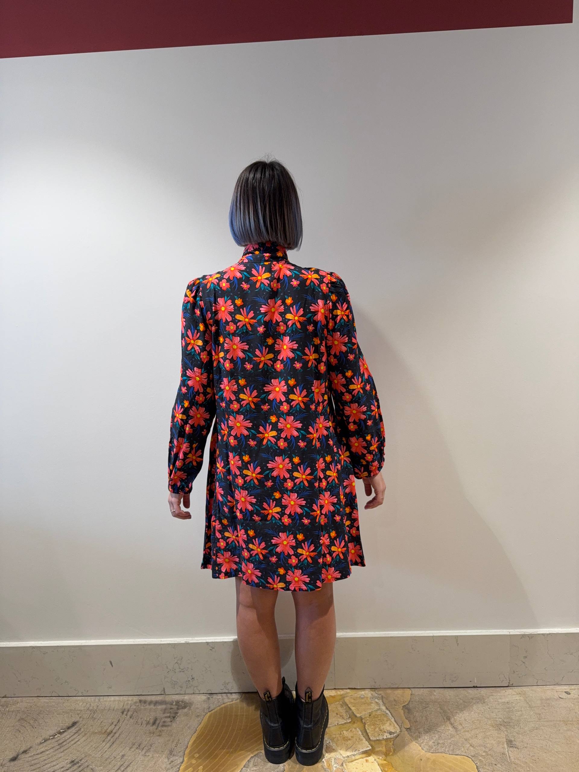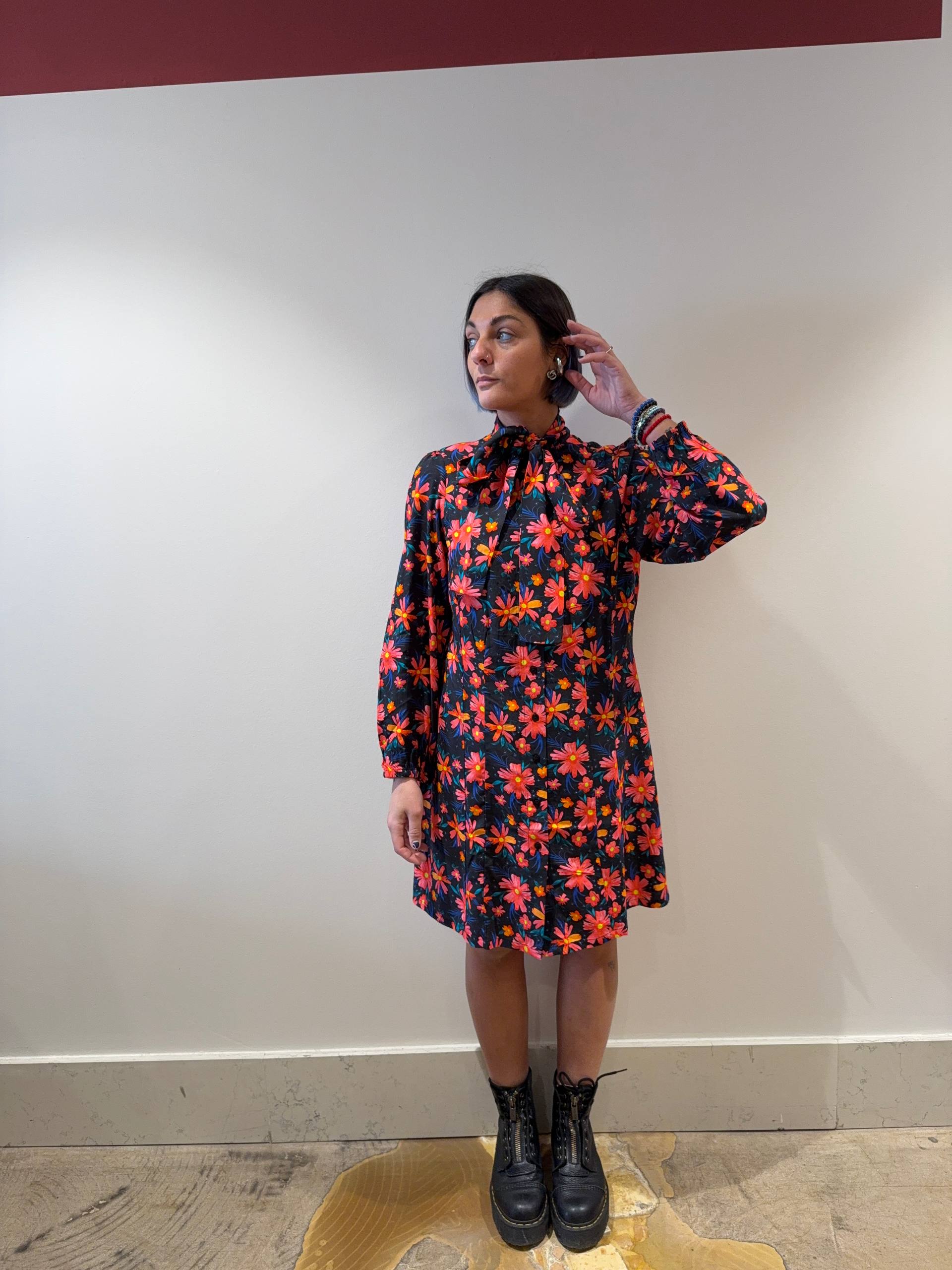 Abitino floreale con fiocco sul collo. Abbottonato al centro, maniche lunghe con polsini elasticizzati.