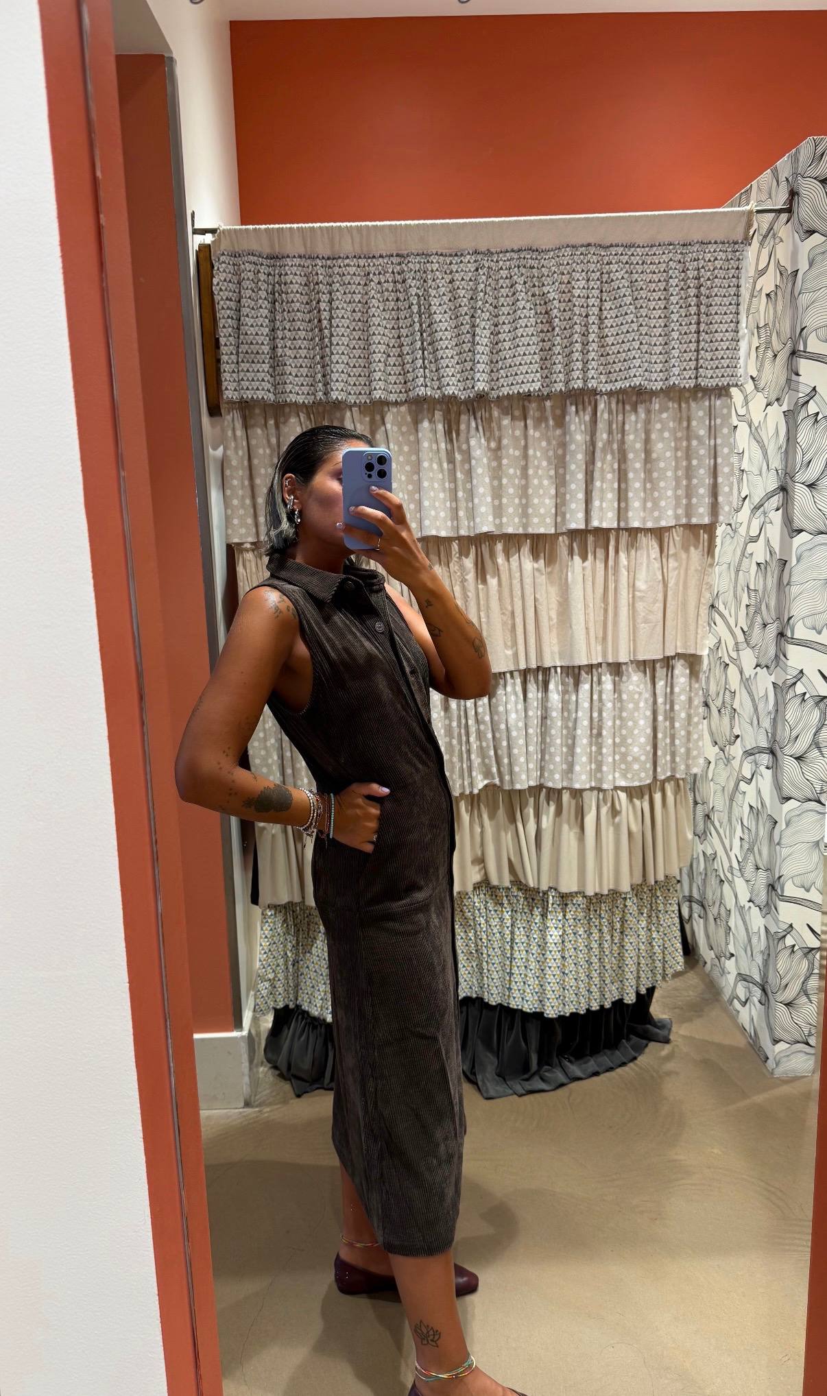 Abito scamiciata lunghezza midi a coste in velluto color cioccolato con colletto e tasche.