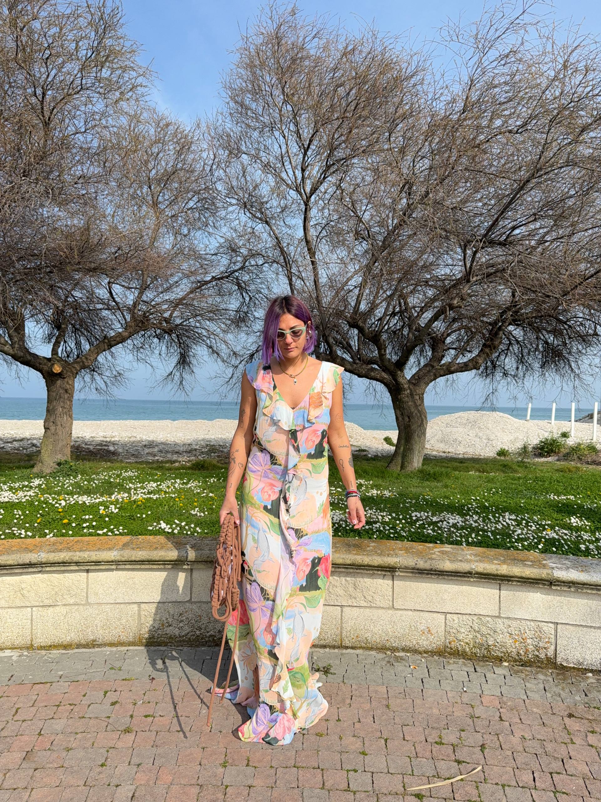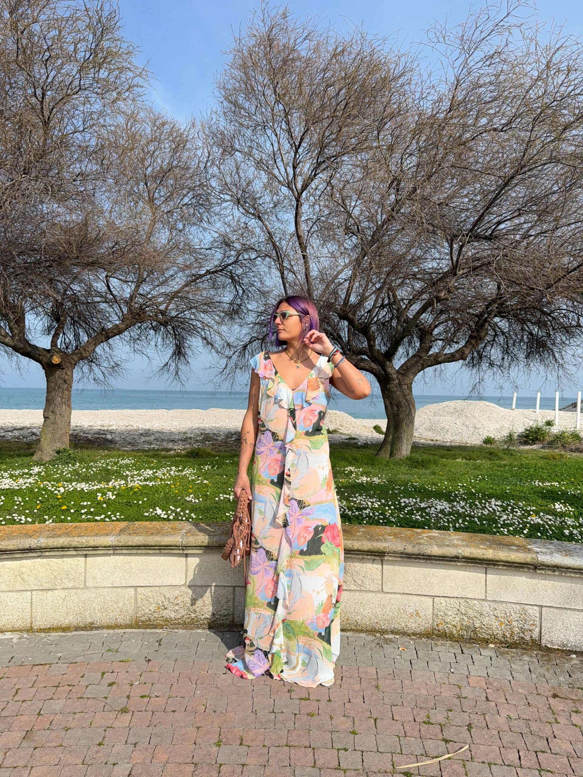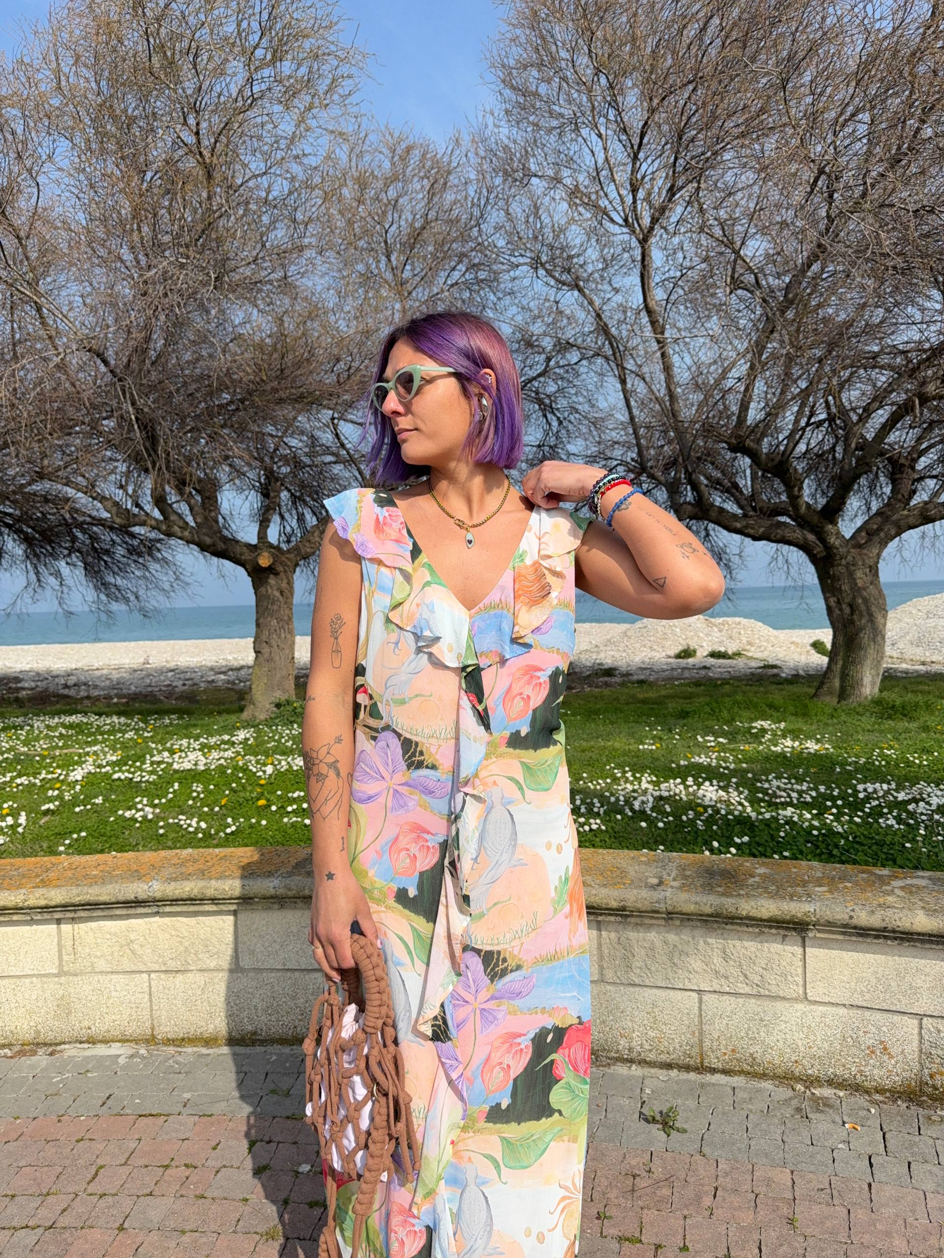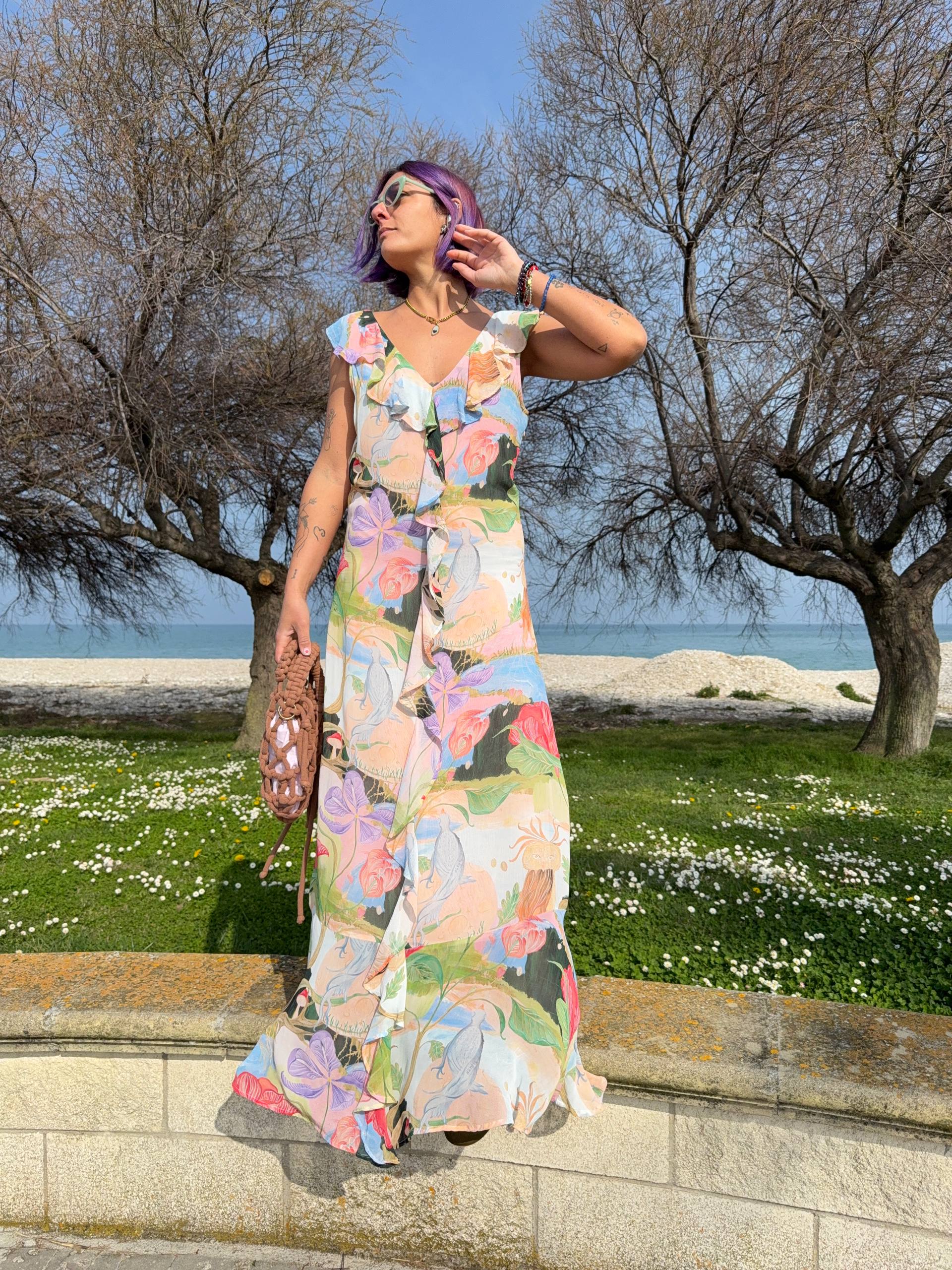 Abito lungo con fantasia paesaggio. tessuto velato con fodera. Scollatura a V avanti e dietro con volant. Vestibilità morbida.