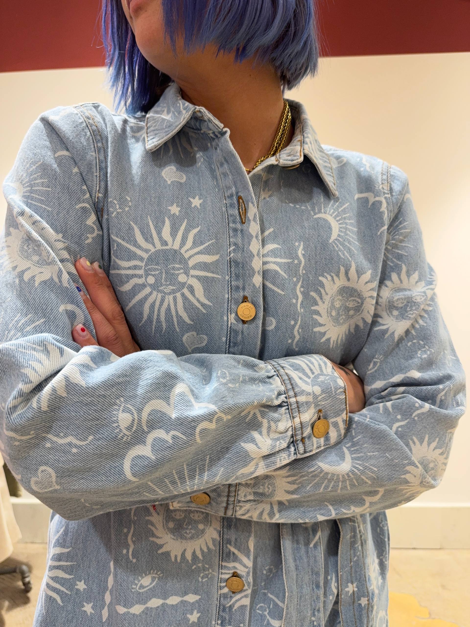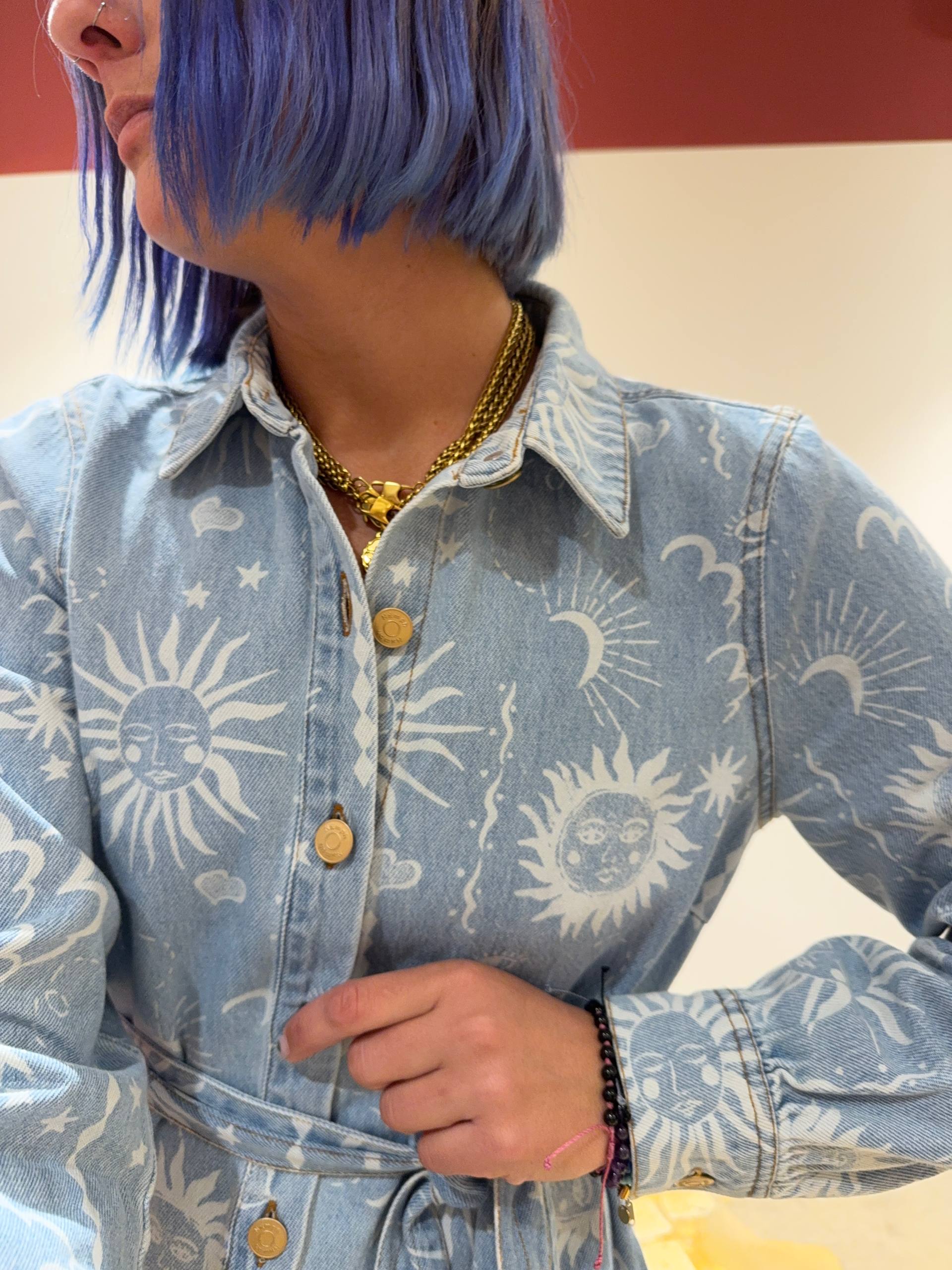 Abito in denim con stampa sole e luna