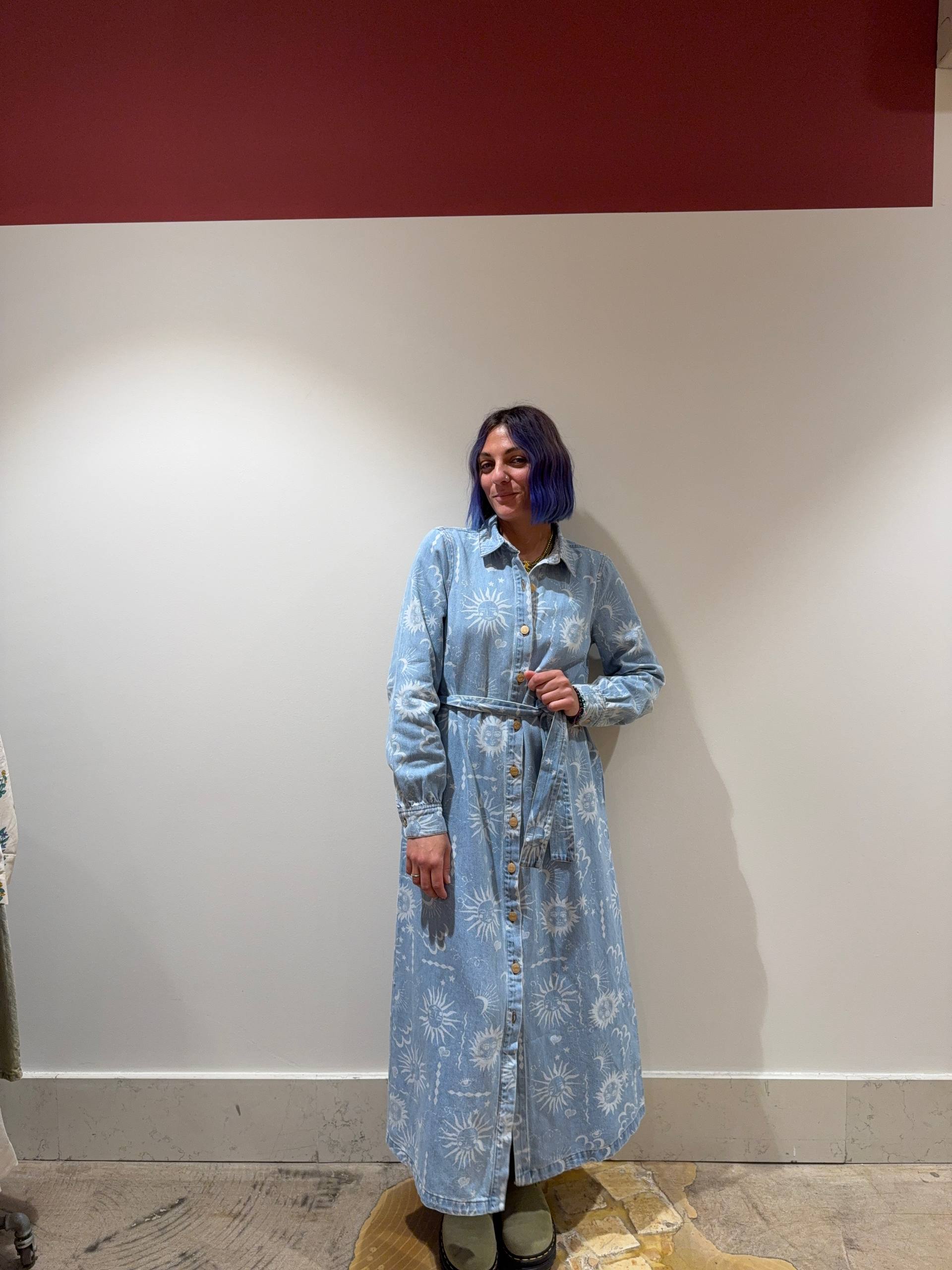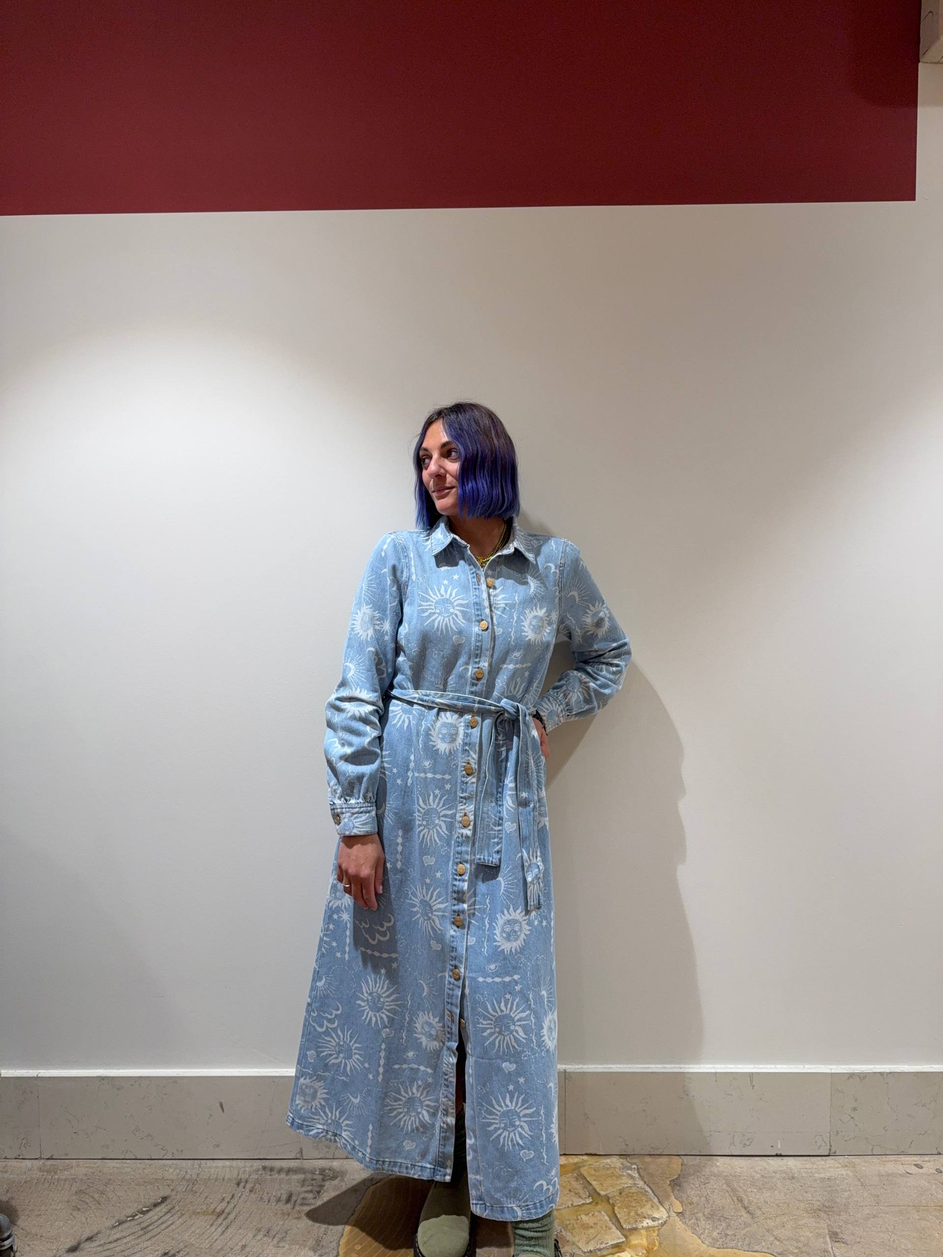 Abito chemisier con cintura in denim. Vestibilità morbida. Fantasia sole e luna. Isabella indossa la S e veste una 42 ed è alta 1.68.