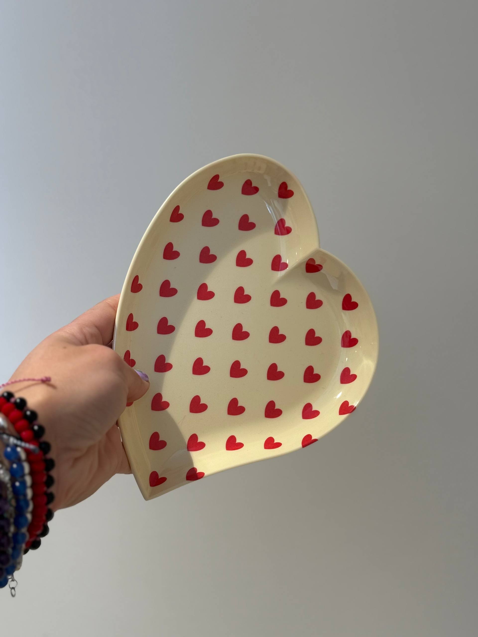 Piatto a forma di cuore con cuori rossi. Questo prodotto è realizzato in melamina, un materiale durevole e pratico per tutti i giorni.