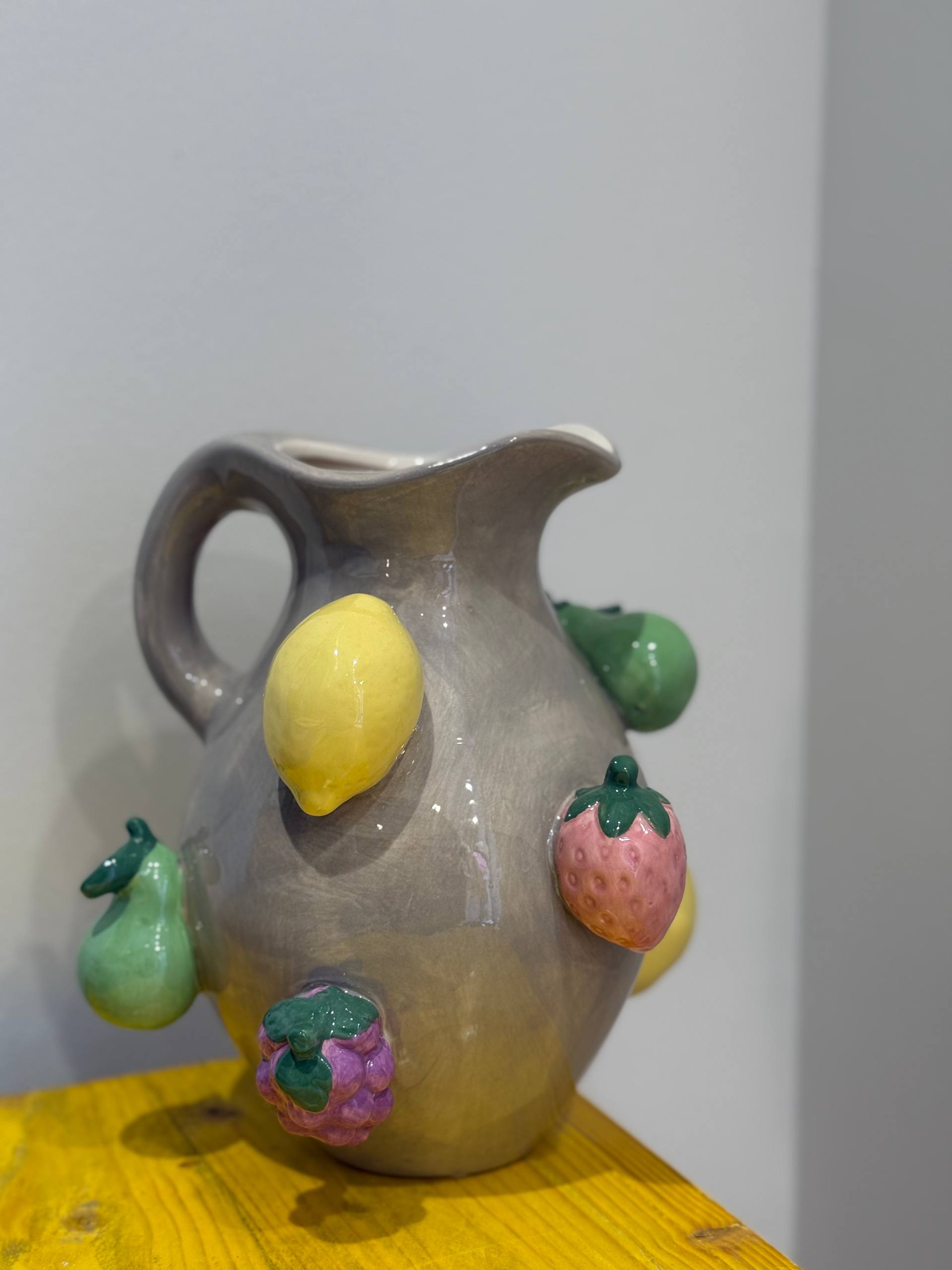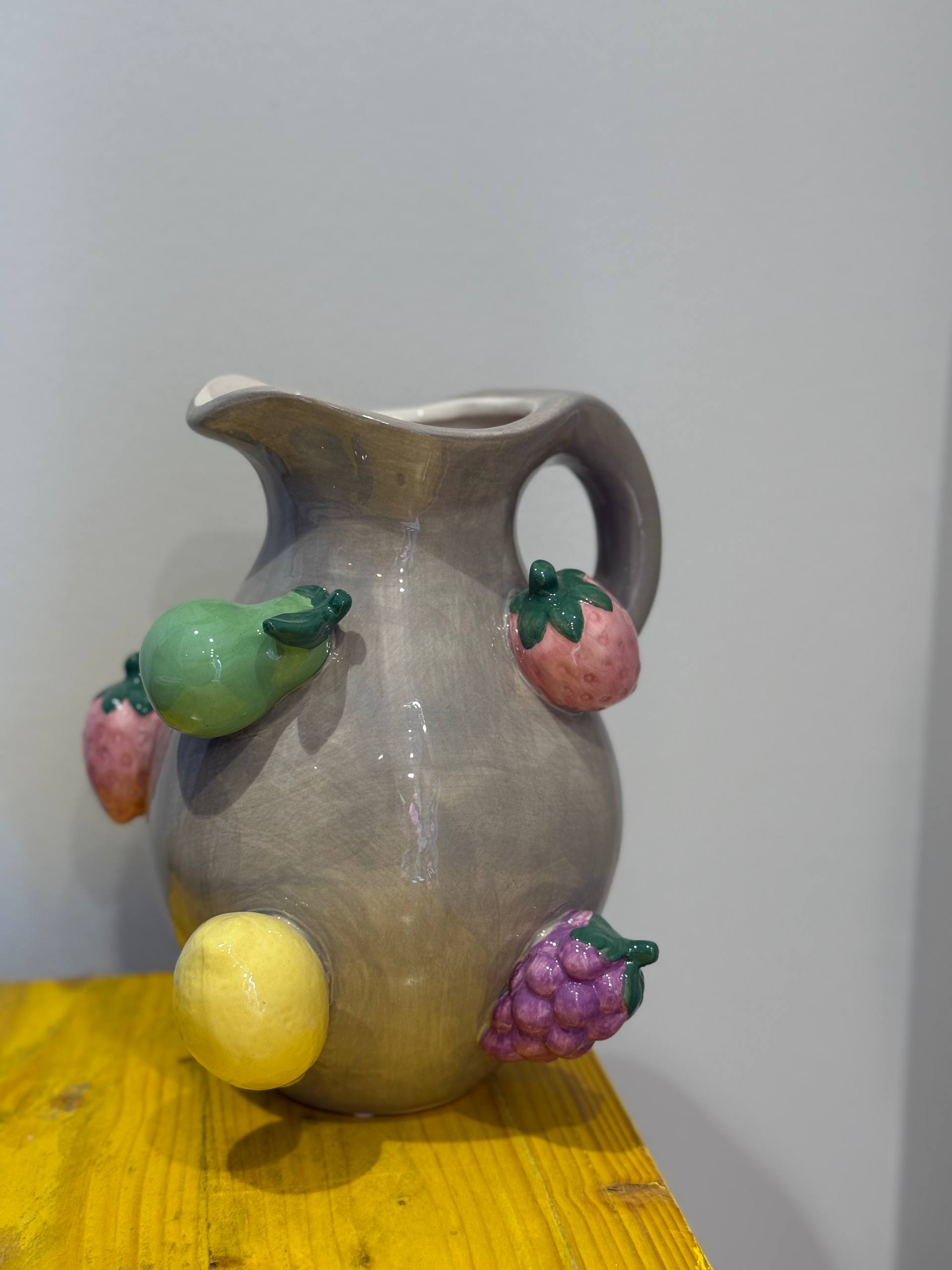 Brocca in ceramica con frutti in rilievo dipinti a mano. La brocca è adatta quasi a tutto. Acqua per pranzo, succo per il brunch o buon vino per cena, oppure puoi sistemarci dentro i tuoi fiori preferiti e usarla come vaso.