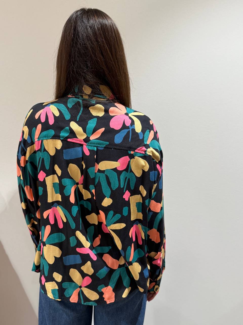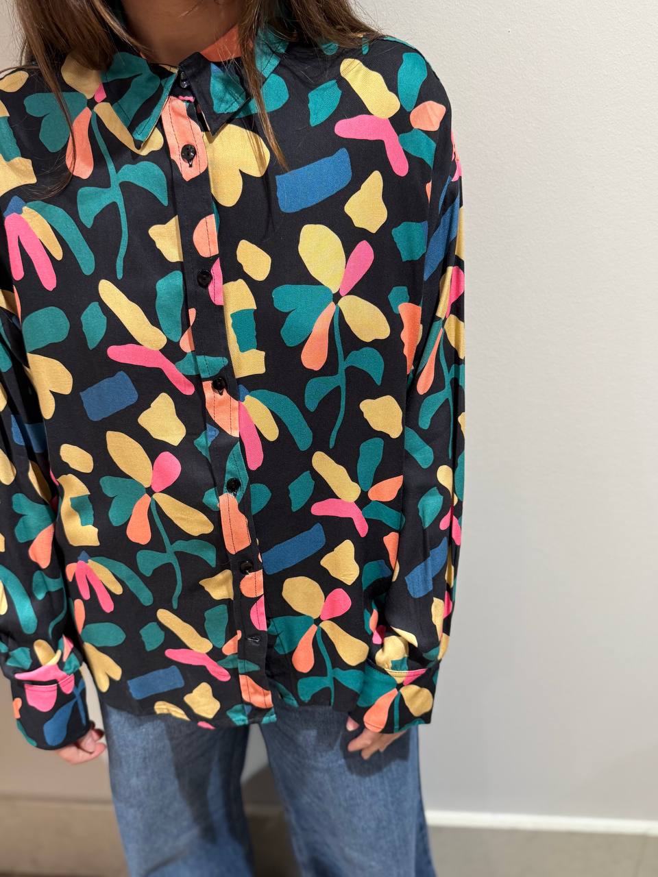 Camicia a fantasia floreale. Vestibilità morbida. Giorgia indossa la taglia S ed è alta 1.65.