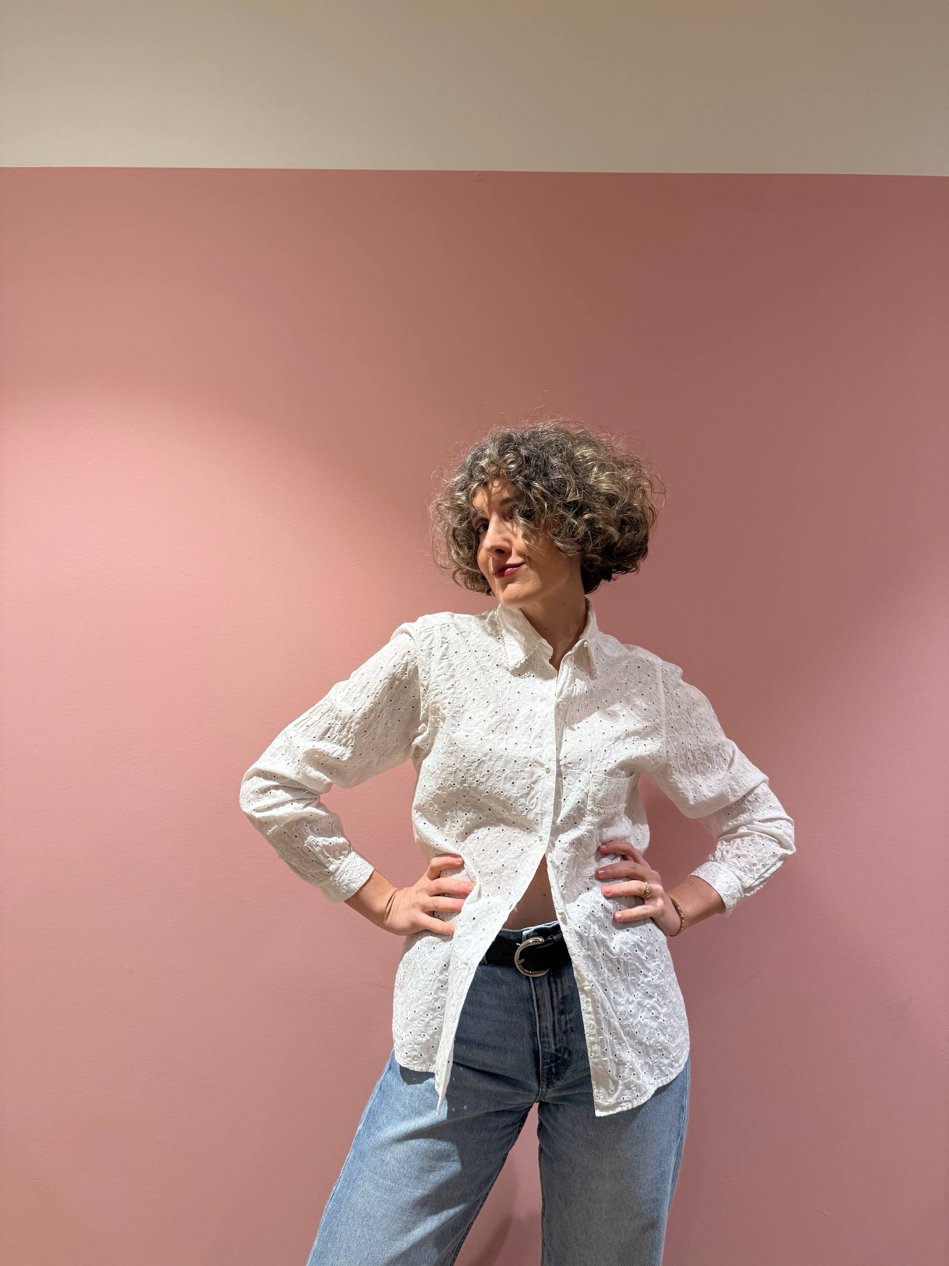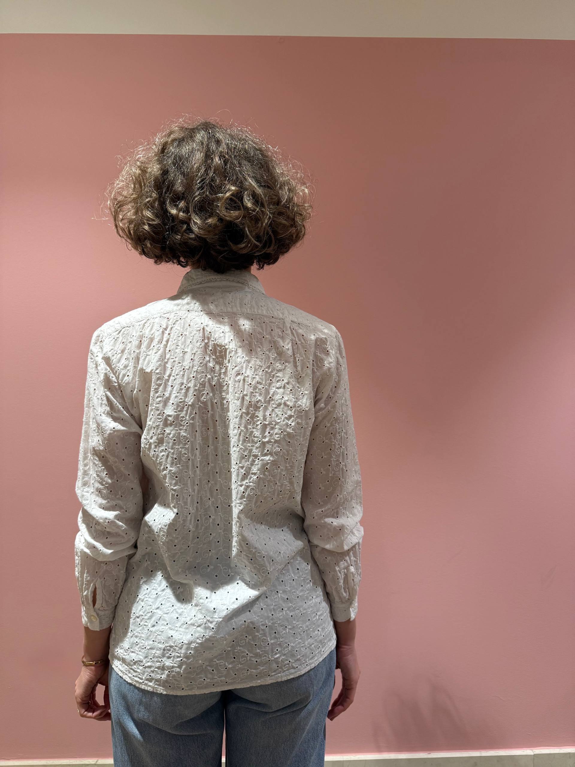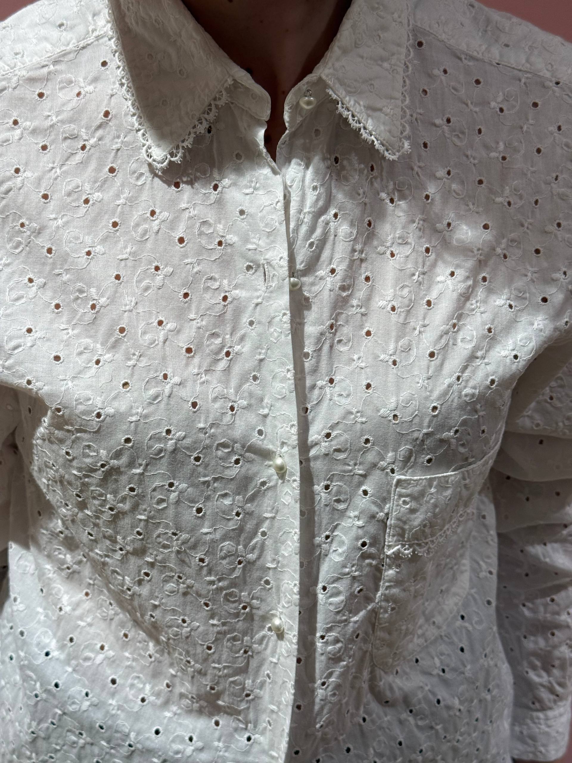 Camicia bianca in pizzo sangallo con dettagli bottoni perlati.