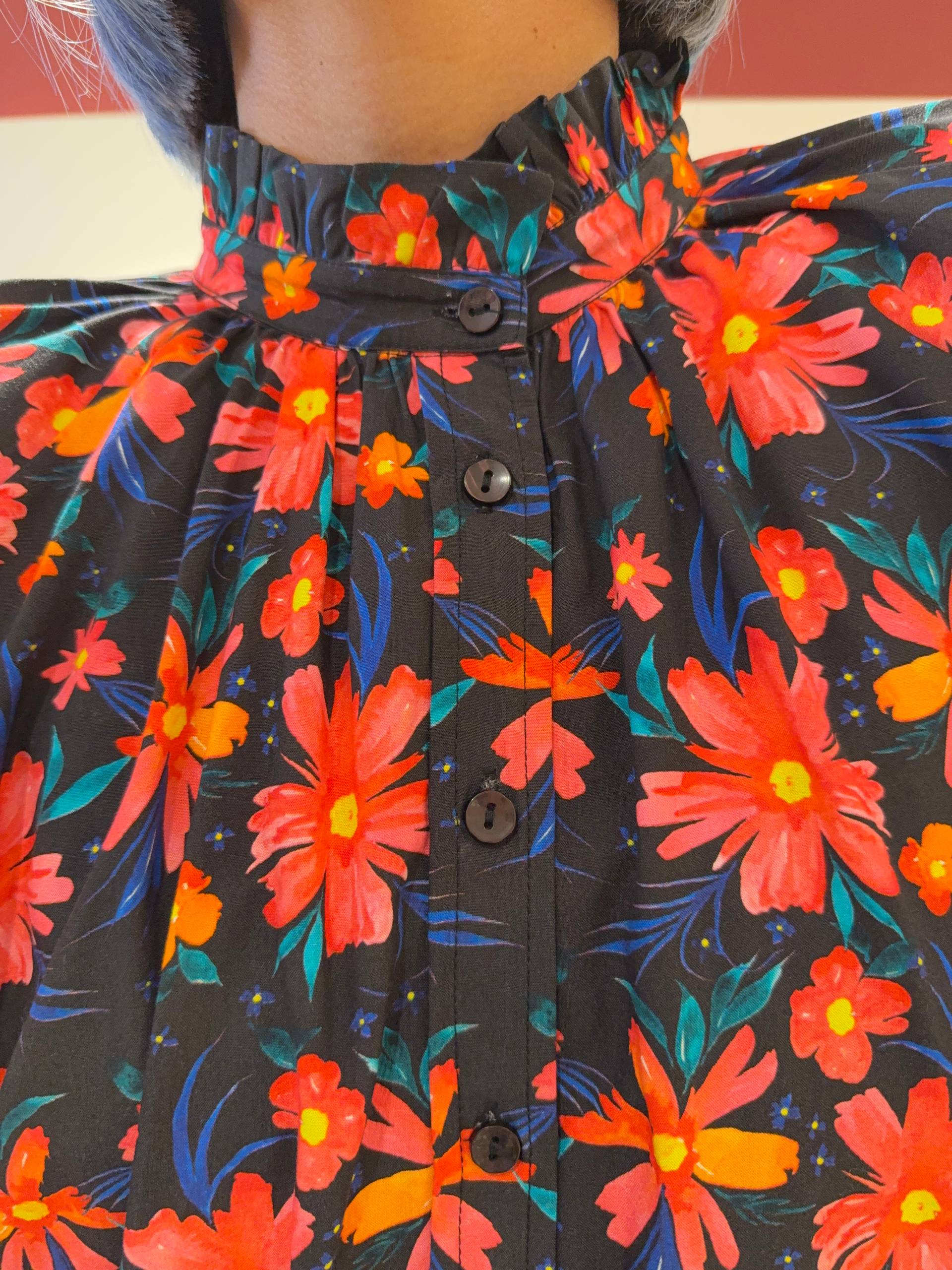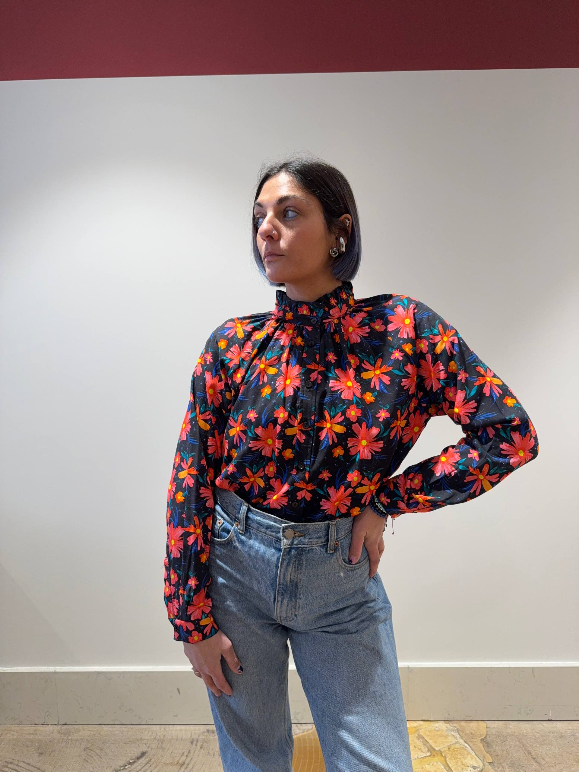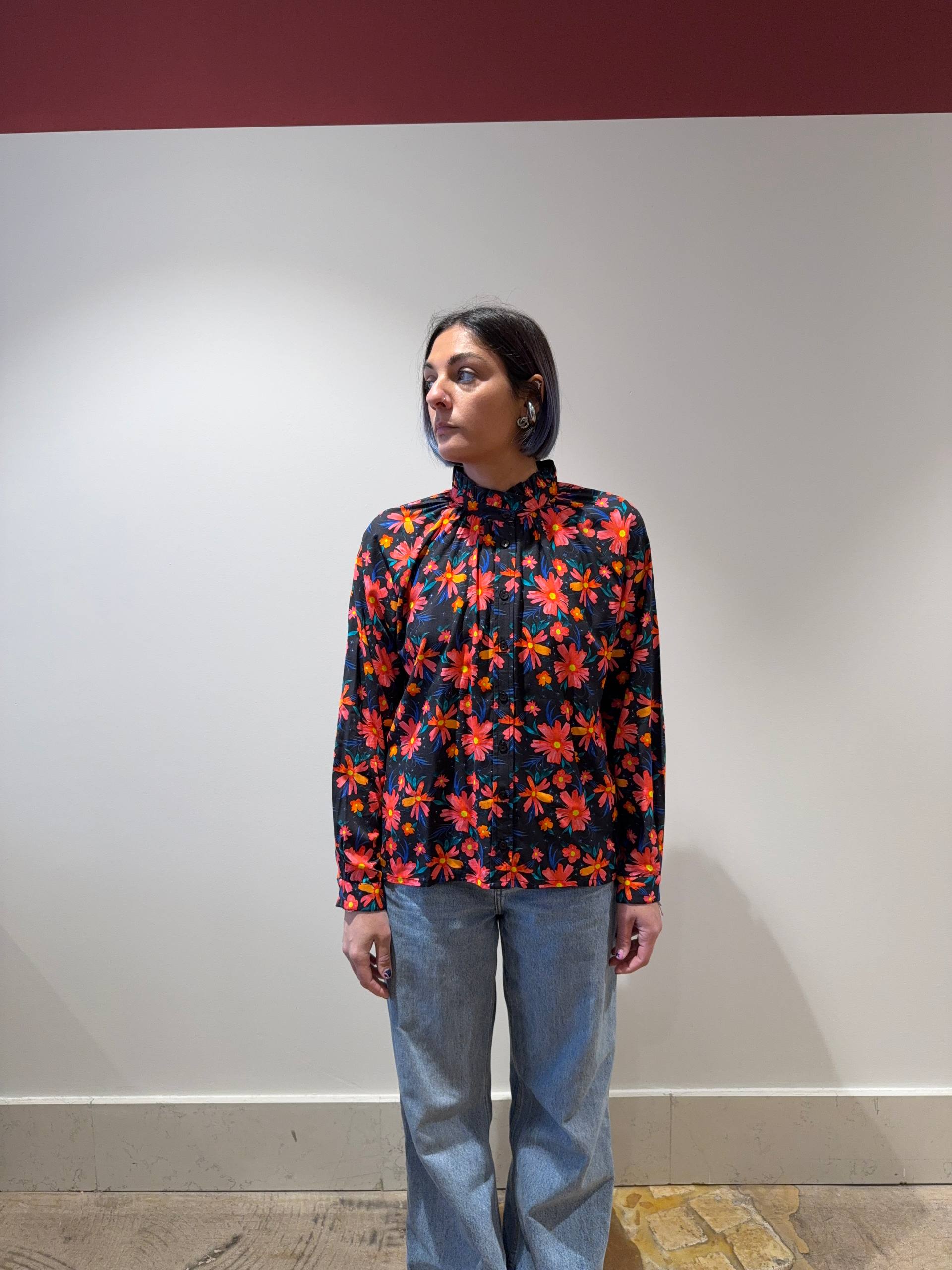 Camicia floreale con colletto arricciato, maniche dritte con polsini quadrati.