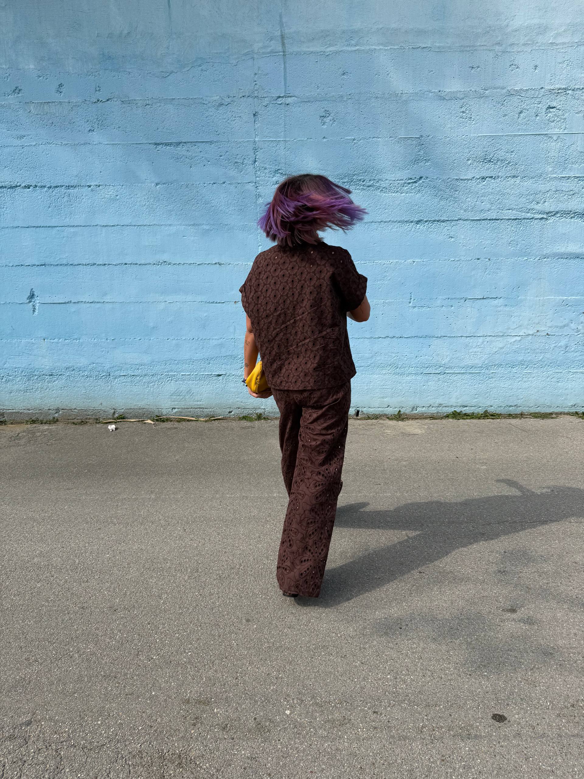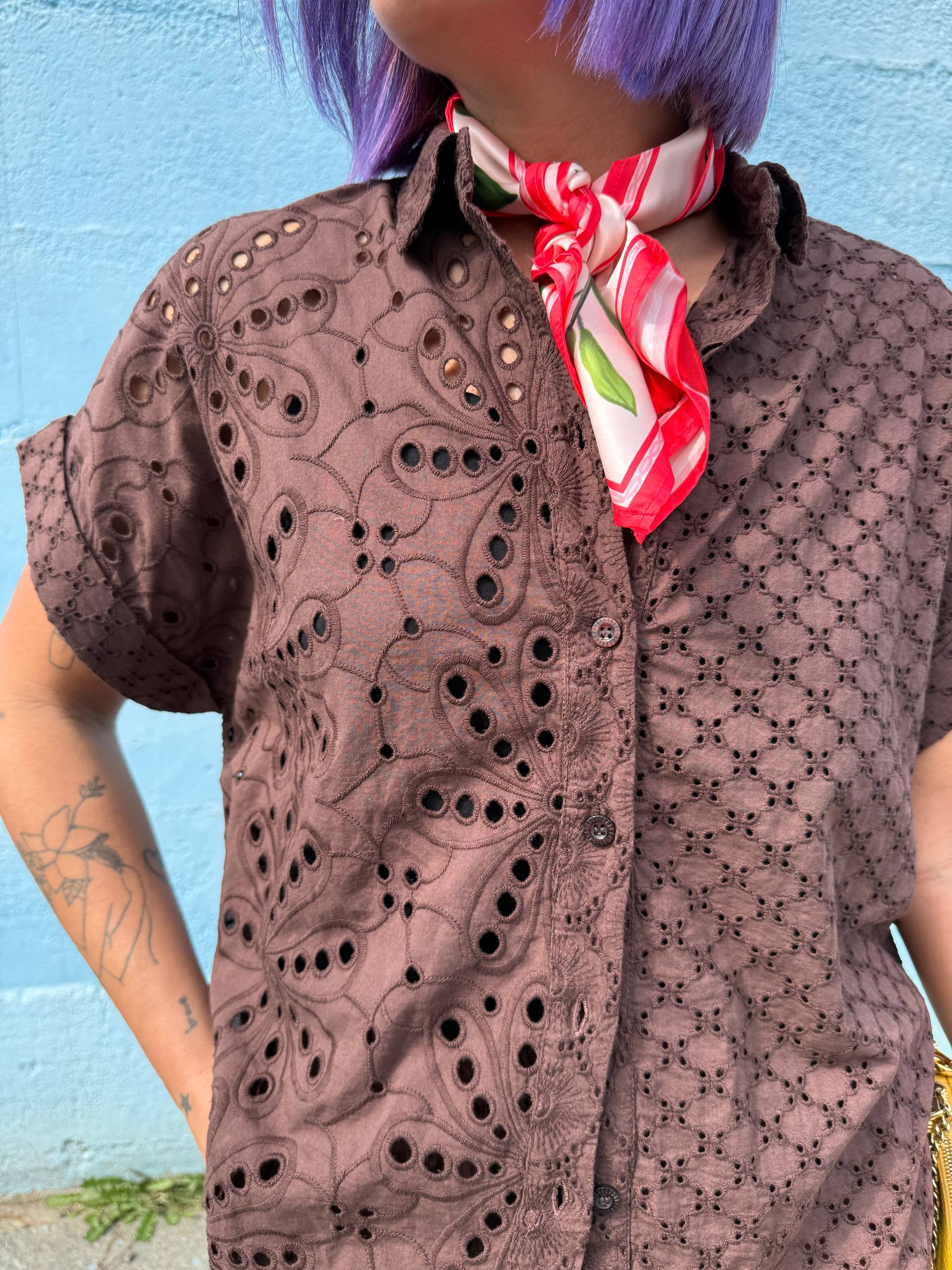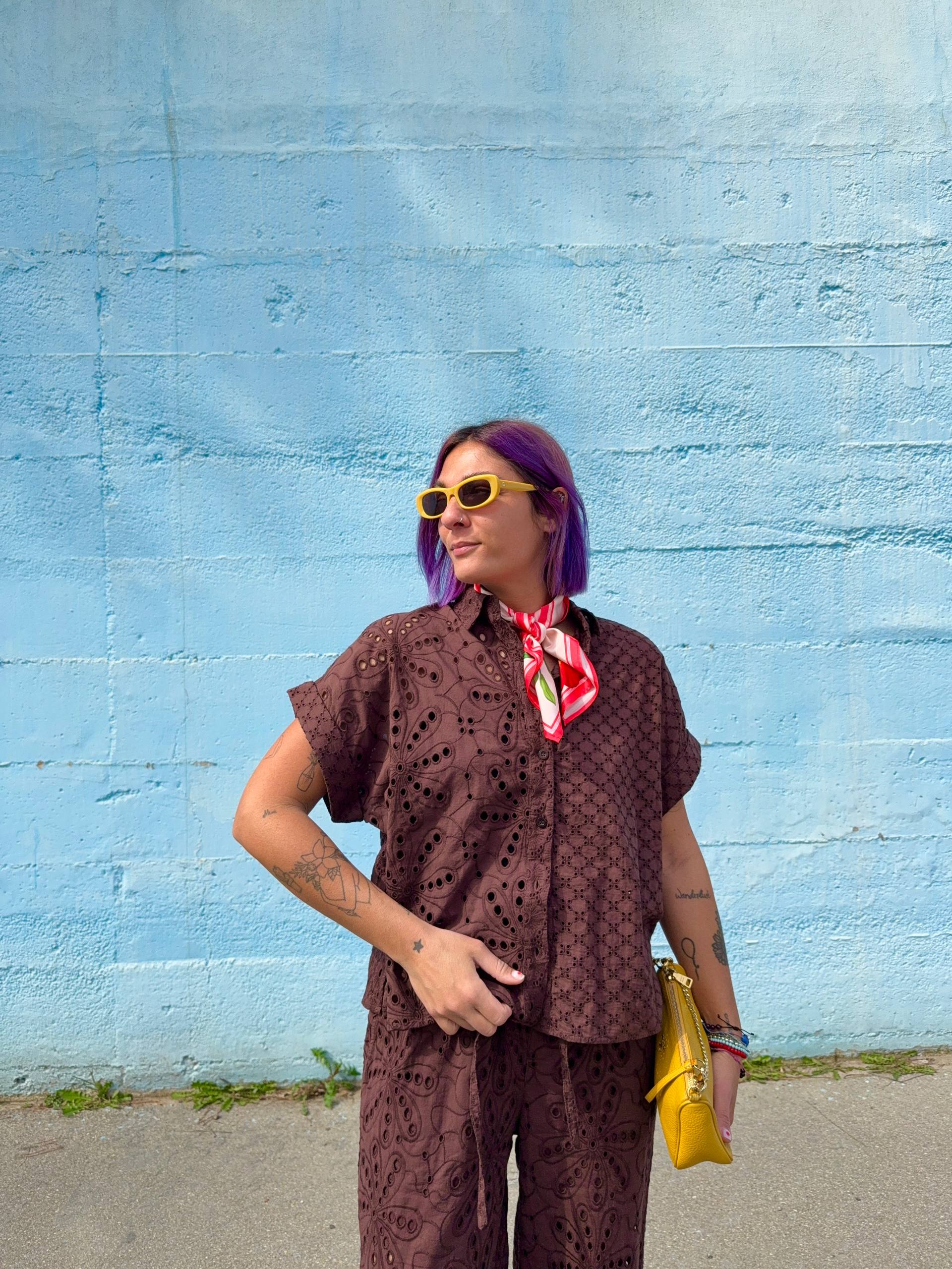 Camicia marrone in cotone in pizzo sangallo. Vestibilità over. Manica corta. Chiusura con bottoni.