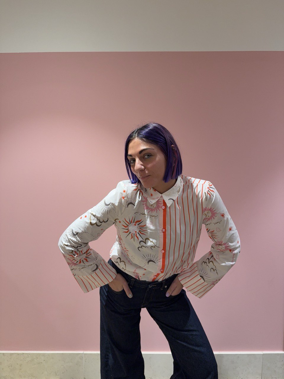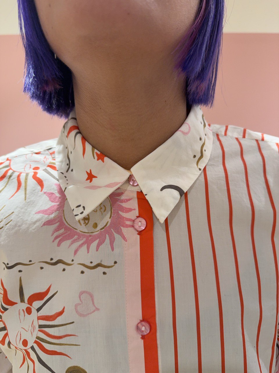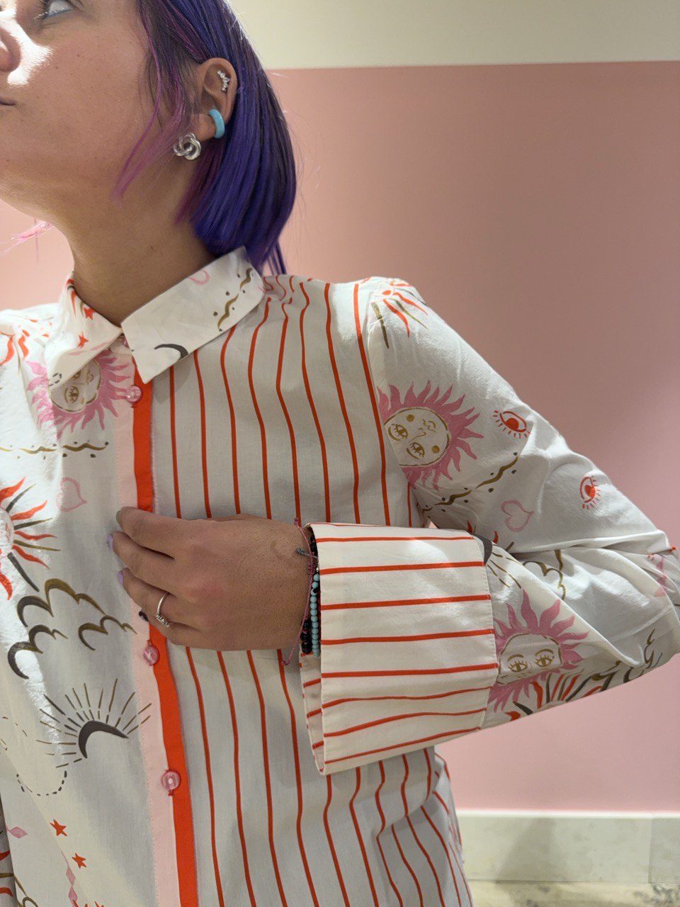 Camicia color pantone cloud dancer in fantasia astro sui toni del rosa, rosso e cachi, in cotone con bottoni rosa e manica larga. Vestibilità morbida.