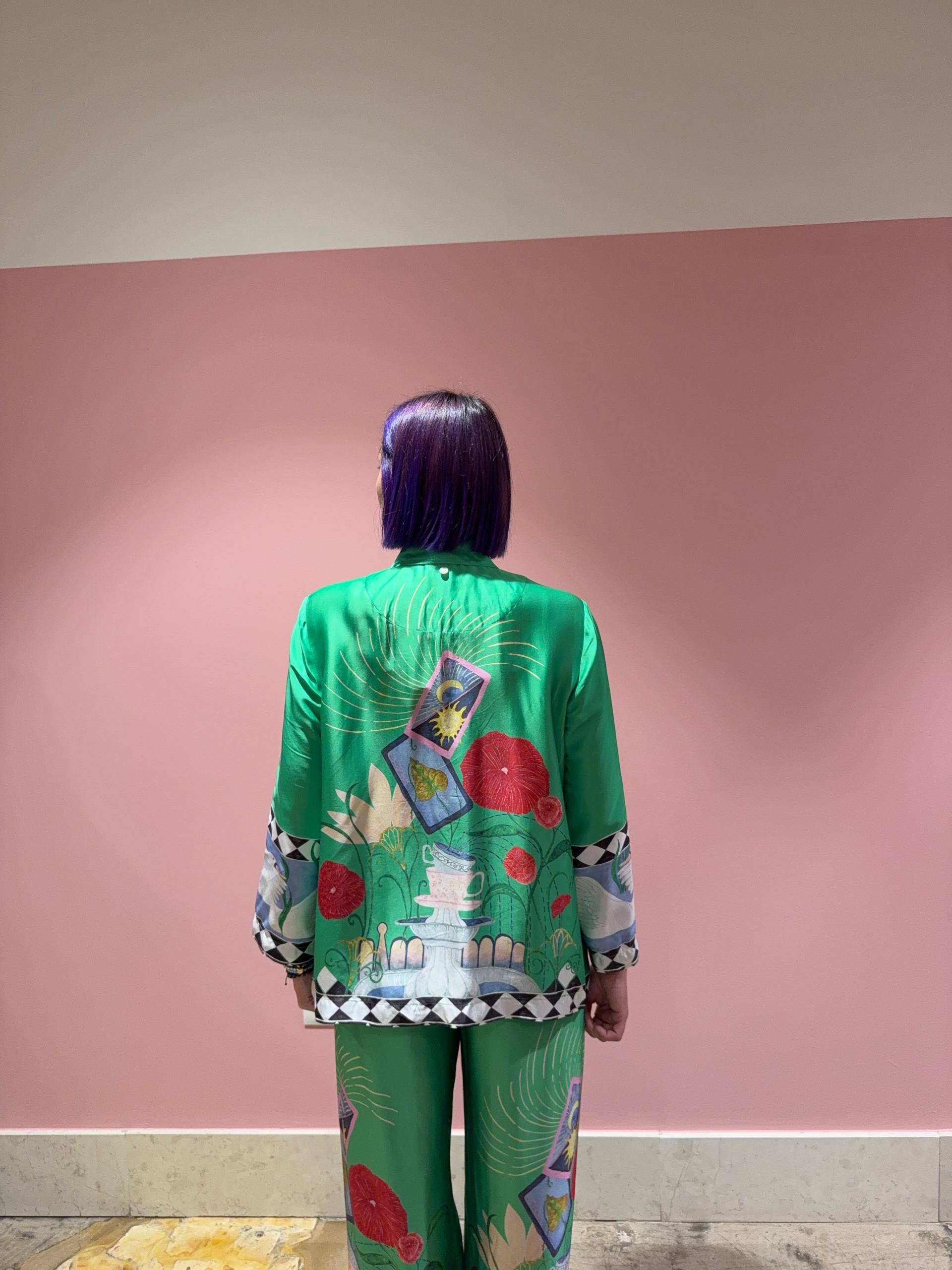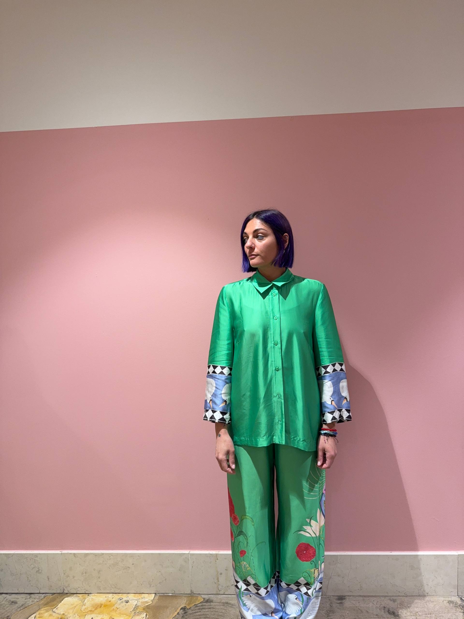 Camicia verde con disegno sul retro e sulle maniche. Vestibilità morbida. Isabella indossa la S e veste una 42 ed è alta 1.68.