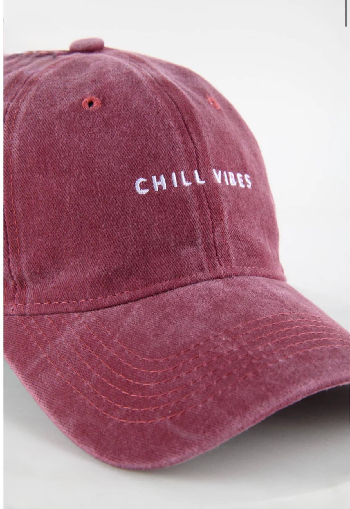 Cappello bordeaux con scritta ricamata “CHILL VIBES” regolabile sul retro.