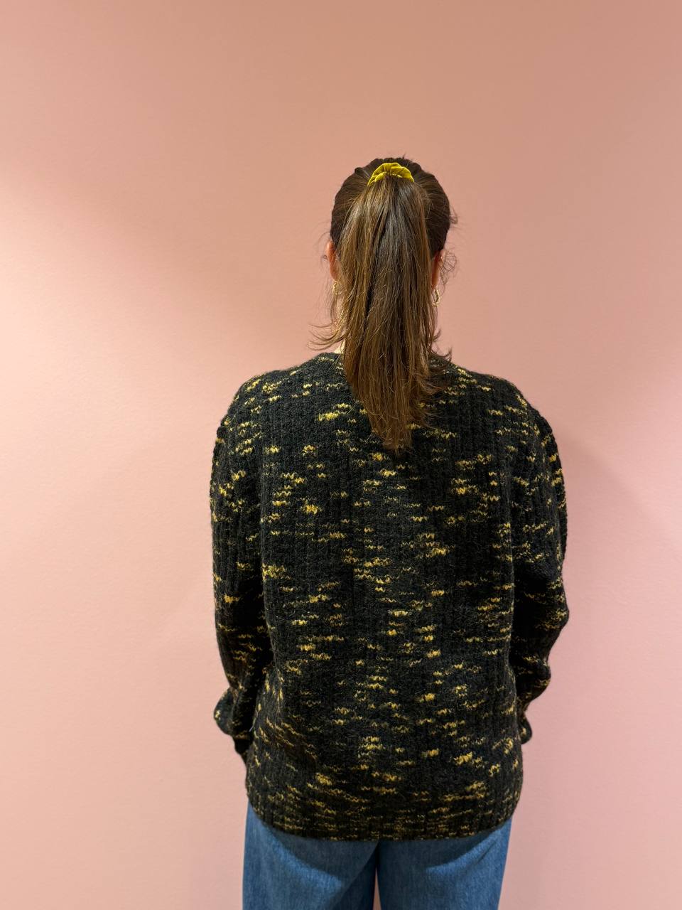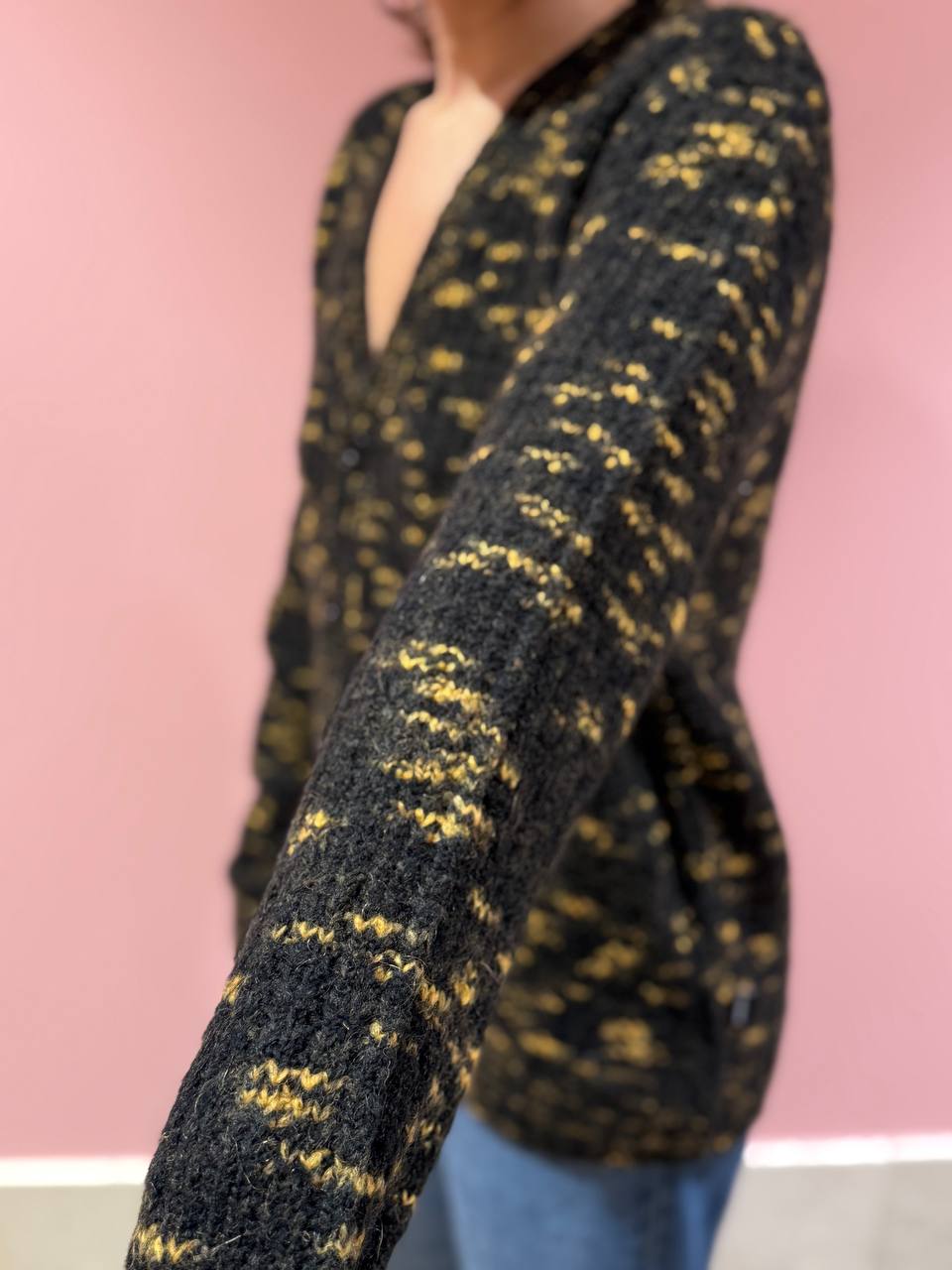Cardigan nero con macchie di colore giallo. Il cardigan veste over.