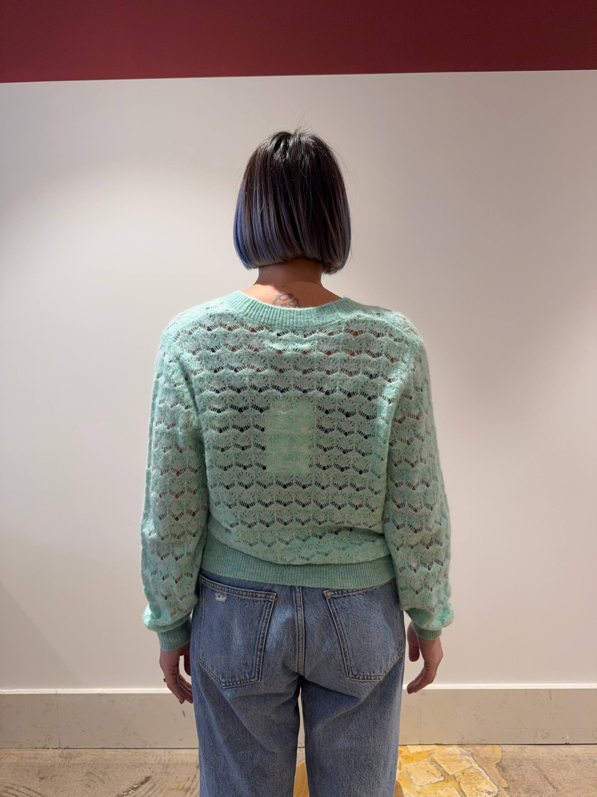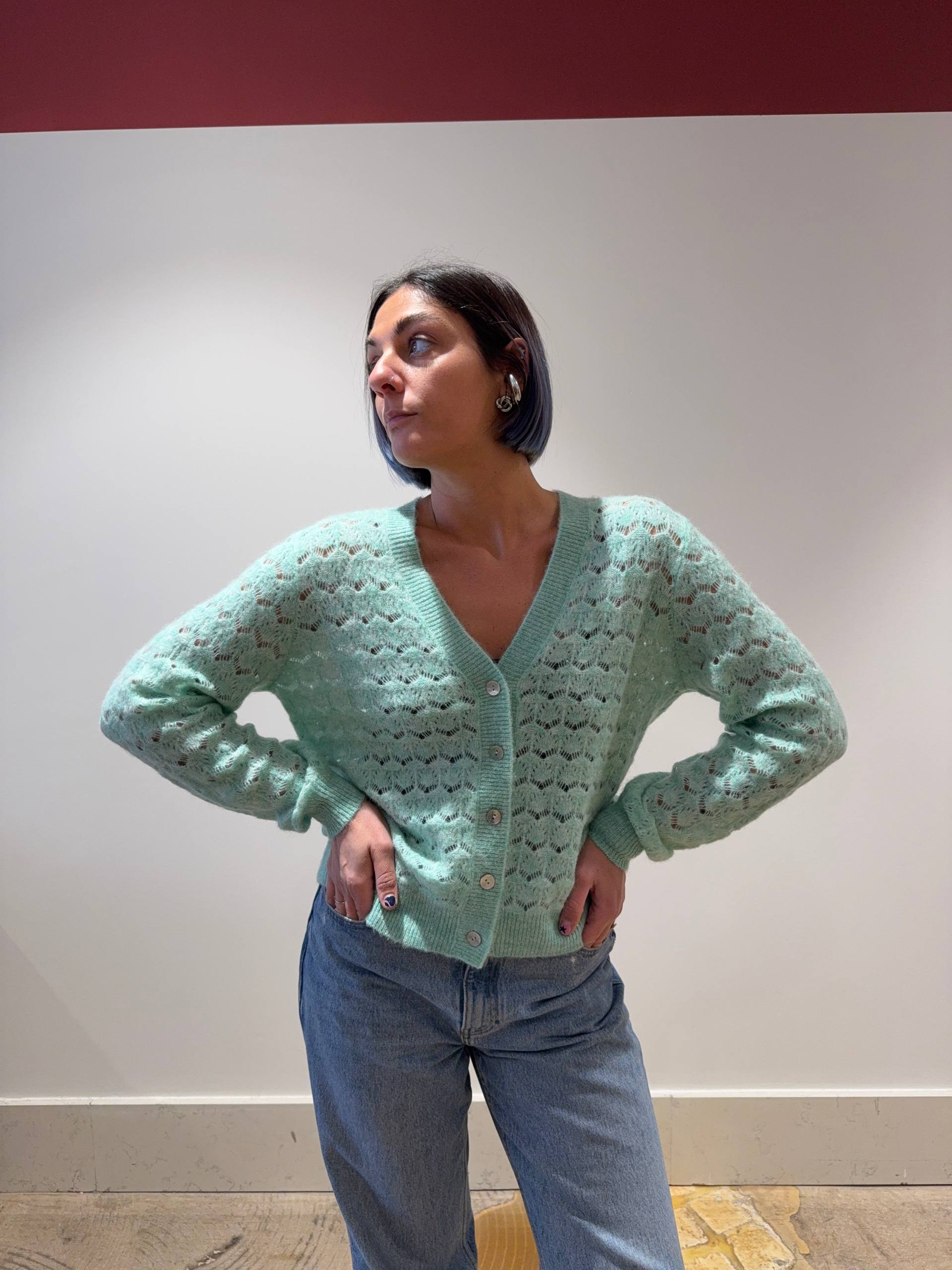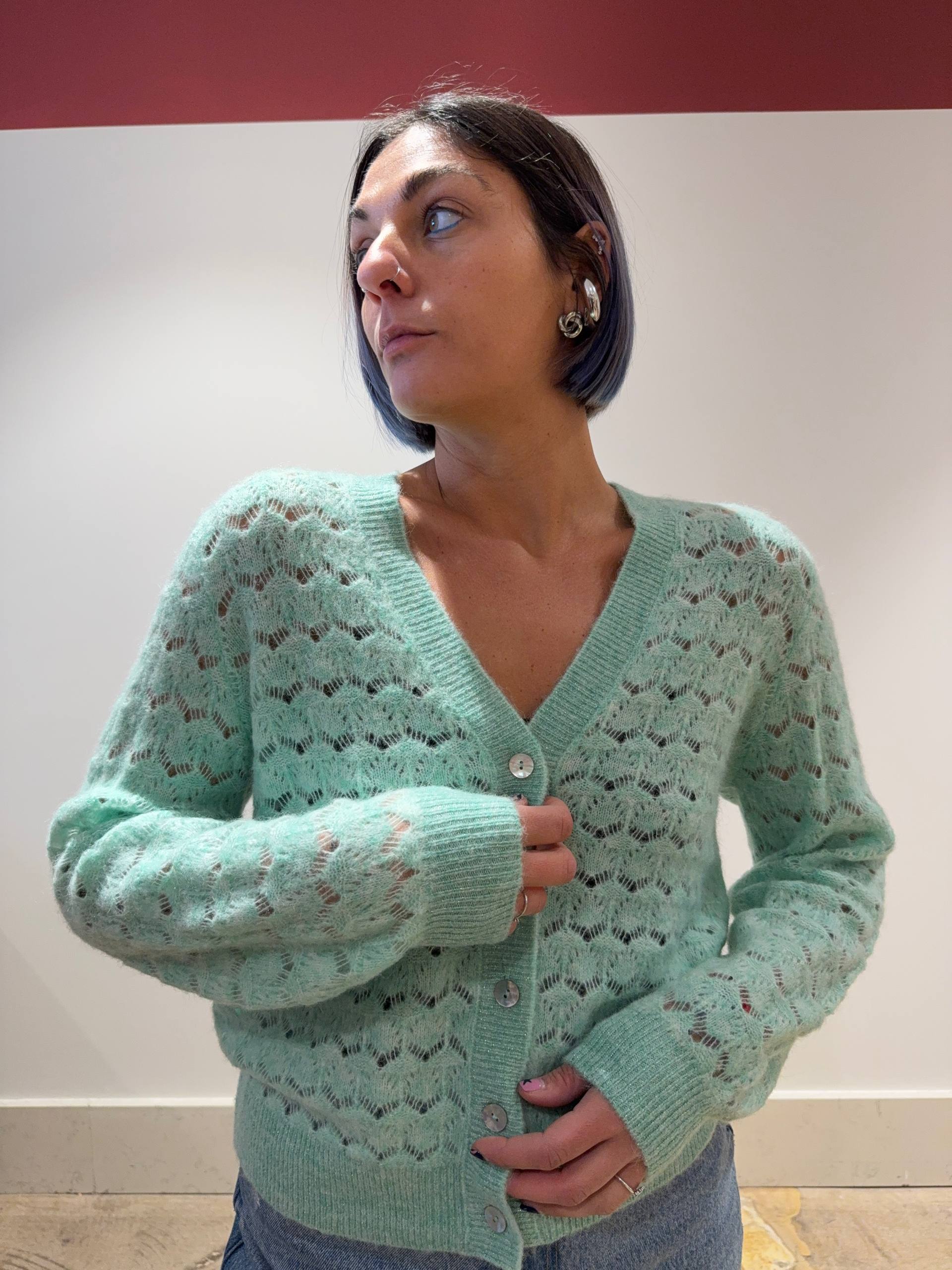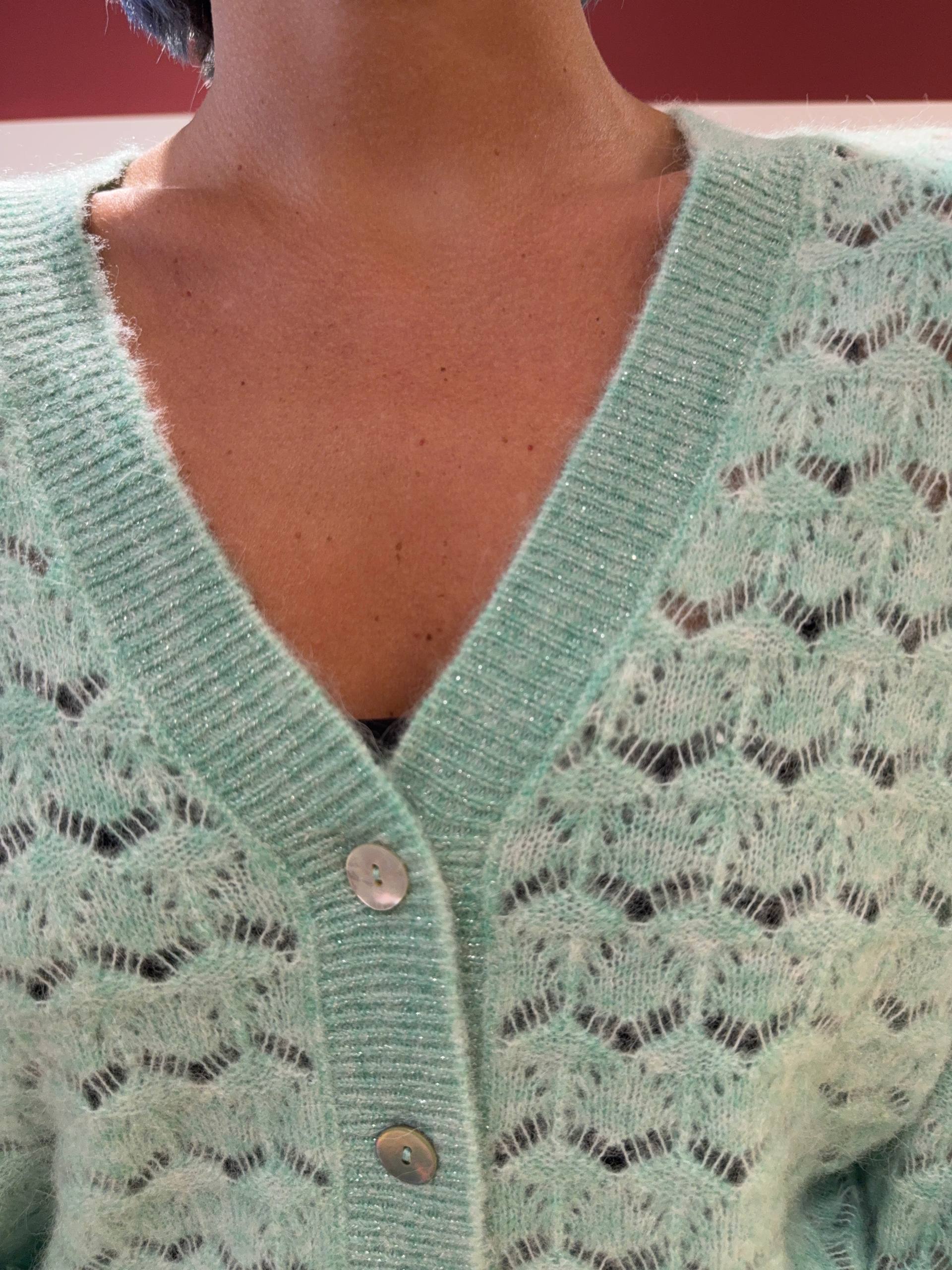 Cardigan con scollo a V e dettaglio lurex sulla scollatura. Modello traforato. Vestibilità normale.