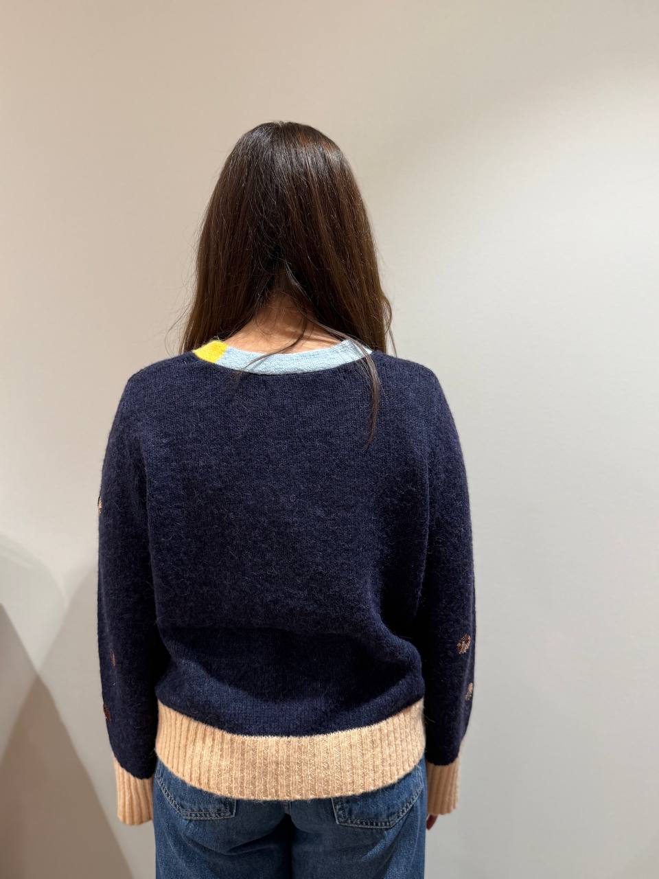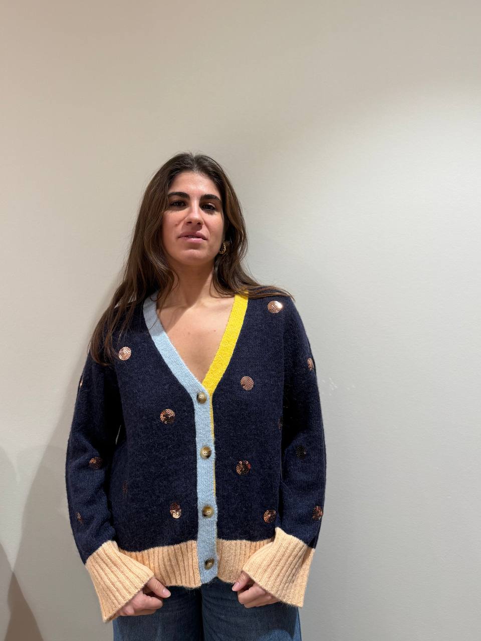 Cardigan con paillettes a forma di cerchio, scollatura a V gialla e celeste. Bordi burro.