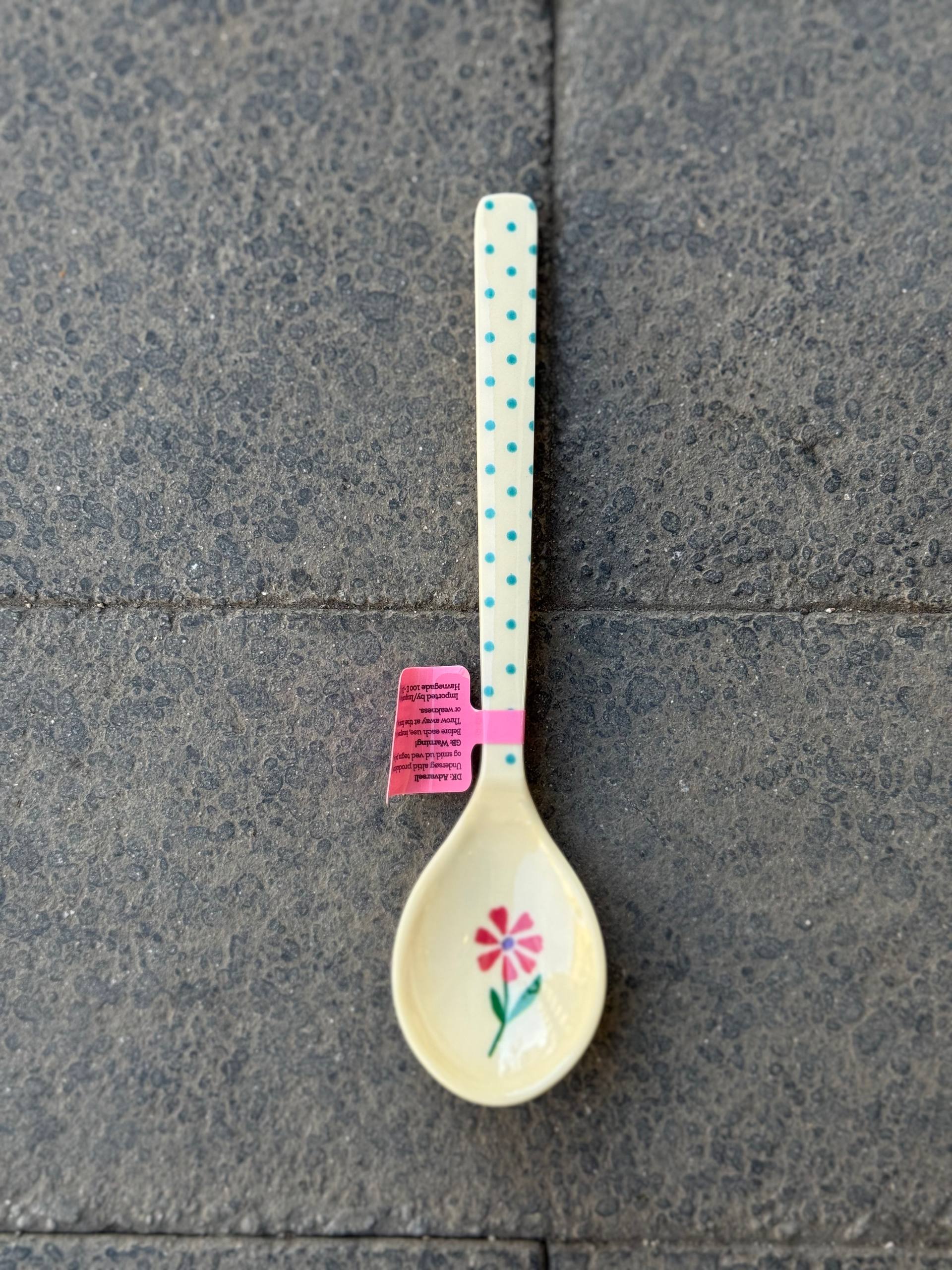 Cucchiaino in fantasia con fiore rosso e pois azzurri.