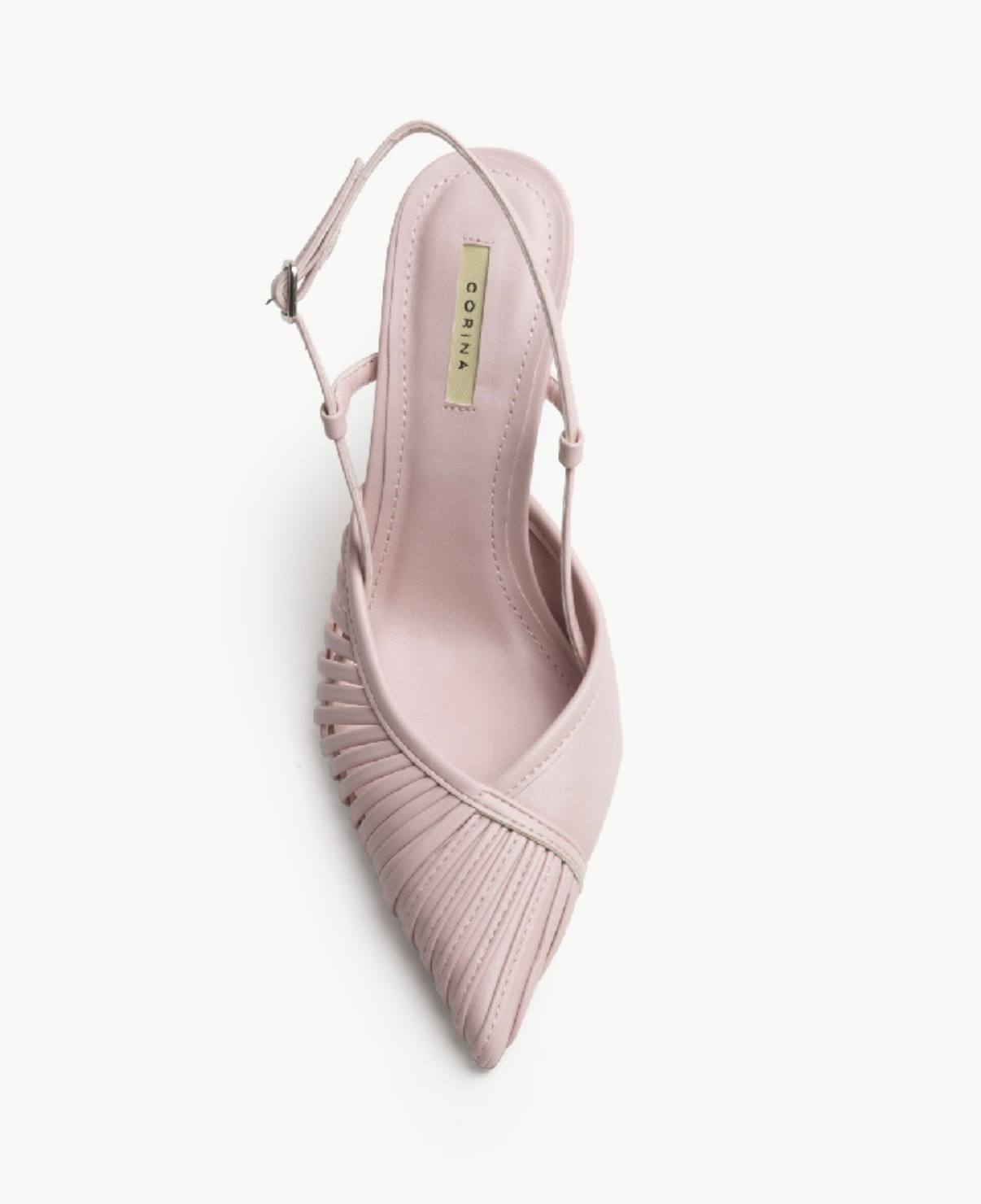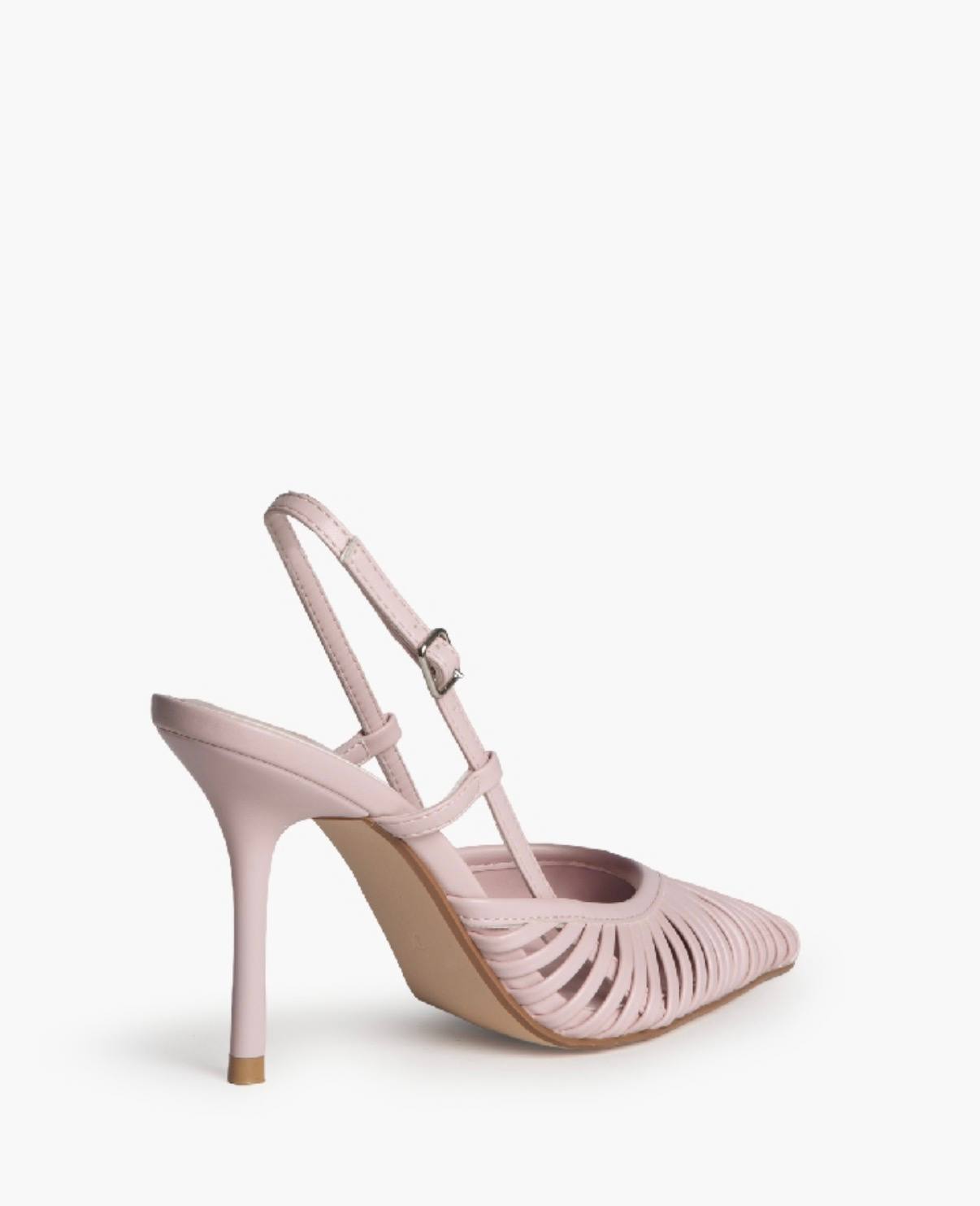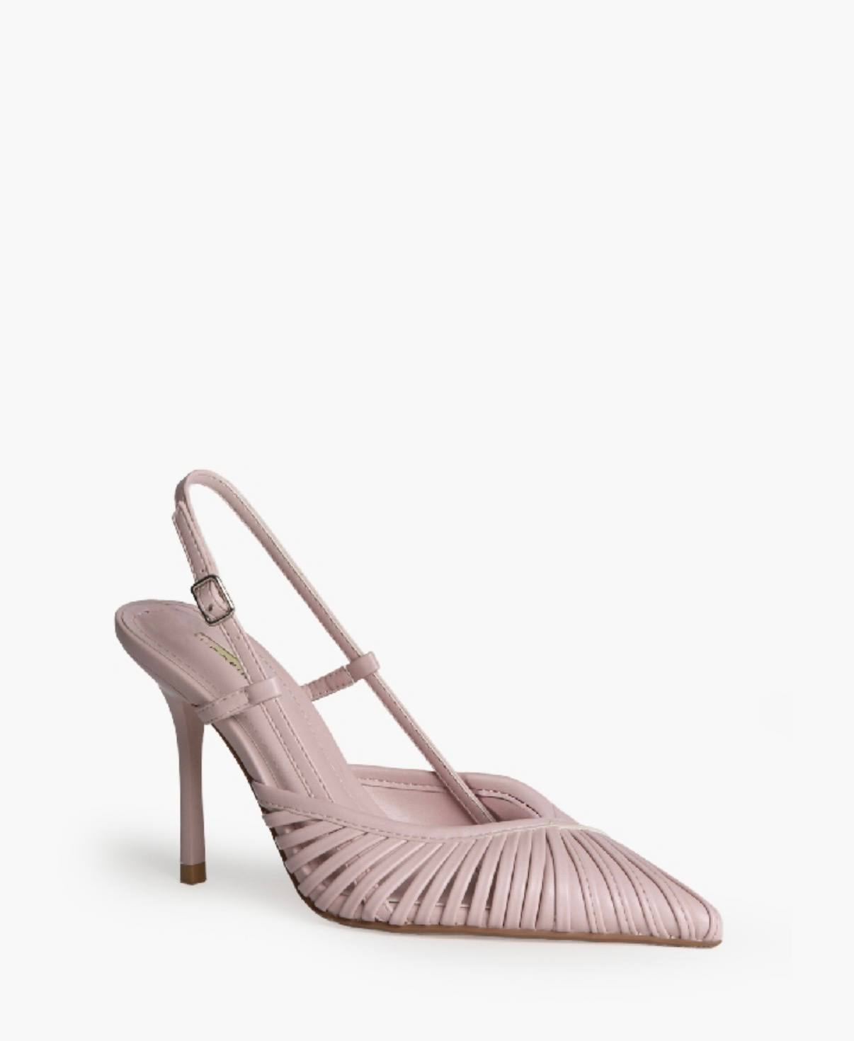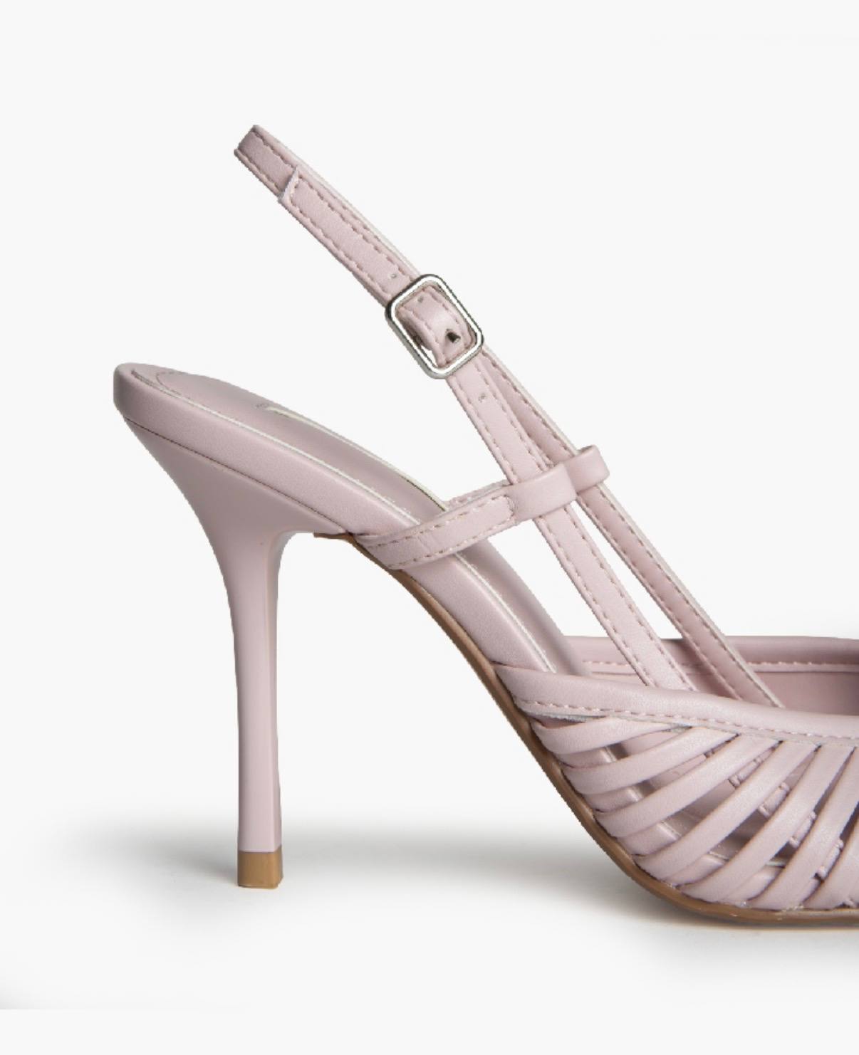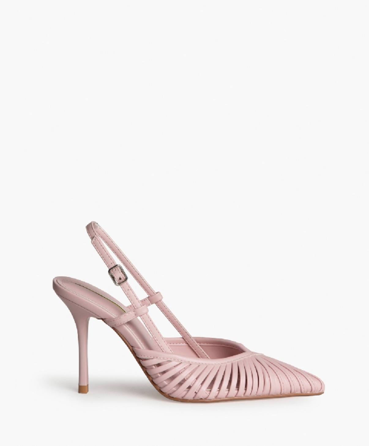 Decolleté slingback in ecopelle rosa pastello con tacco a spillo. Presenta un dettaglio di cinturino incrociato sul davanti. Chiusura con fibbia esterna. Cinturino regolabile.