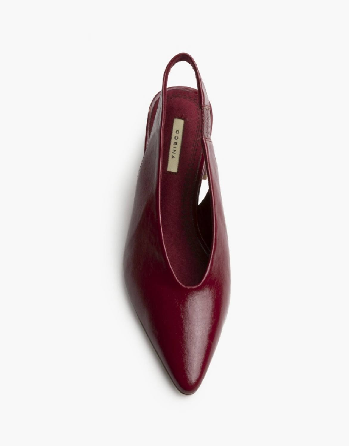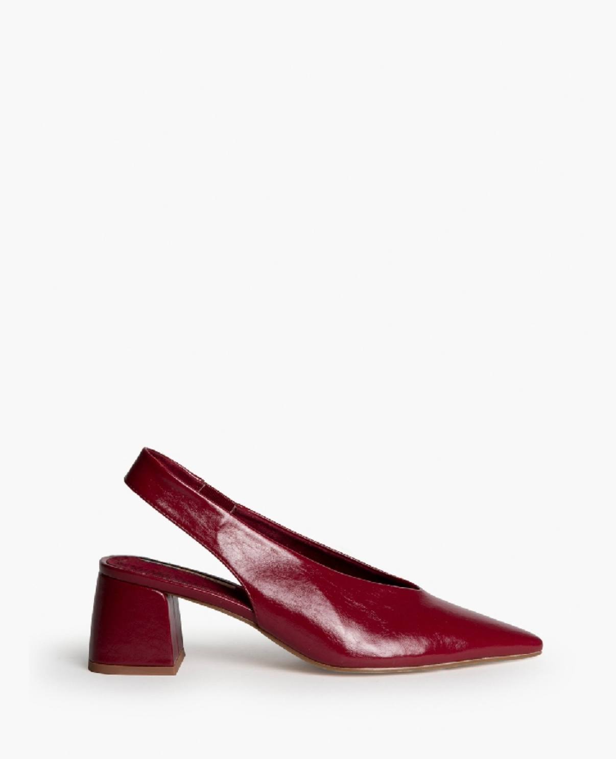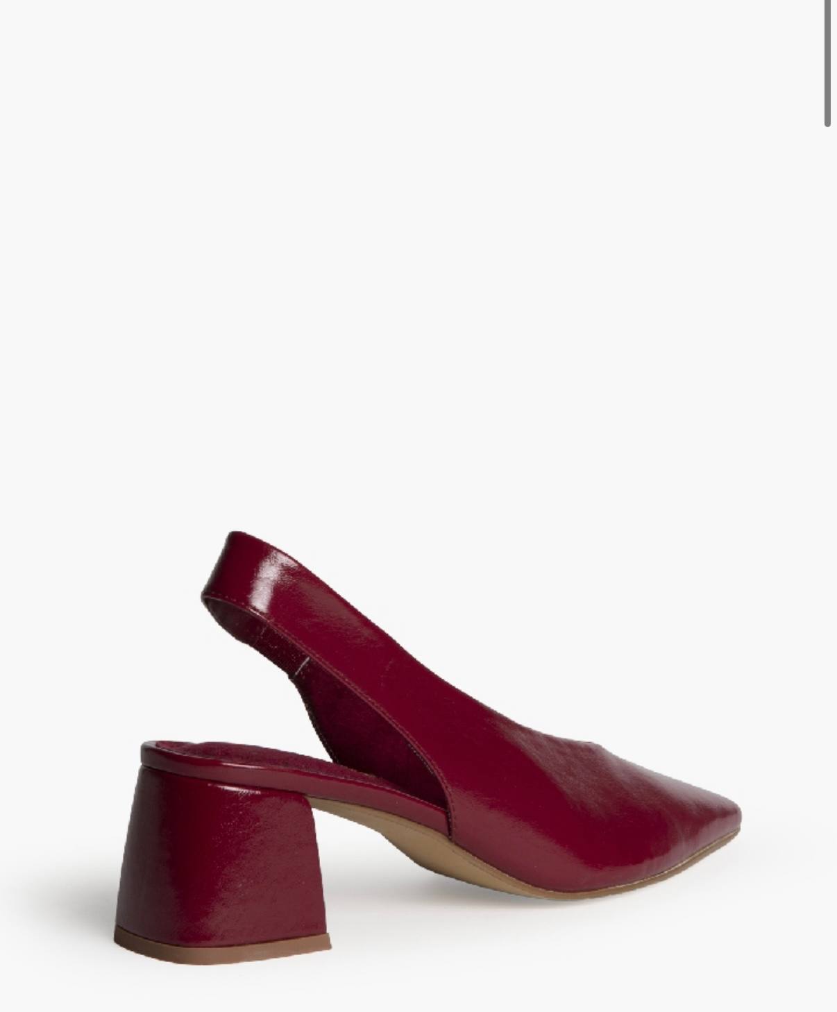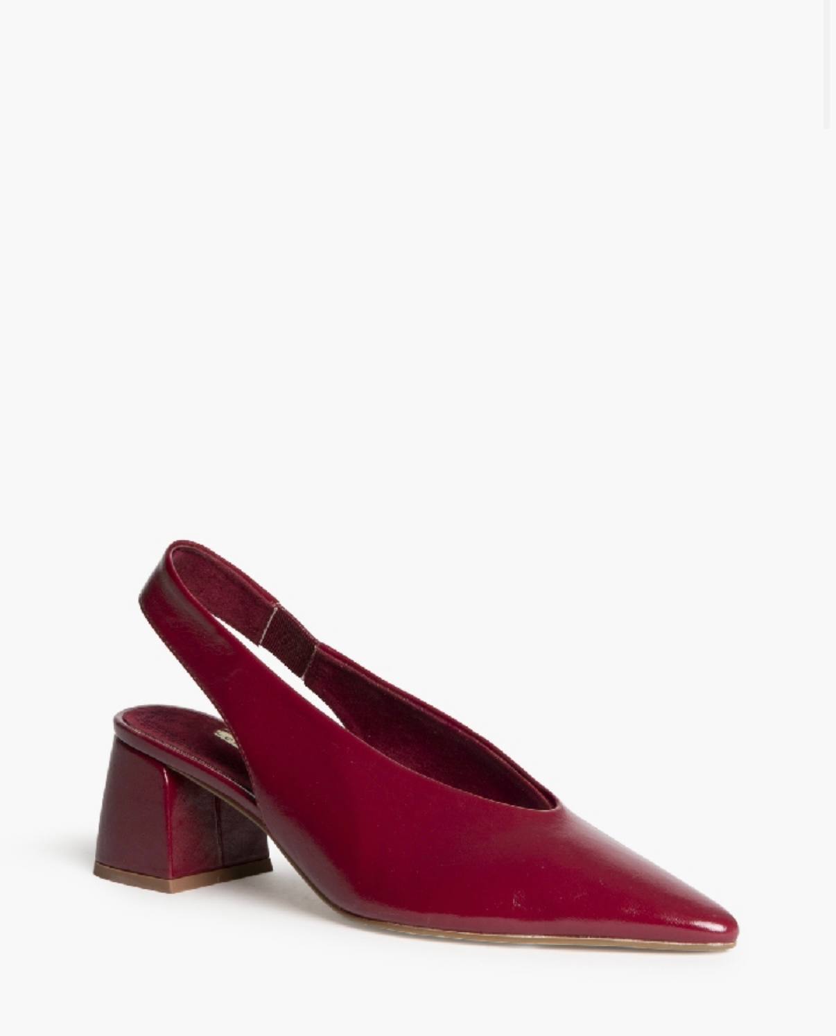 Decolleté rosso ciliegia in ecopelle aperta sul tallone. Chiusura con elastico non regolabile. Tacco 5 cm.  Modello a punta.