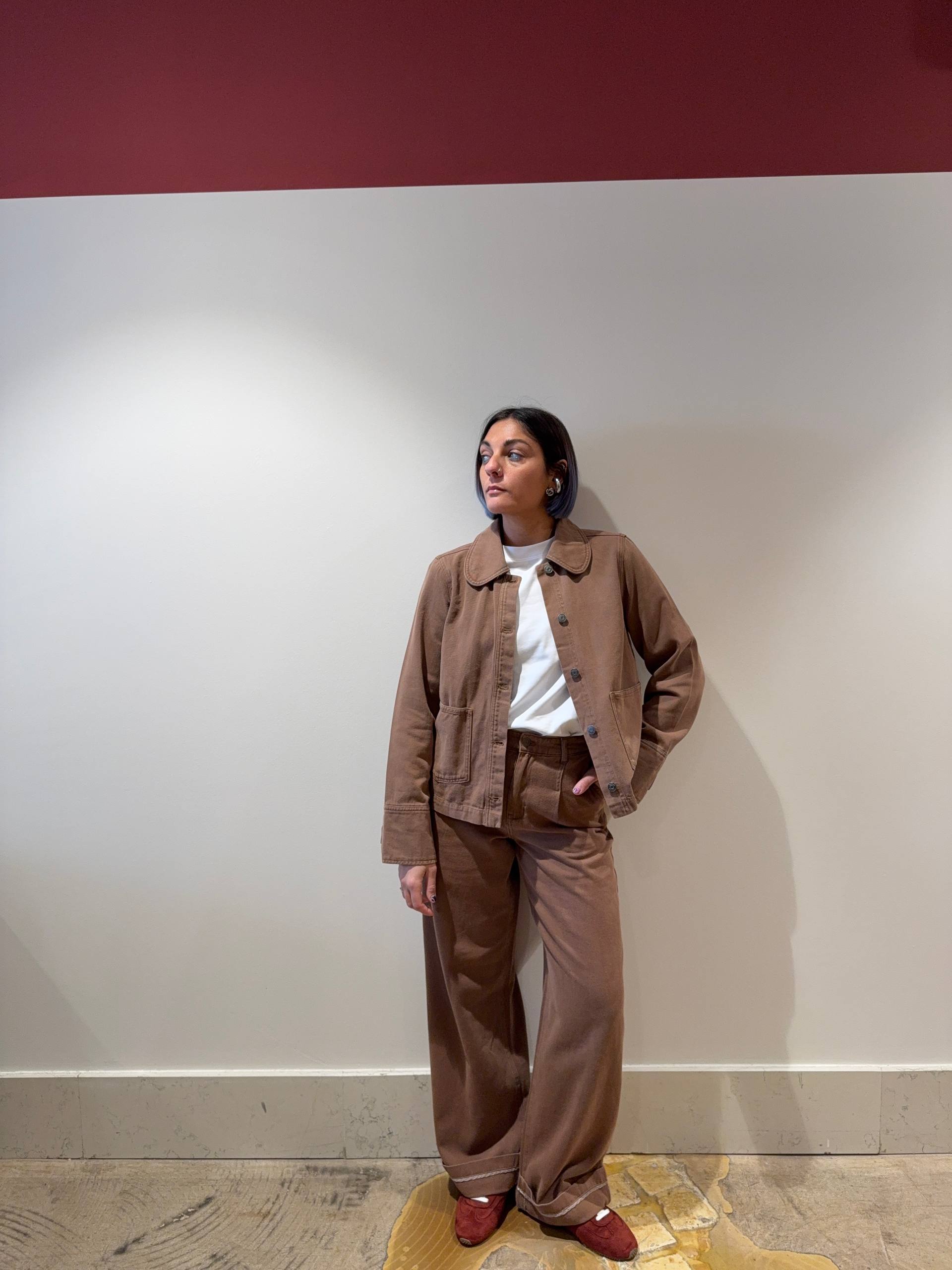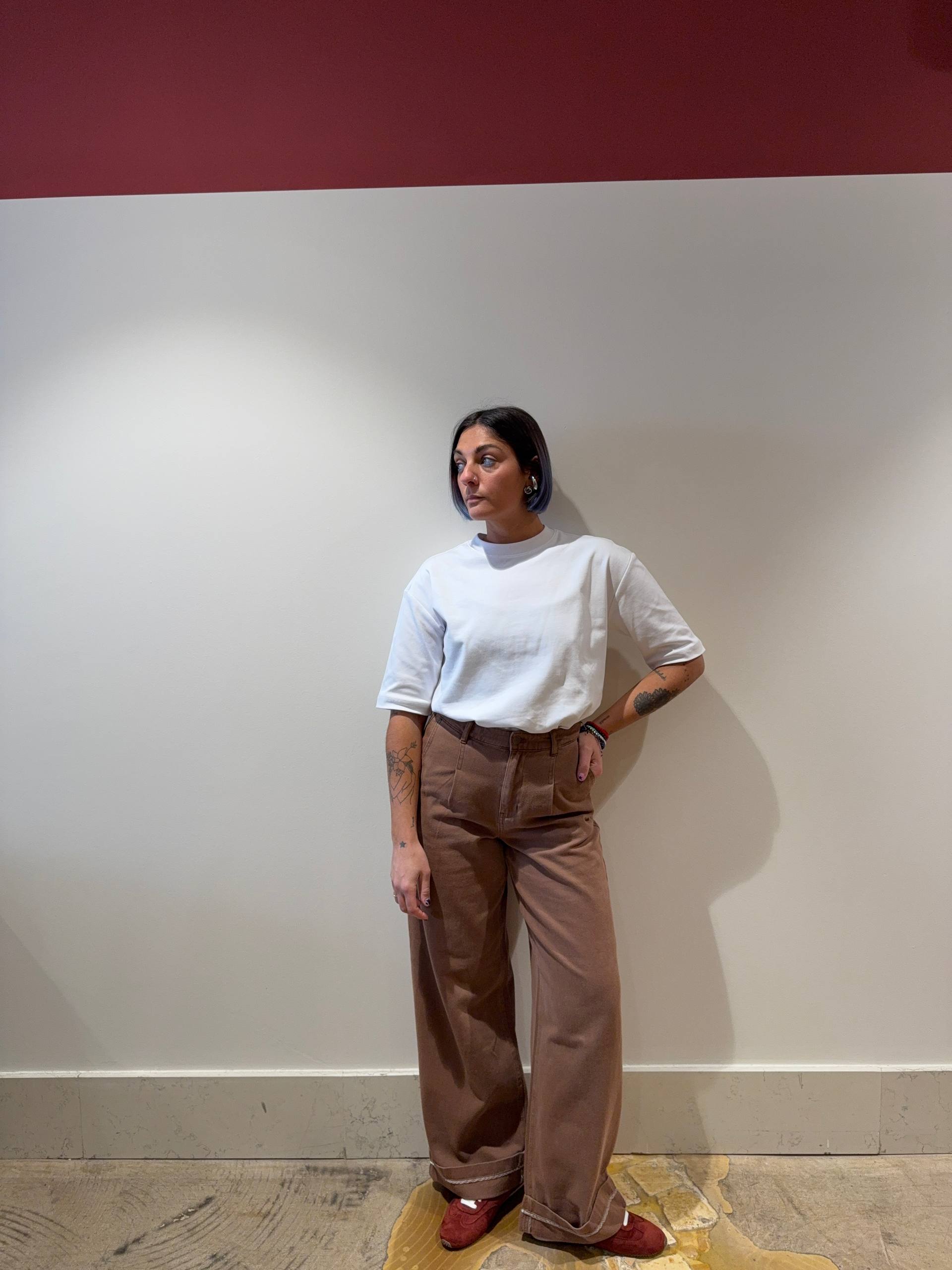 Denim largo vita alta con pinces avanti. Piega alta sull’orlo. Gamba larga e dritta.