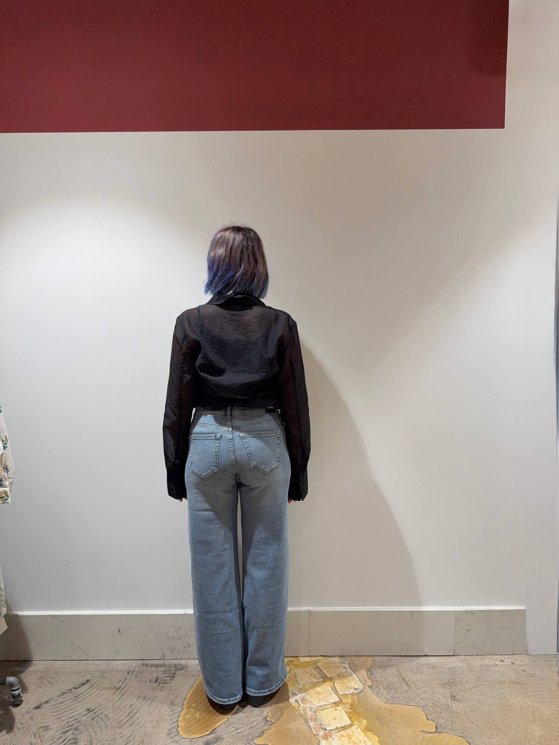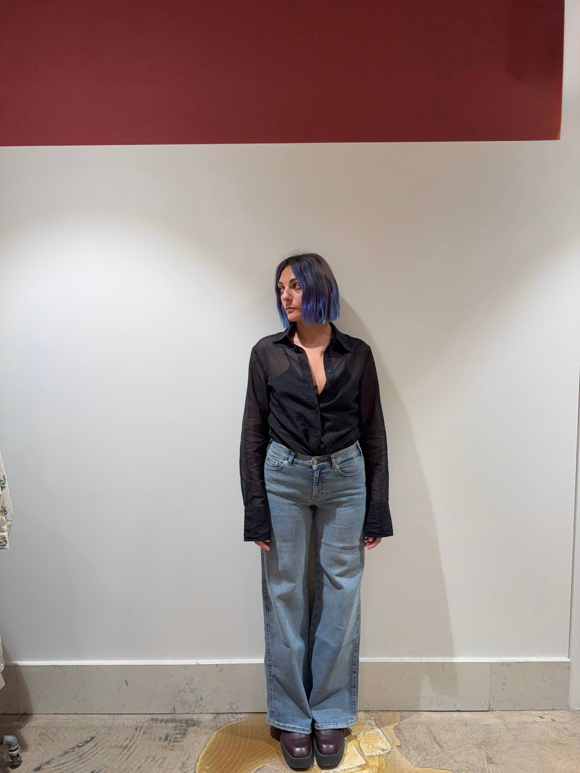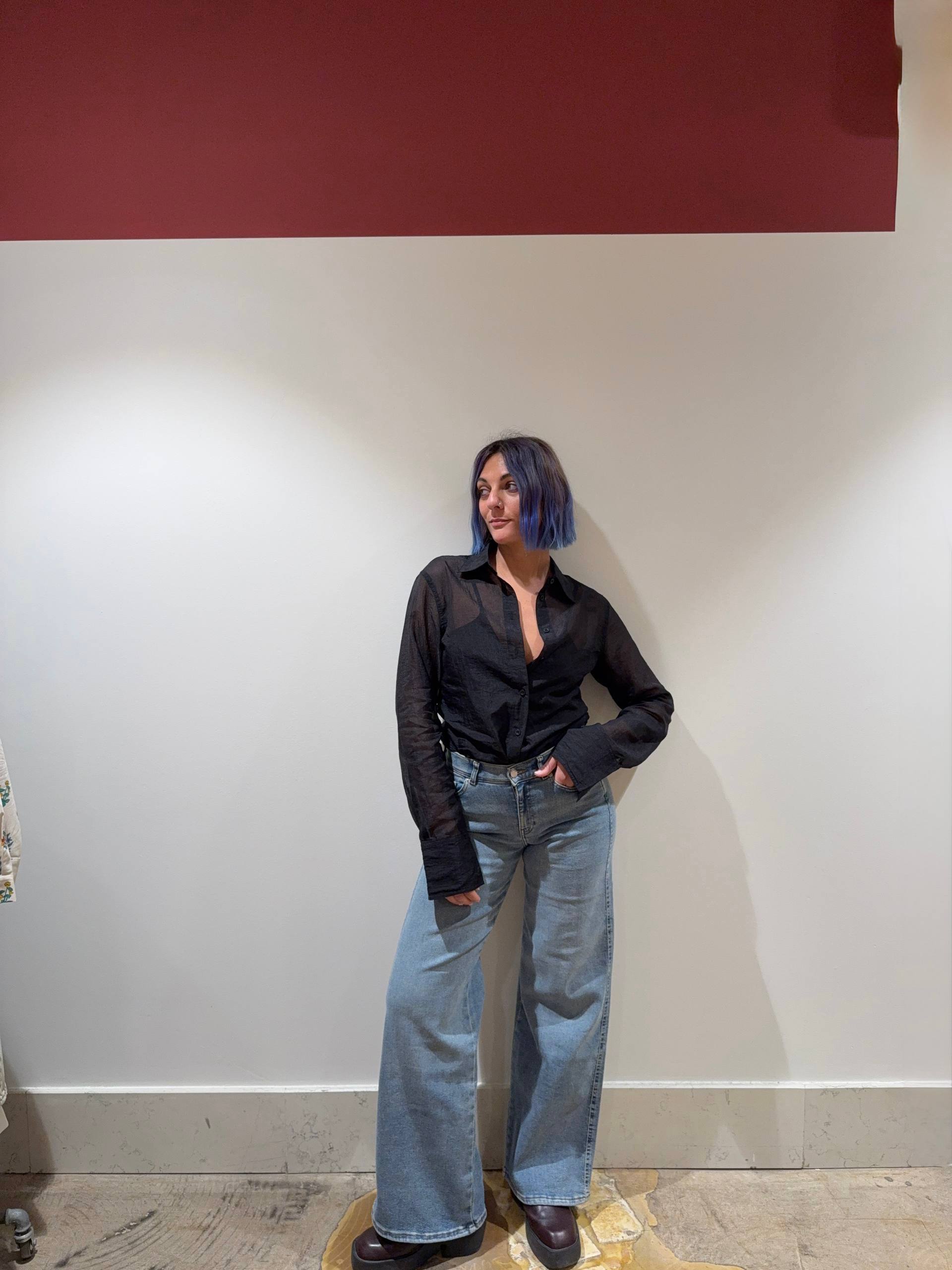 Denim vita media bassa. Gamba ampia leggermente svasata. Tessuto denim elasticizzato. Vestibilità comoda. Isabella indossa la S ed è alta 1.68 e veste una 42.