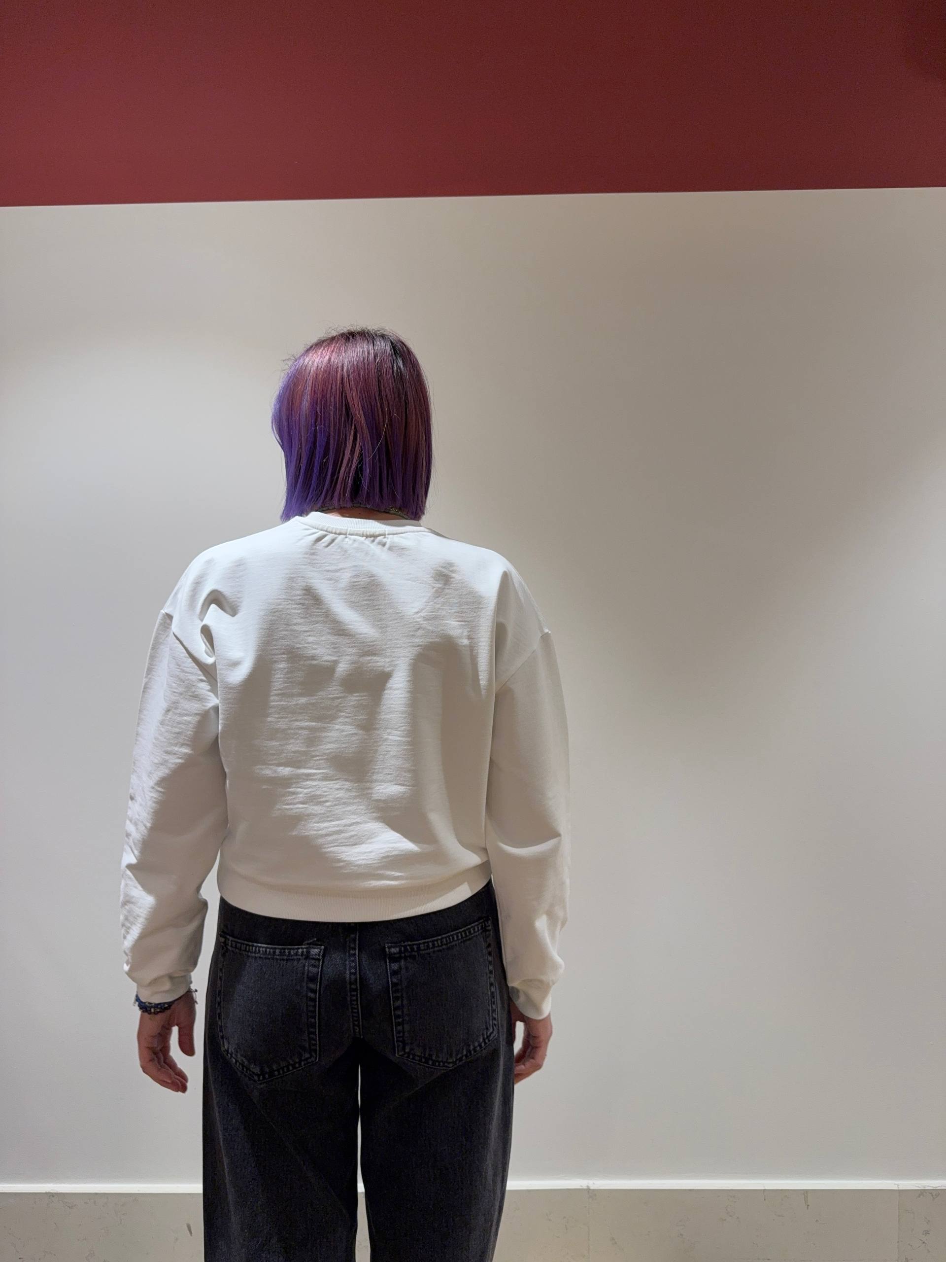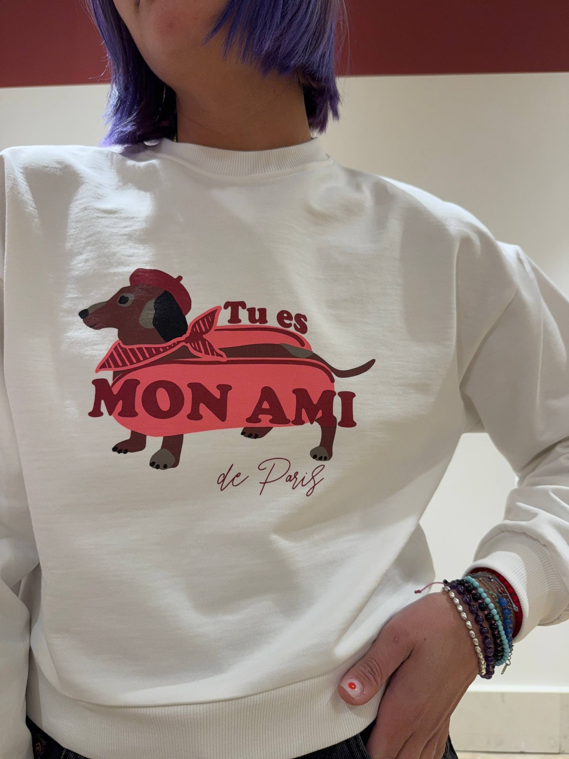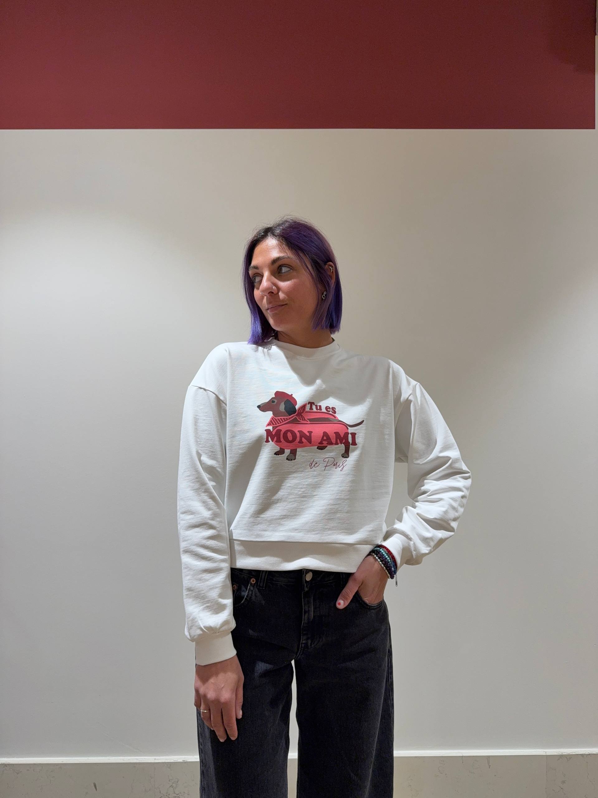 Felpa in cotone con stampa bassotto. Modello crop. Vestibilità regolare. Isabella indossa una S e veste una 42 ed è alta 1.68.