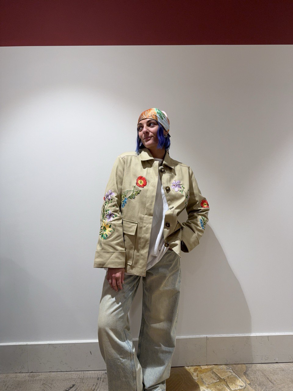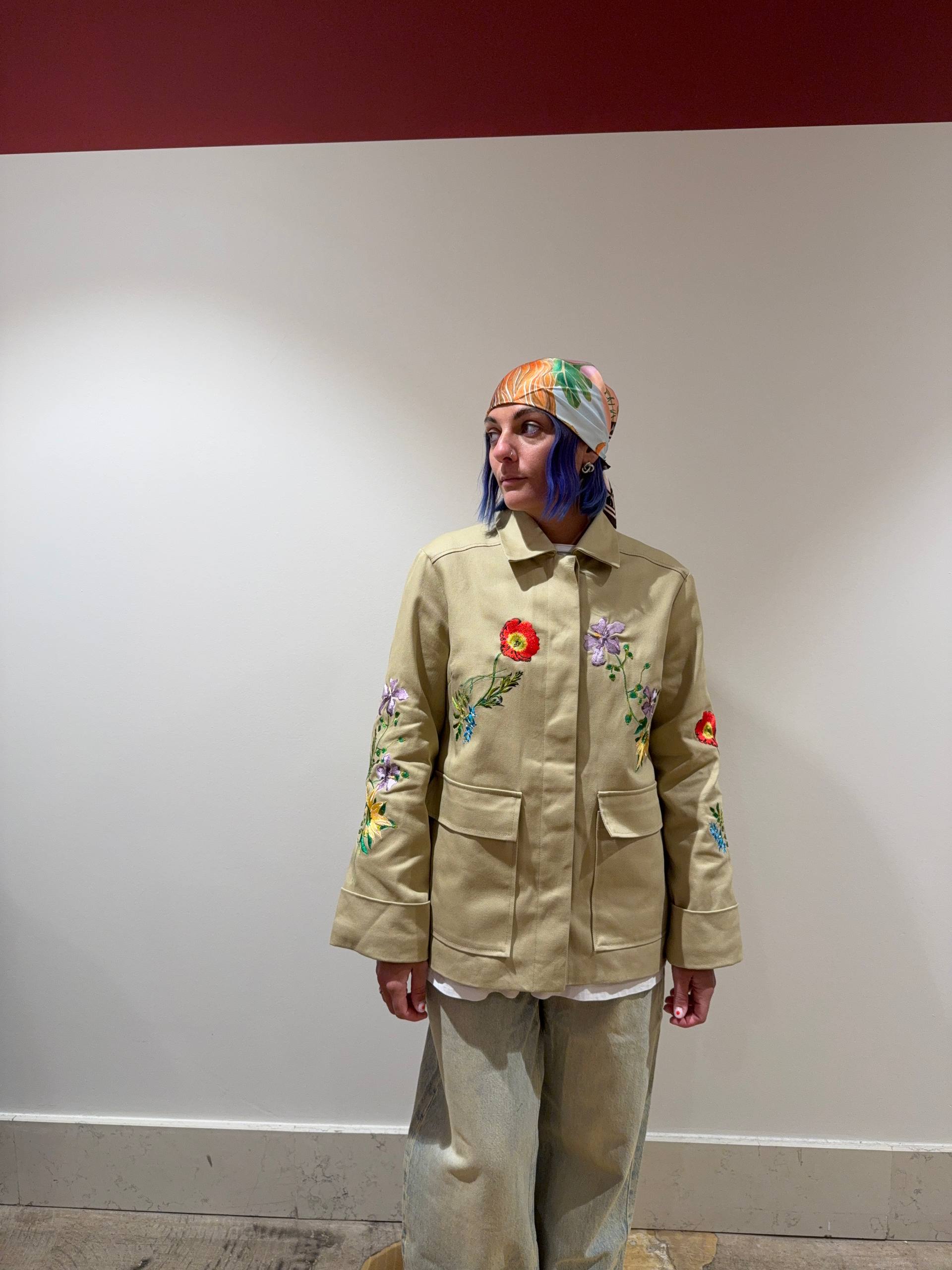 Giacca parka con fiori ricamati. Interno fodera con tessuto a righe. Vestibilità normale. Isabella indossa la S  e veste una 42 ed è alta 1.68.