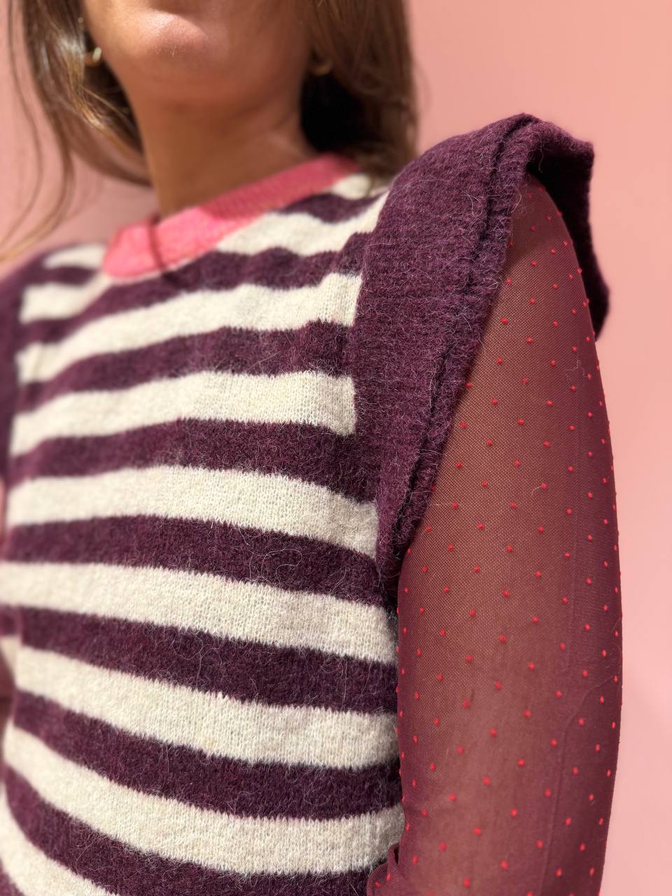 Gilet a righe panna e vinaccio con girocollo rosa e con volant sulle spalle.