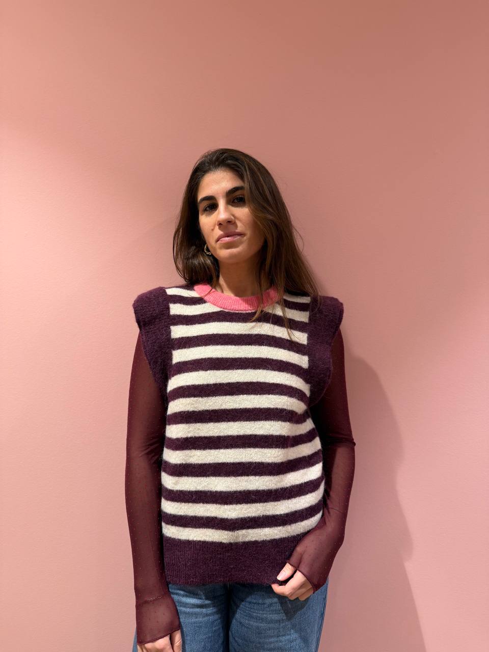 Gilet a righe panna e vinaccio con girocollo rosa.