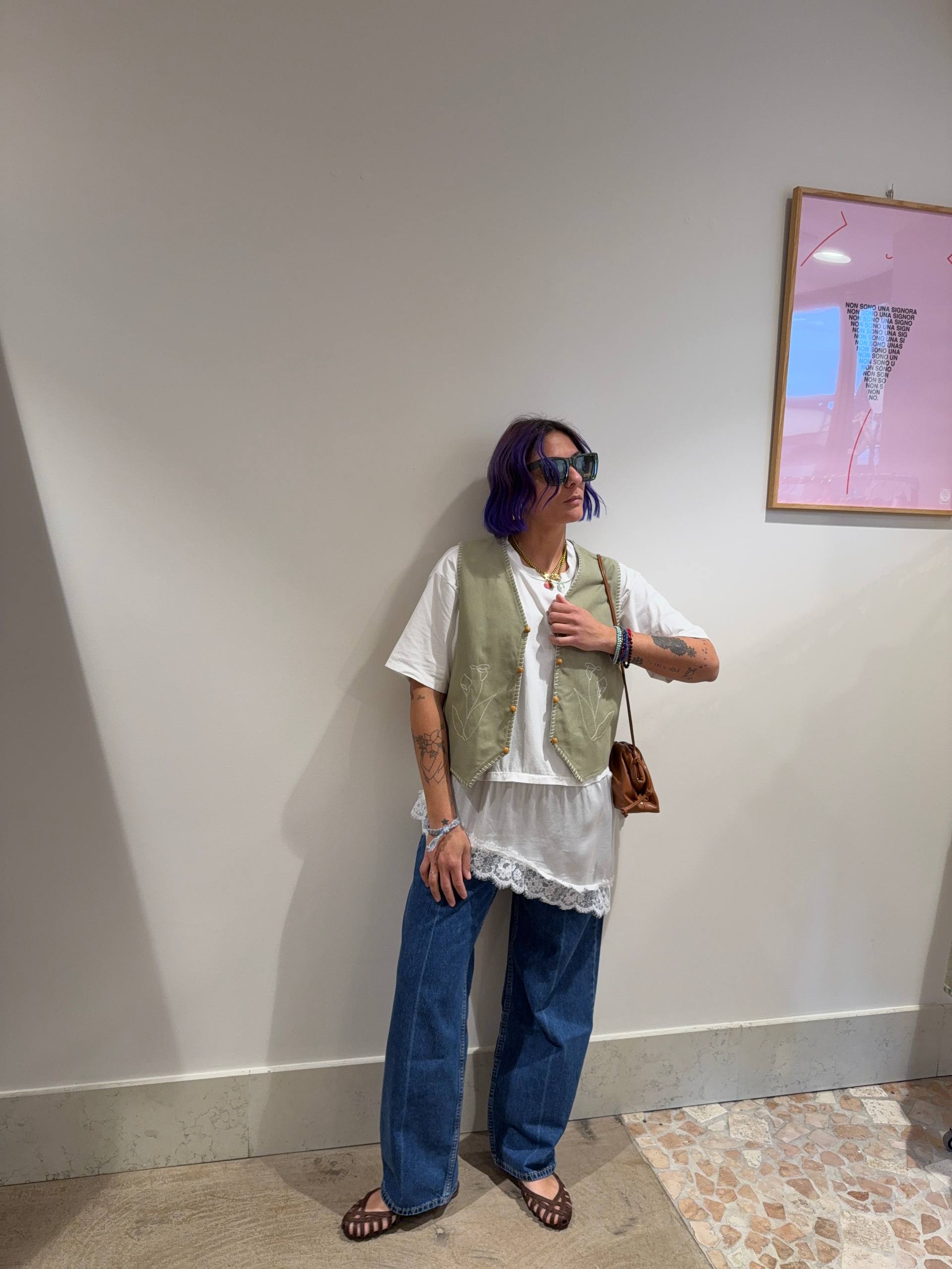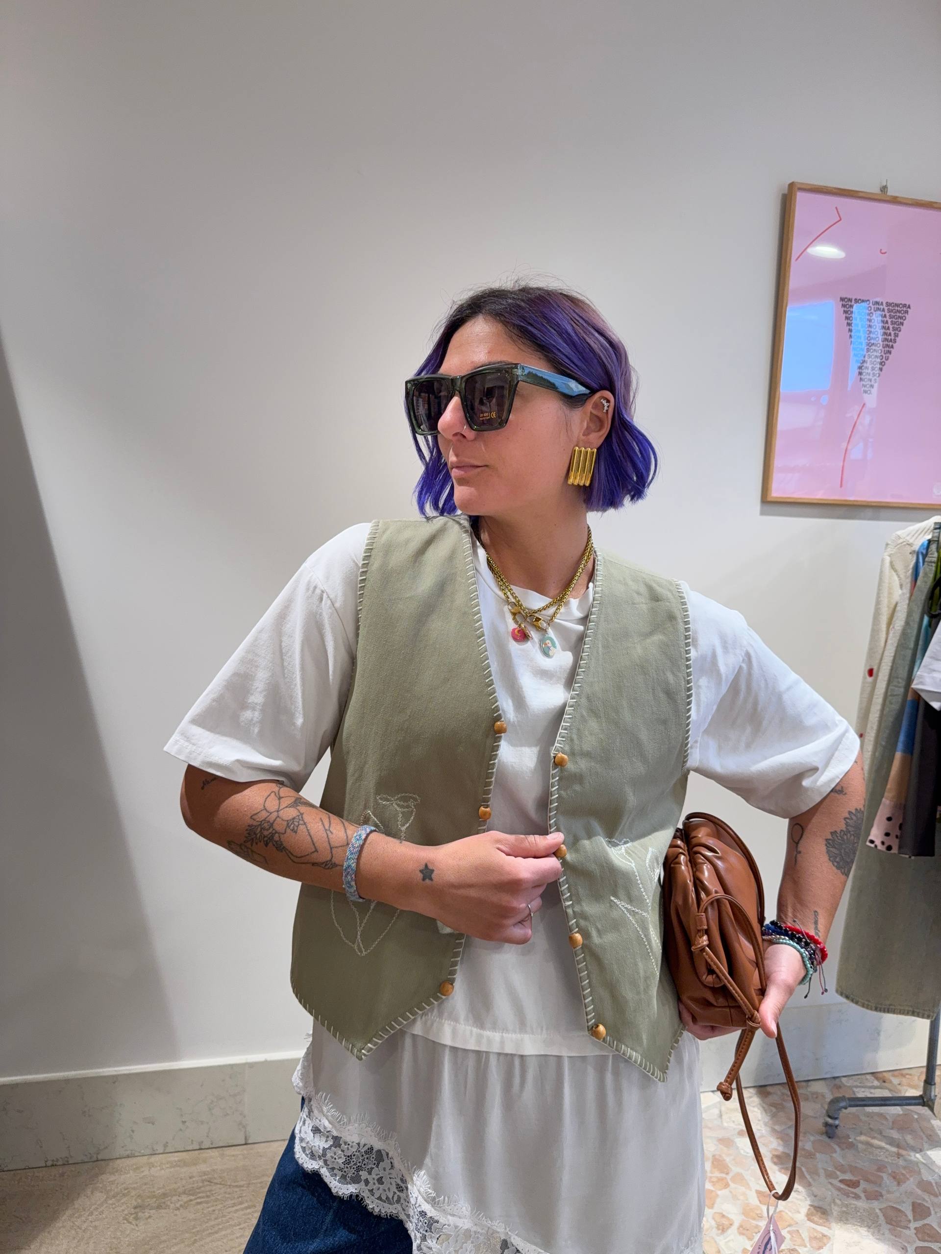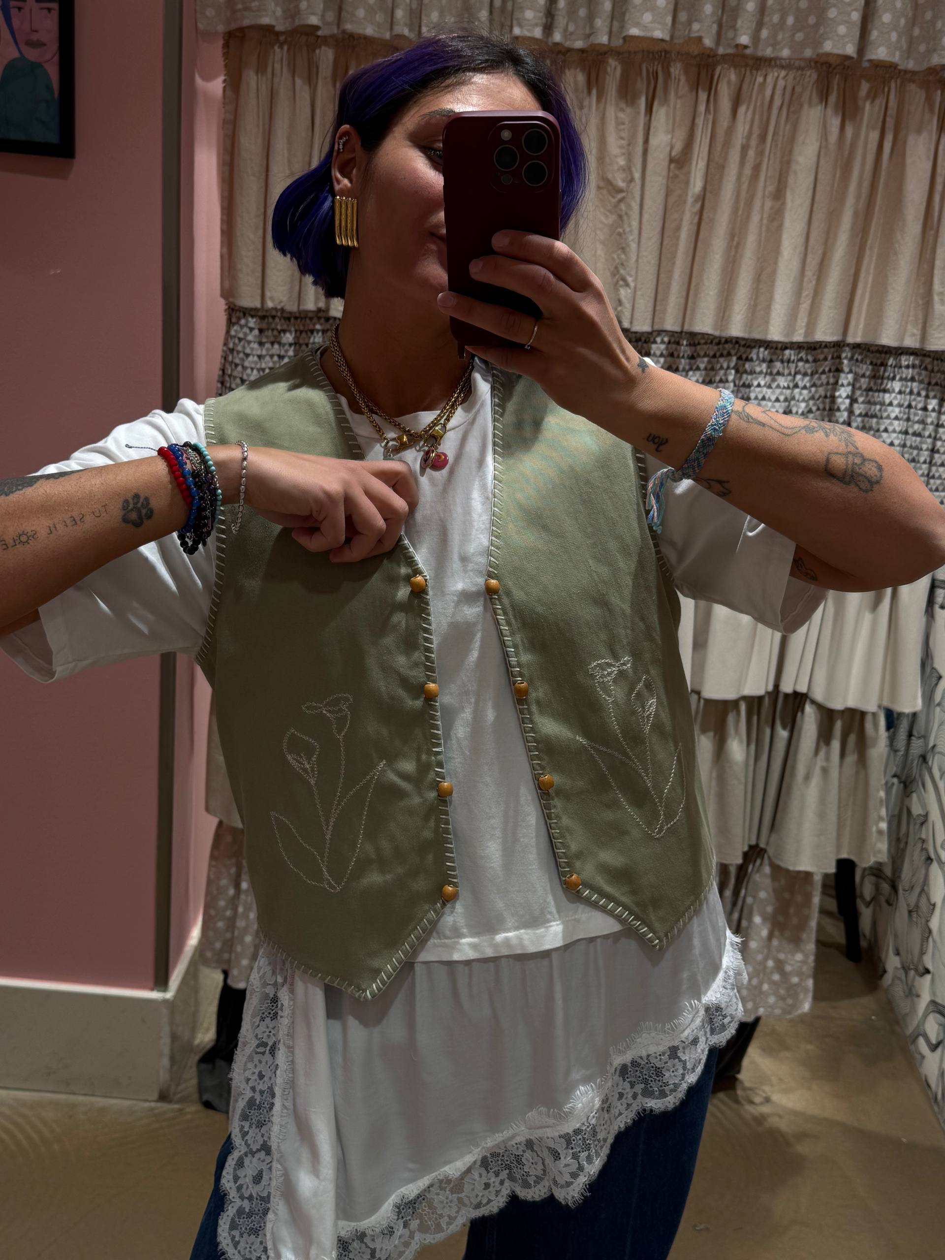 Gilet verde salvia con fiori ricami. Bottoni in legno. Taglia unica, vestibilità morbida. Isabella veste una 42 è alta 1.68.