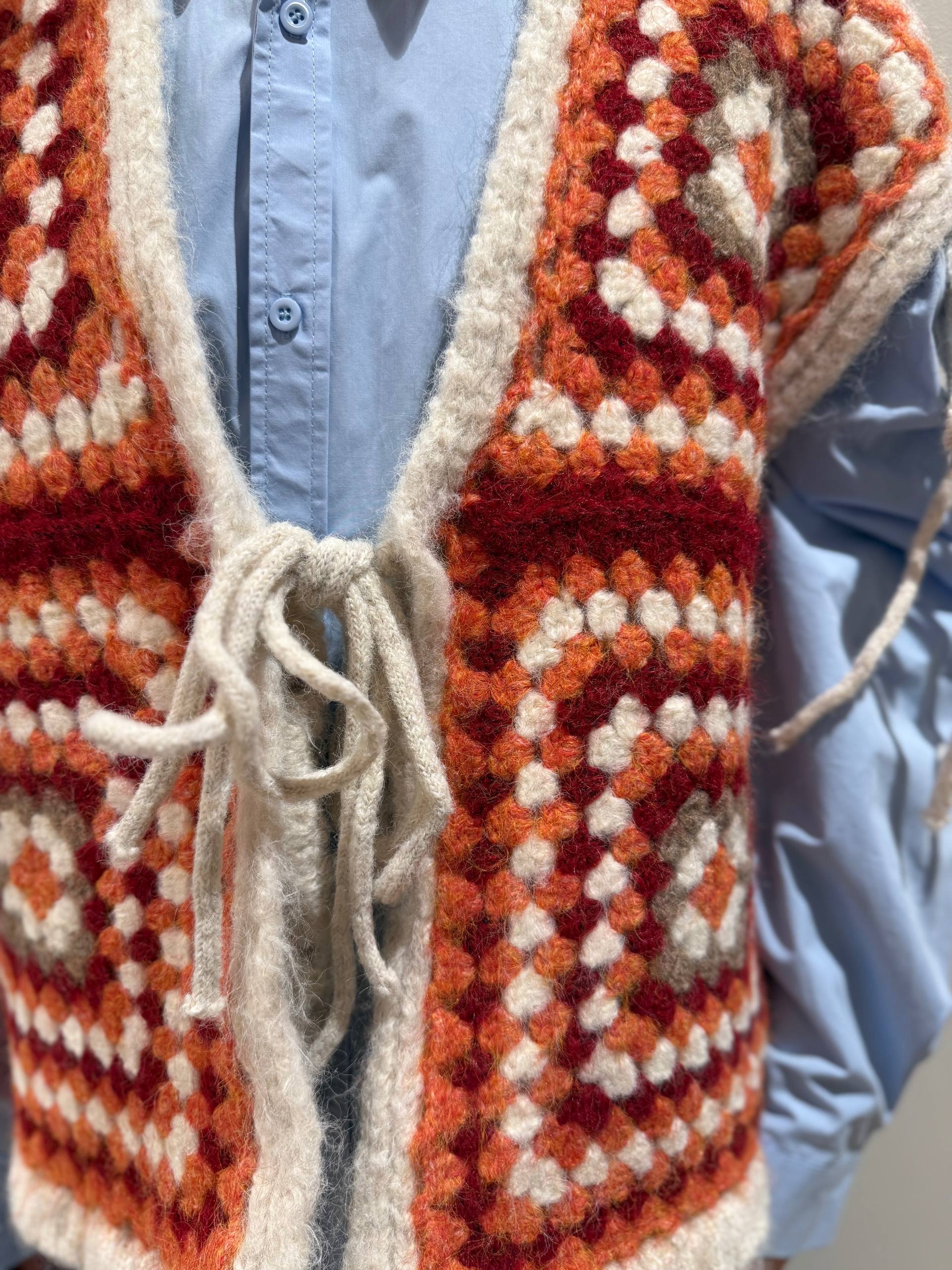 Gilet in alpaca e viscosa fatto a mano. Presenta un laccio davanti come chiusura.