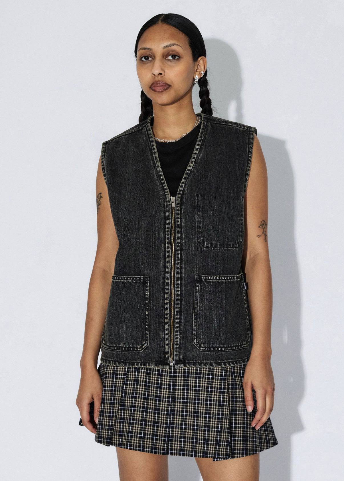 Gilet worker in denim nero. Vestibilità regolare. Chiusura con cerniera. Tessuto denim rigido. Dettagli tasche worker. La modella indossa la S ed è alta 1.74.