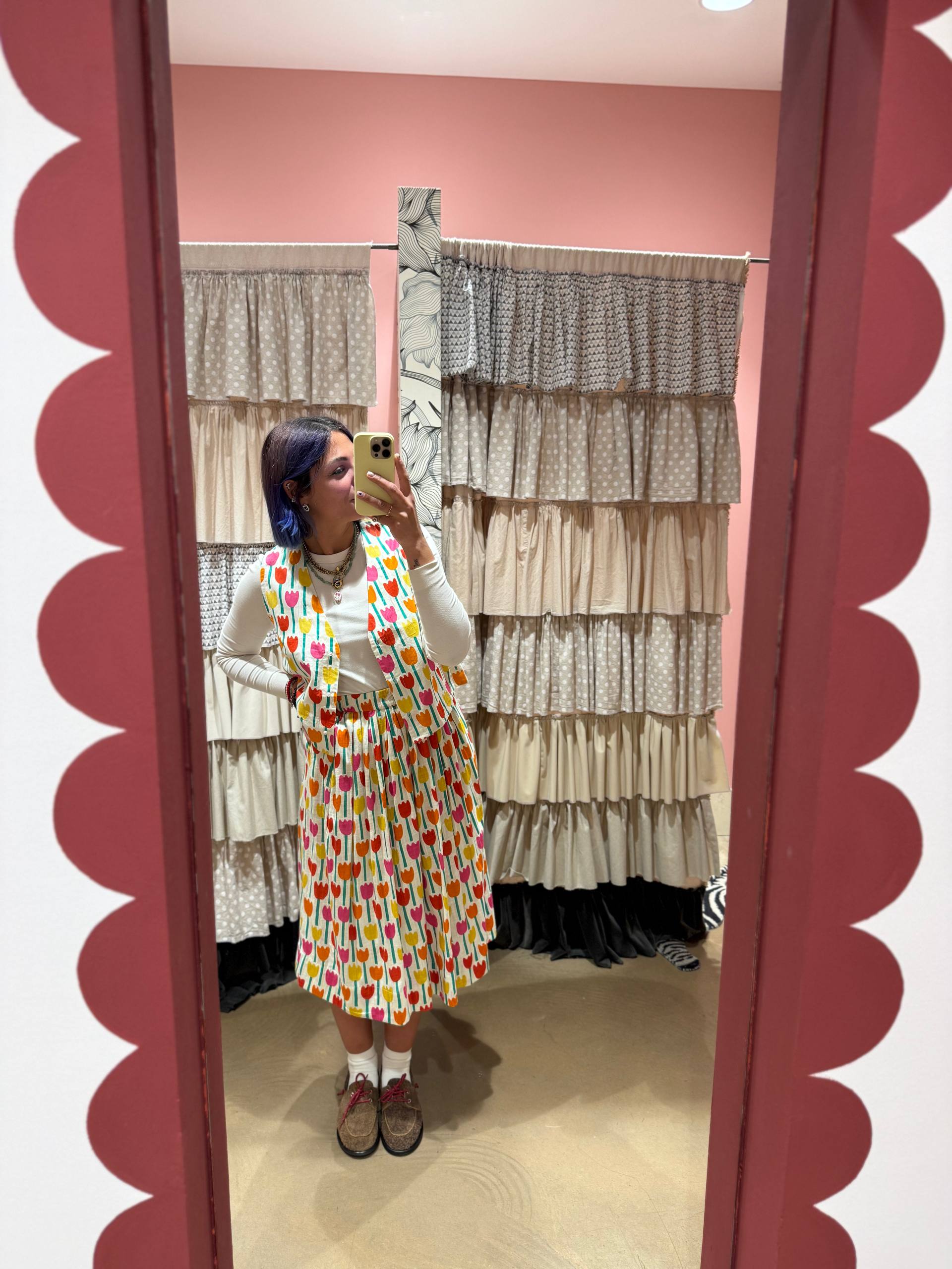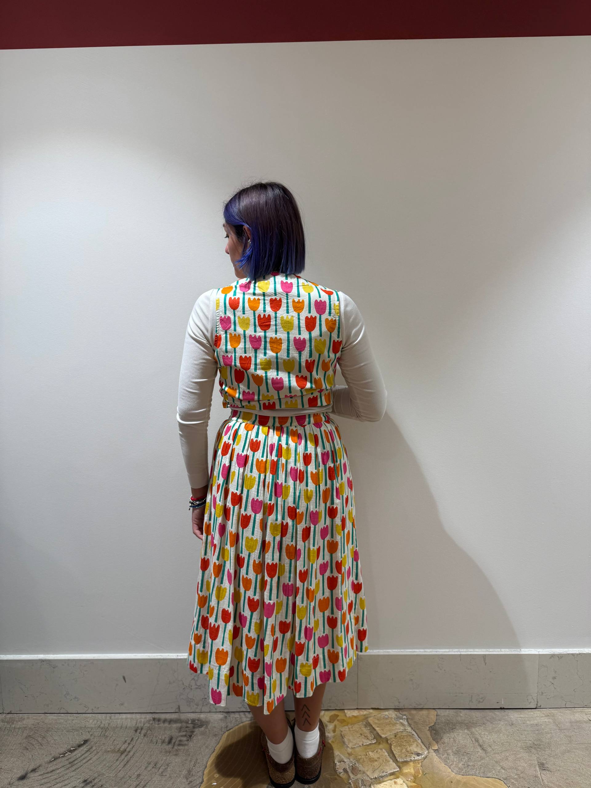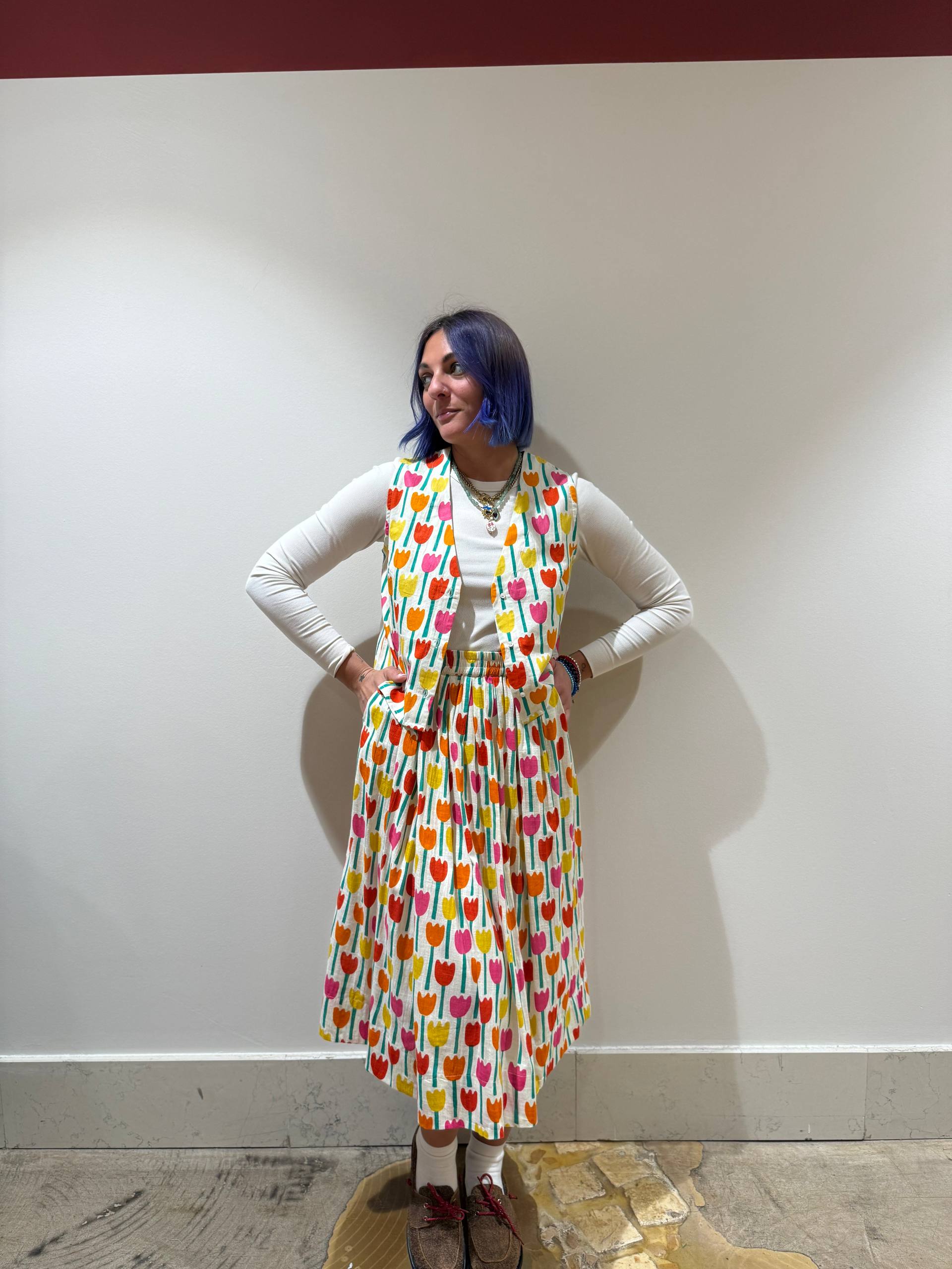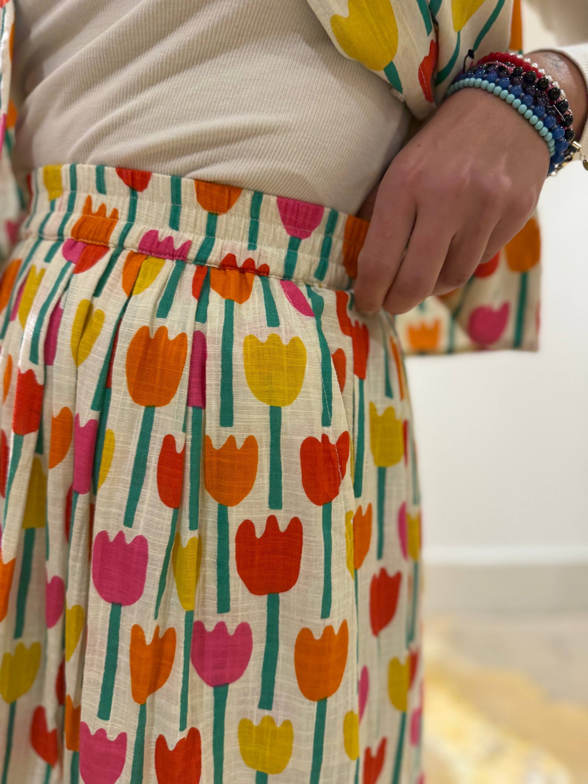 Gonna midi in cotone con tulipani colorati. Elastico in vita. Fodera. Tasche laterali. Vestibilità normale. Isabella indossa la taglia S e veste una 42 ed è alta 1.68.