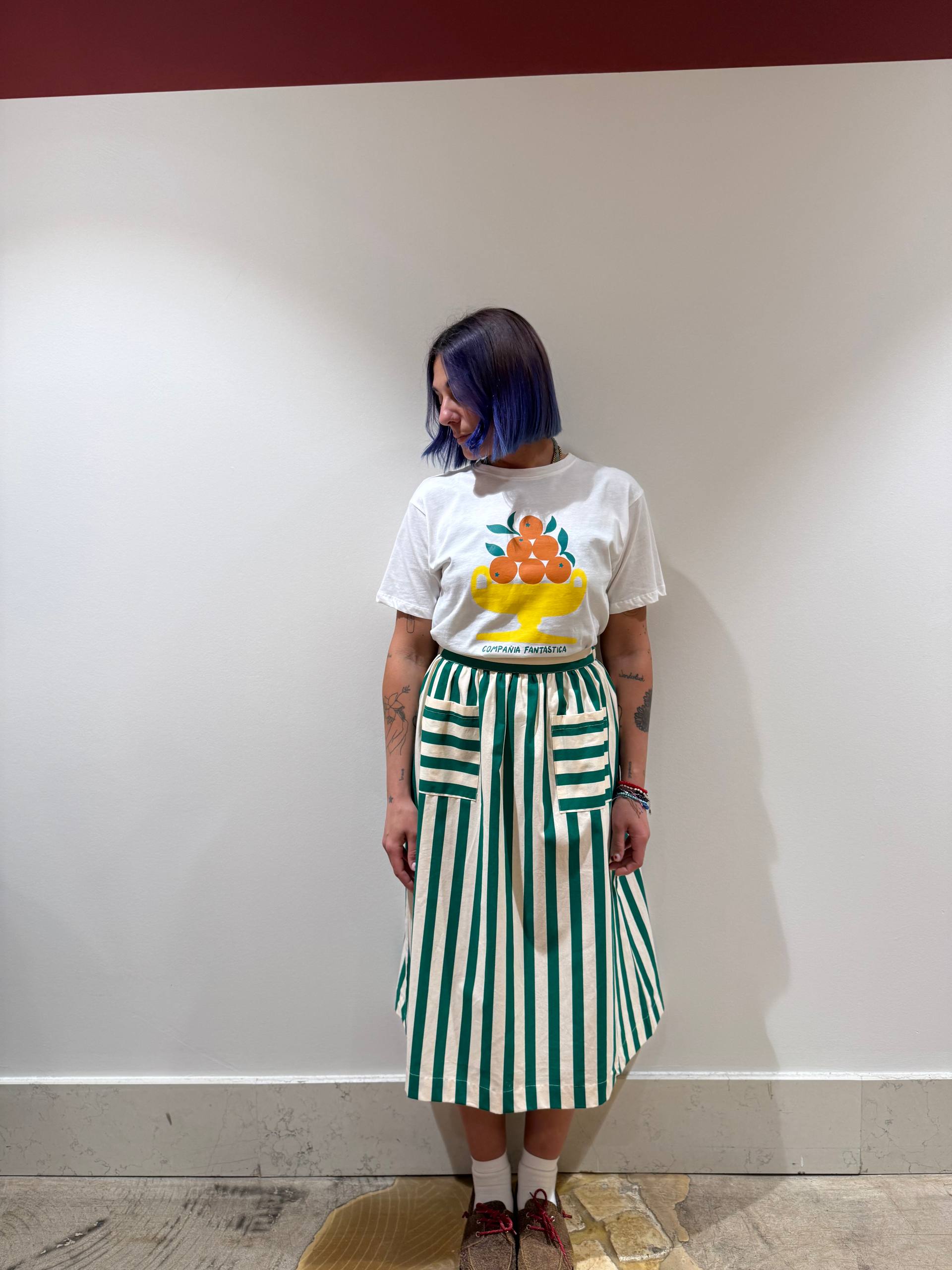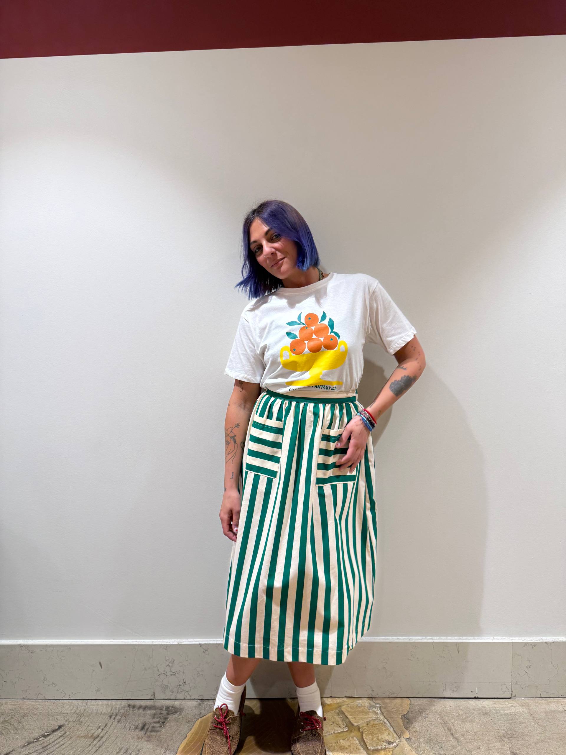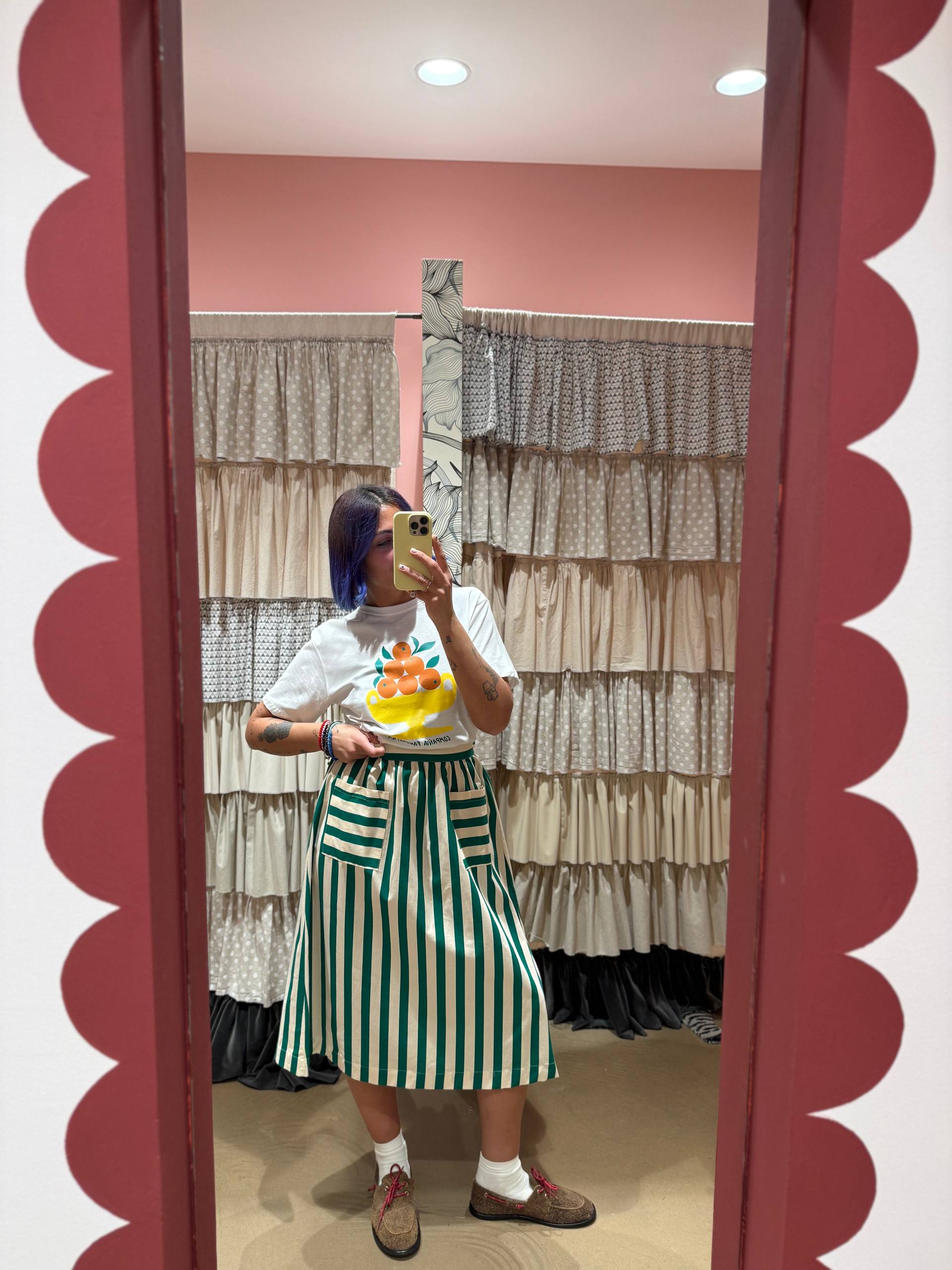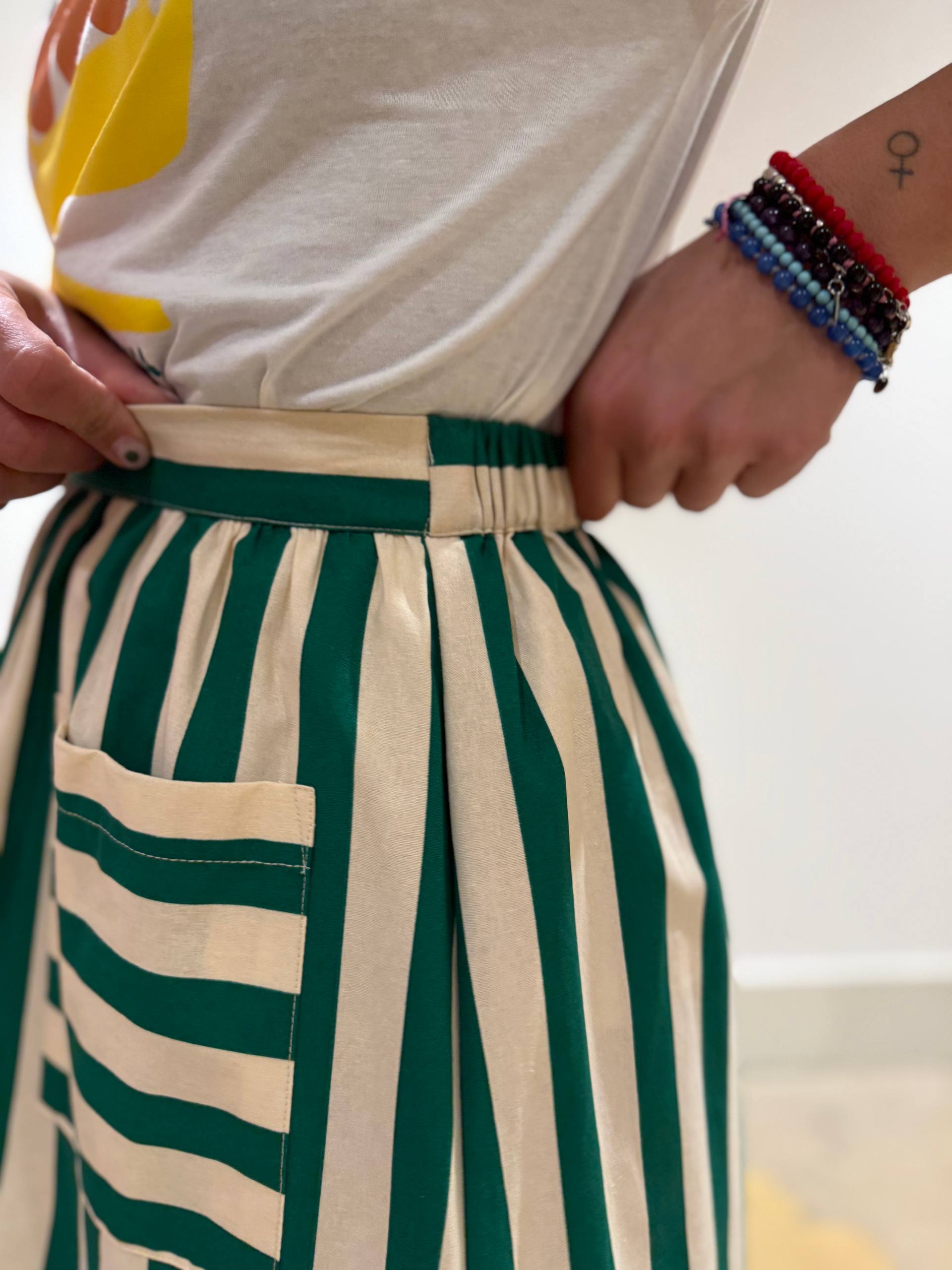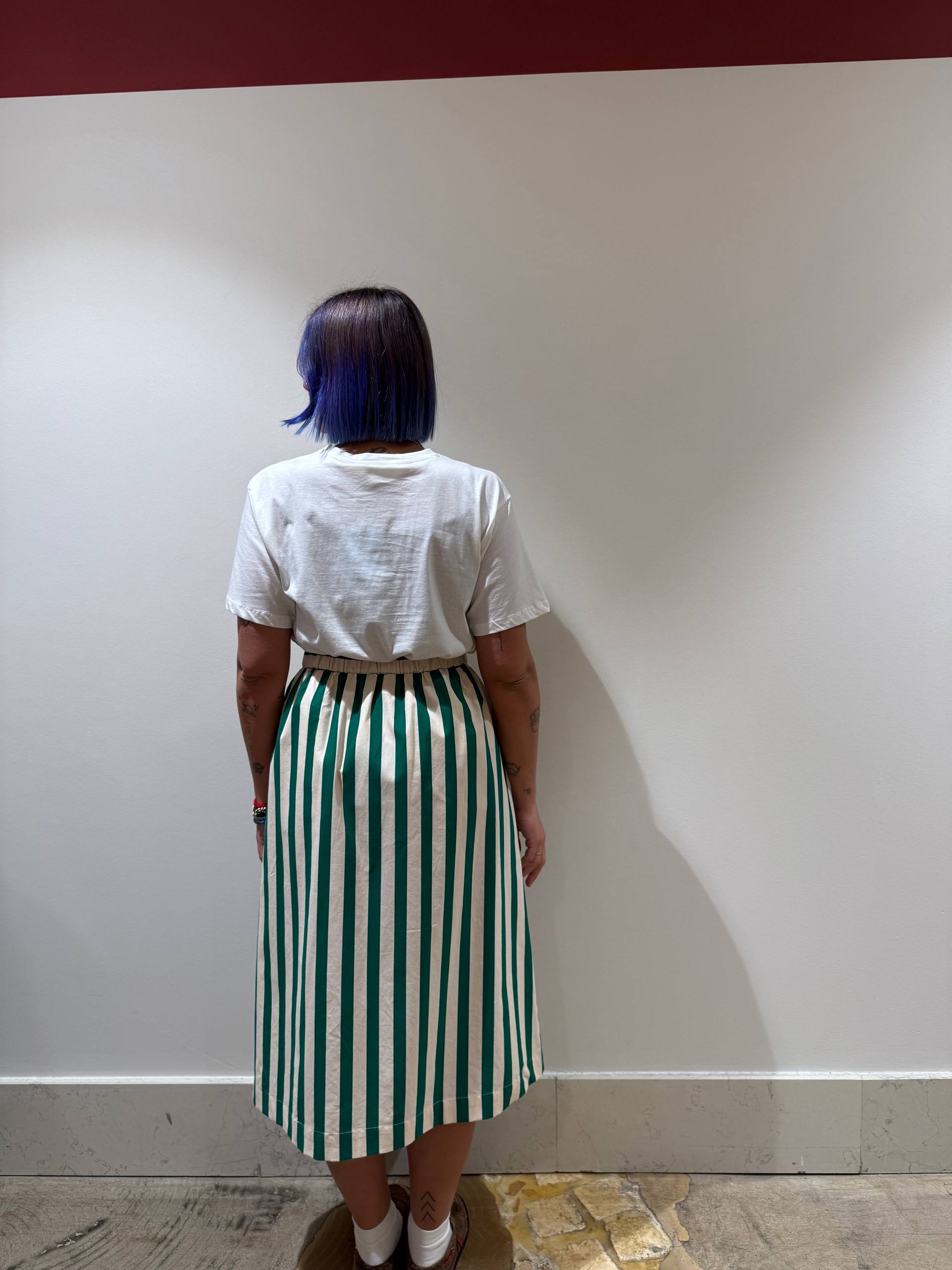 Gonna midi a righe con tasche frontali. Elastico sul retro. Vestibilità normale. Isabella indossa la taglia S e veste una 42 ed è alta 1.68.