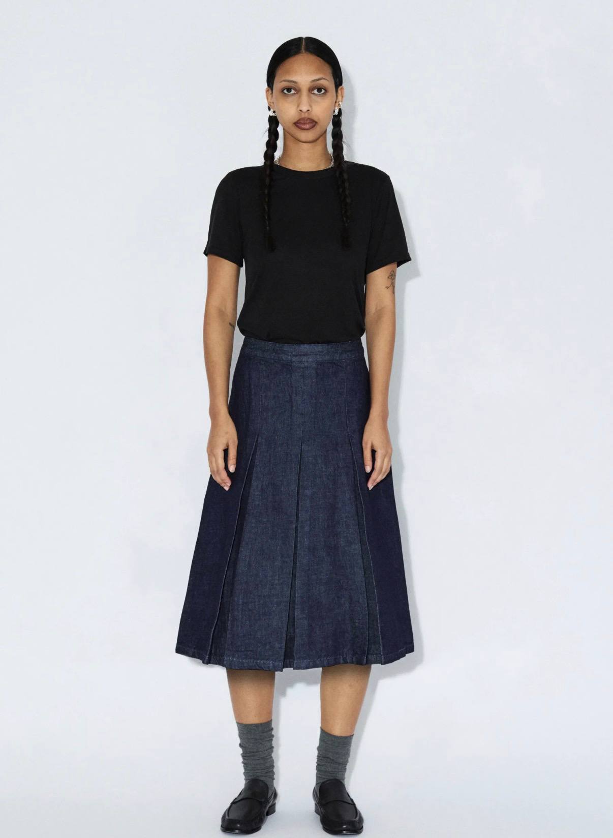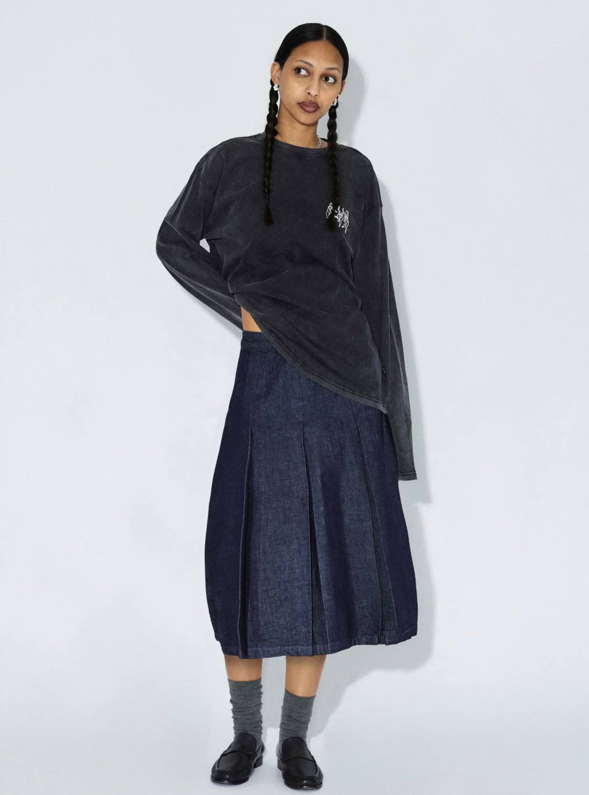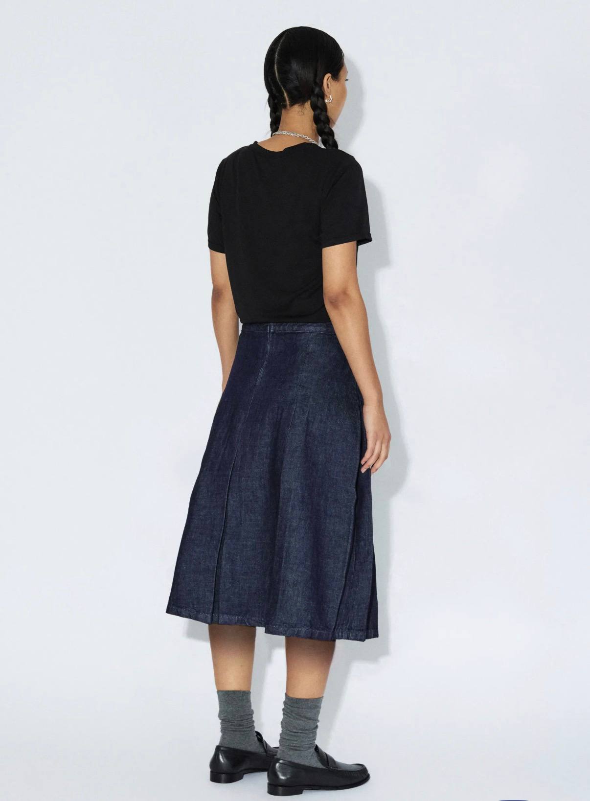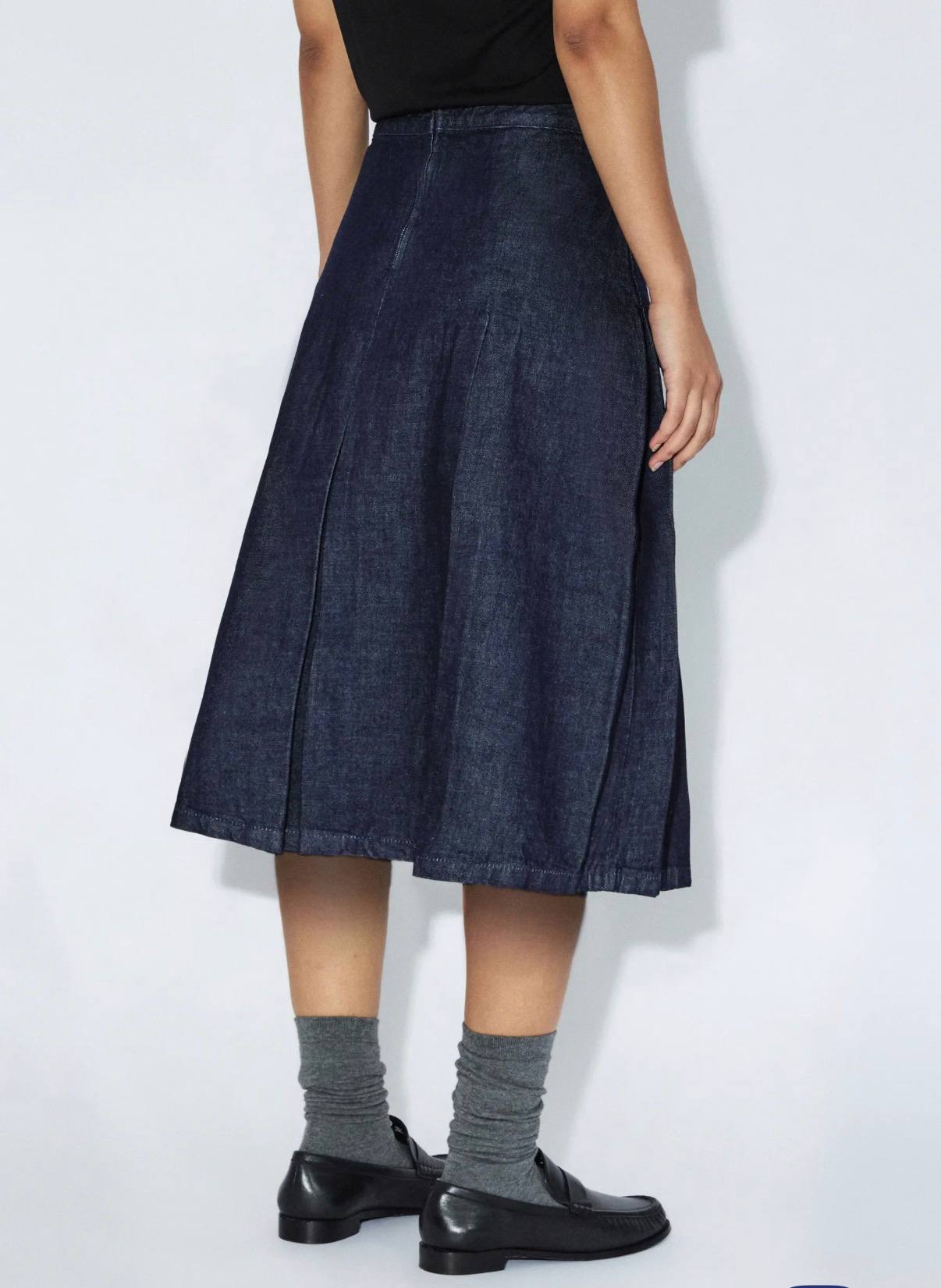 Gonna midi in denim scuro con pieghe. Vita media. Chiusura con cerniera sul retro. Vestibilità comoda. La modella è alta 1.74 cm e indossa la taglia S.
