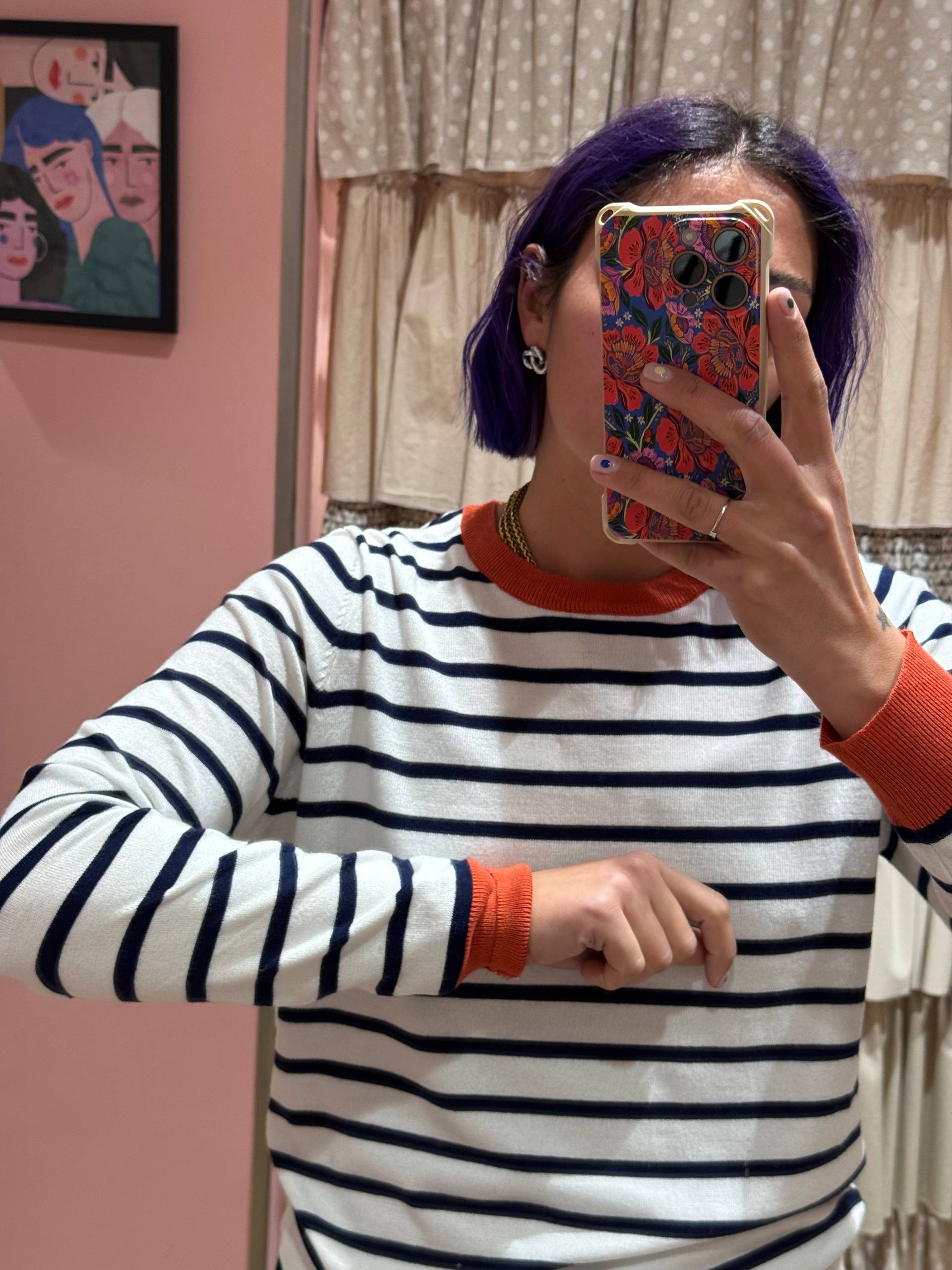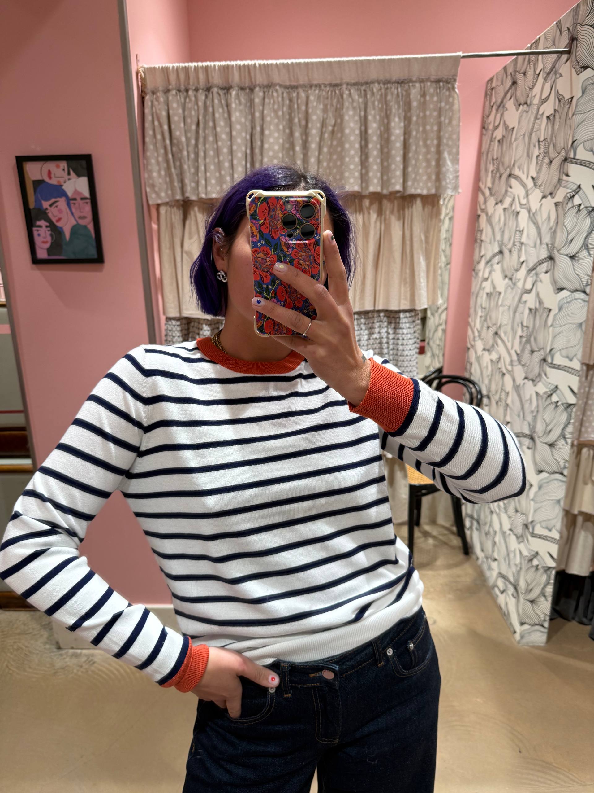 Maglia a righe bianco e blu con girocollo e polsini ruggine. Modello morbido. Isabella indossa la S e veste una 42 ed è alta 1.68.