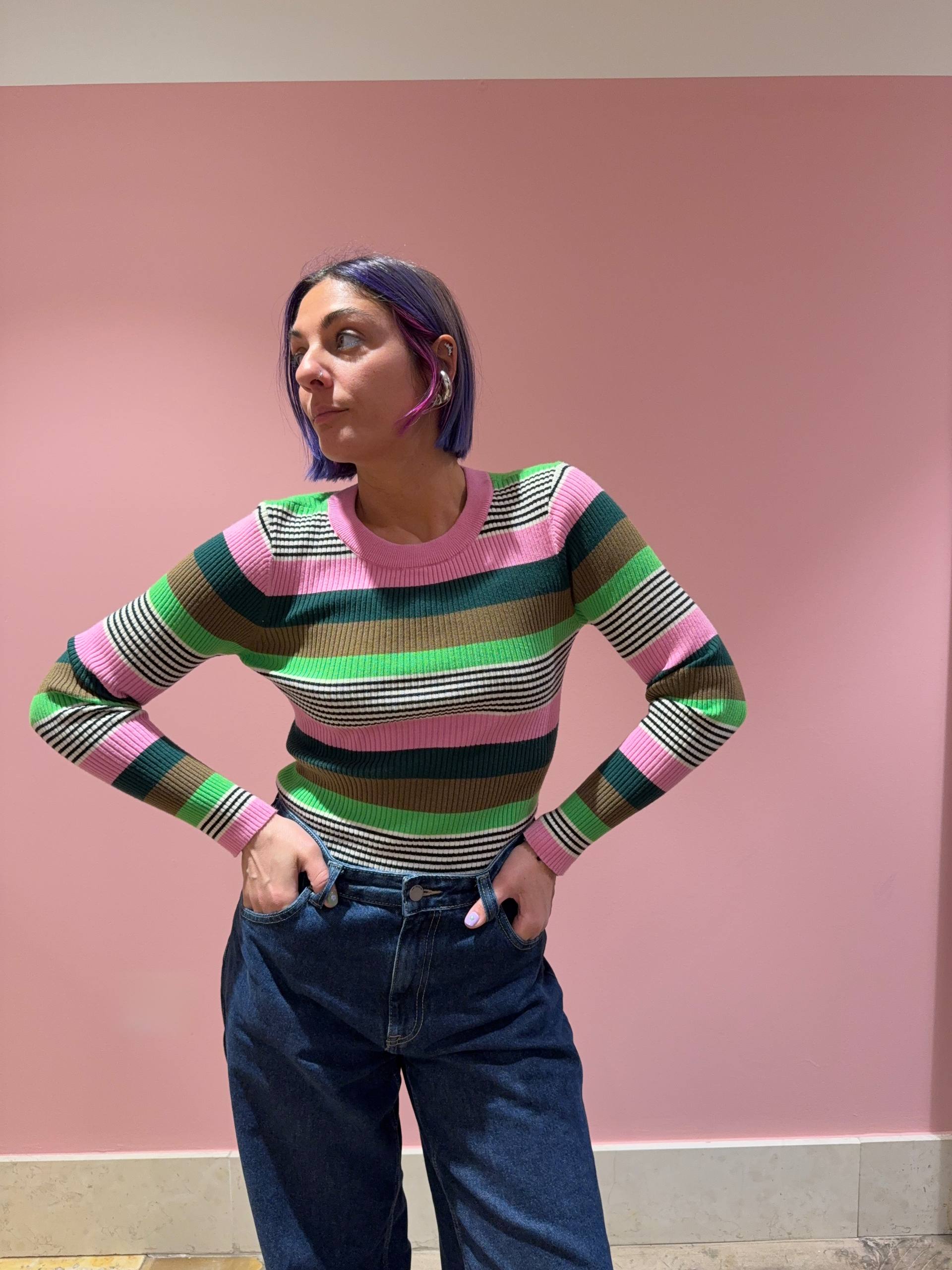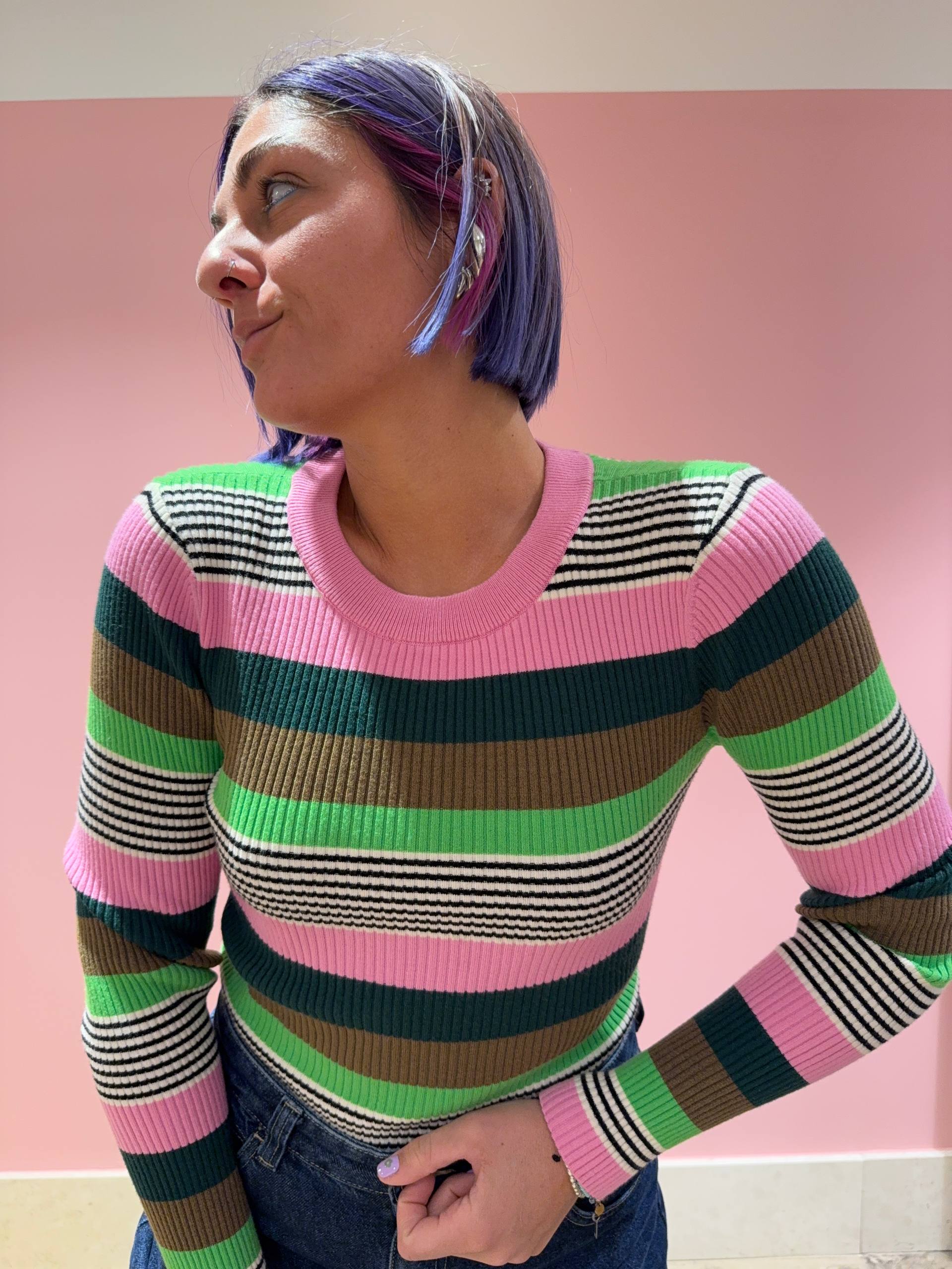 Maglietta basic a costine con righe color rosa, verde militare, verde, verde bosco, nero e bianco.