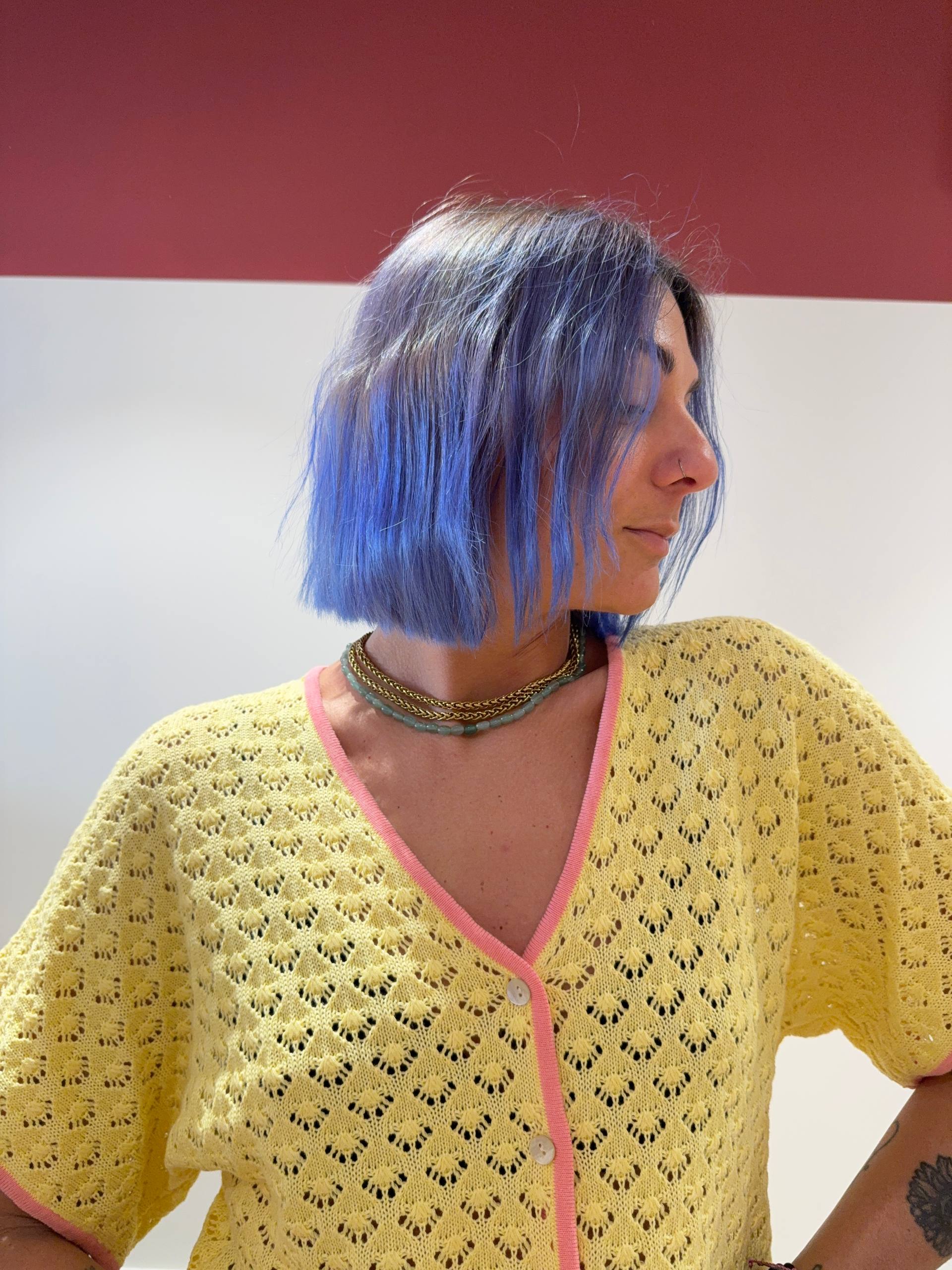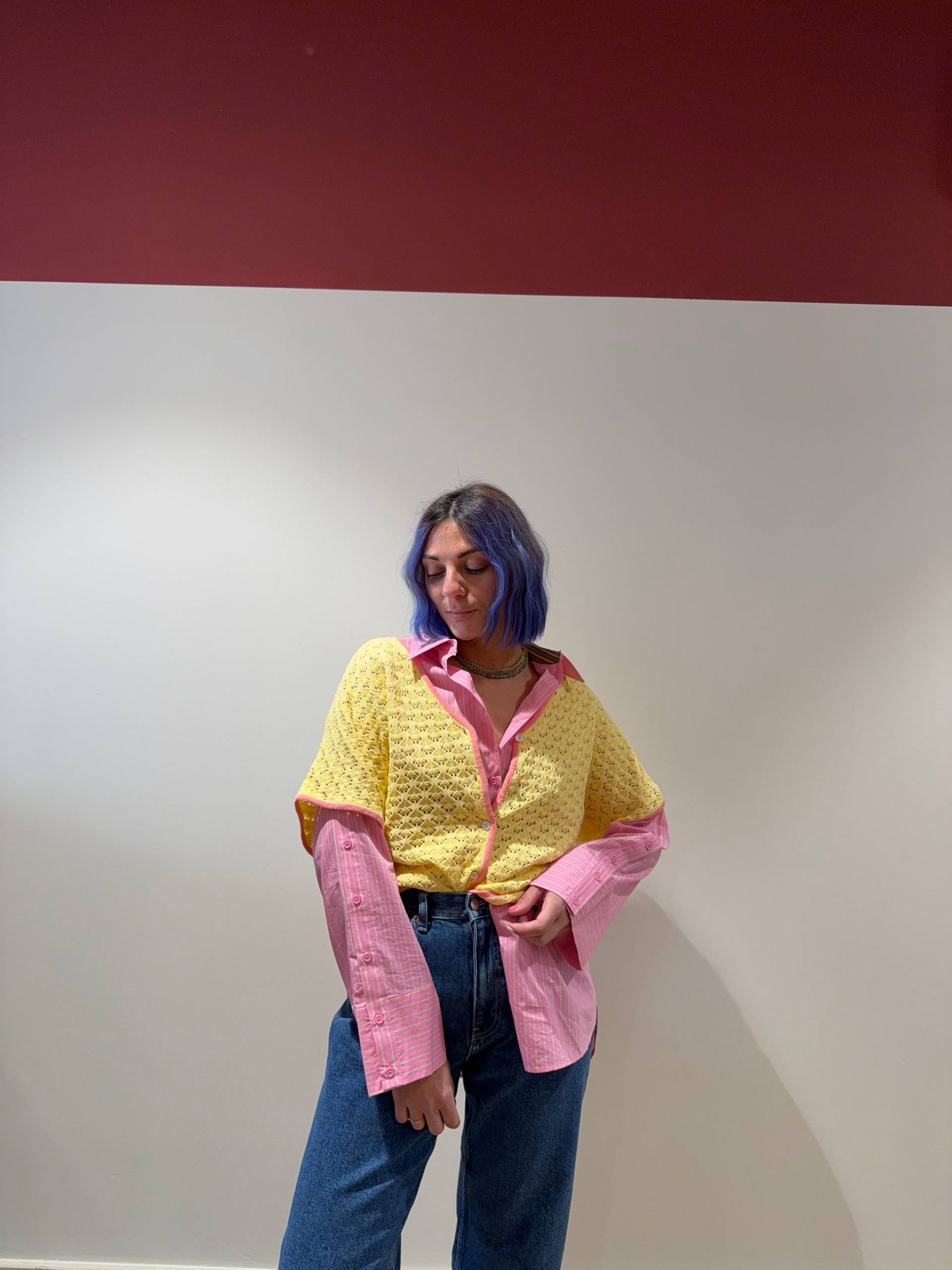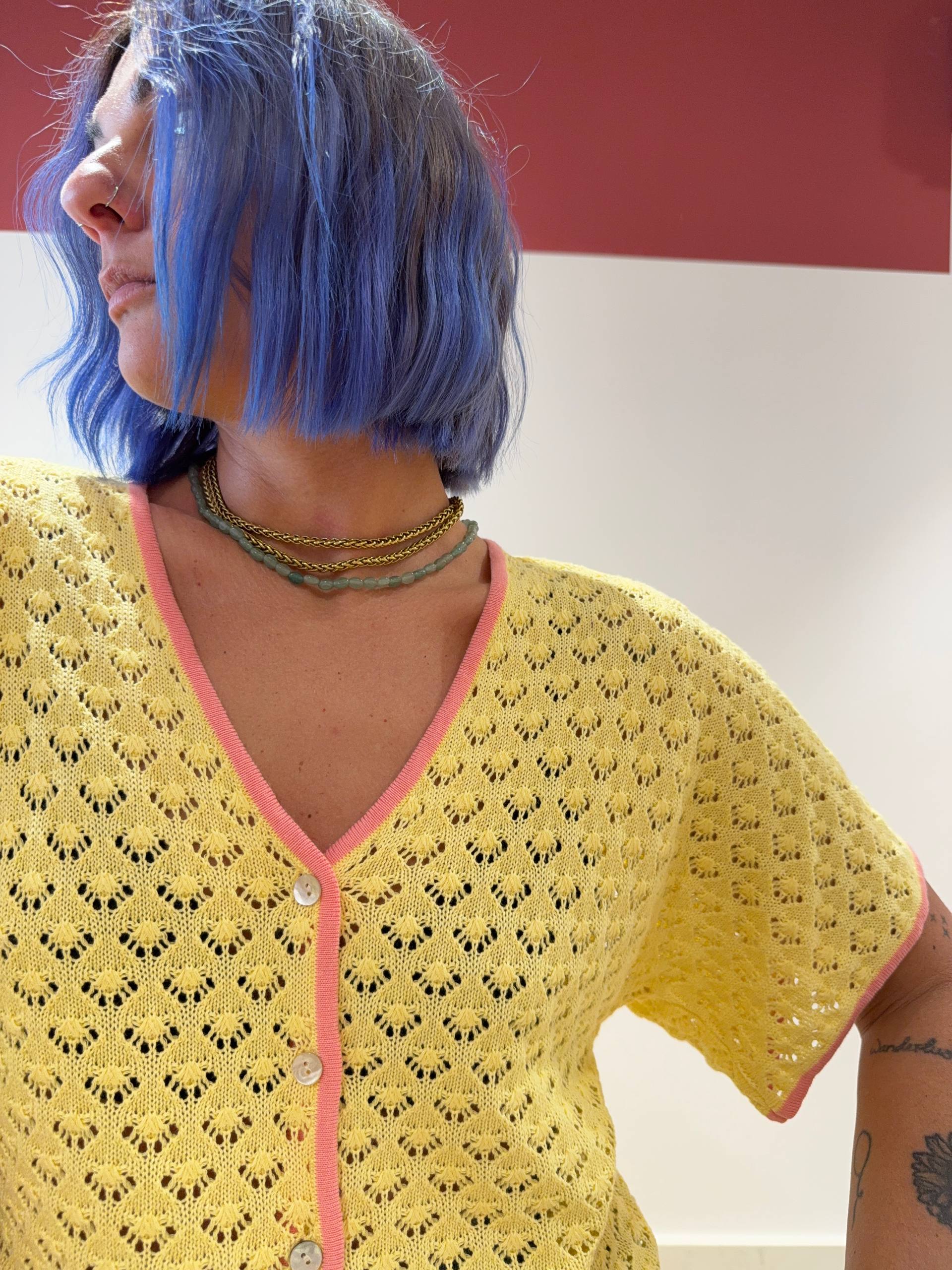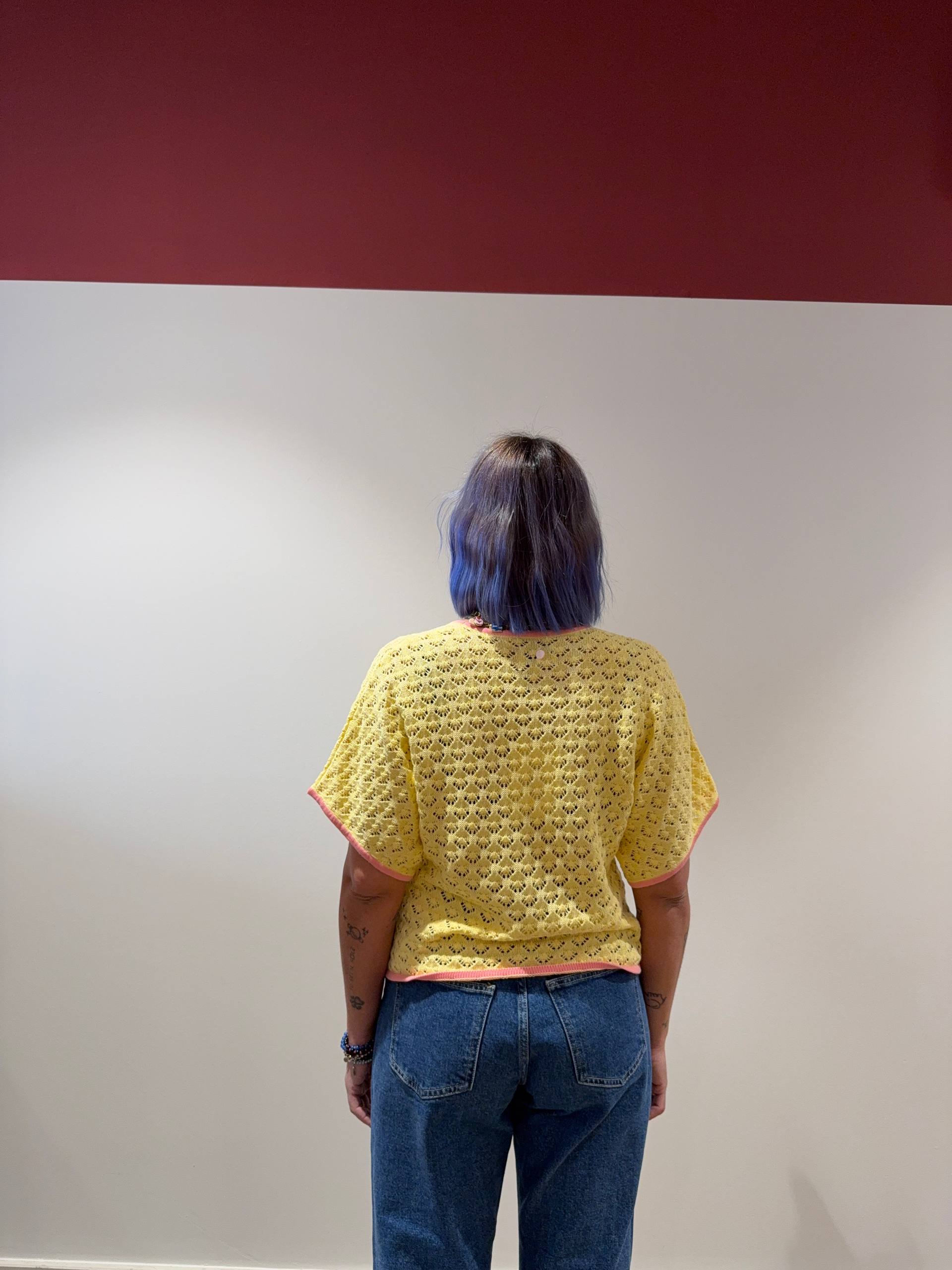 Maglia gialla in cotone traforata con bordini rosa. Chiusura con bottoni. Vestibilità morbida. Bellissima indossata anche sopra ad una camicia. Isabella indossa la S e veste una 42 ed è alta 1.68.