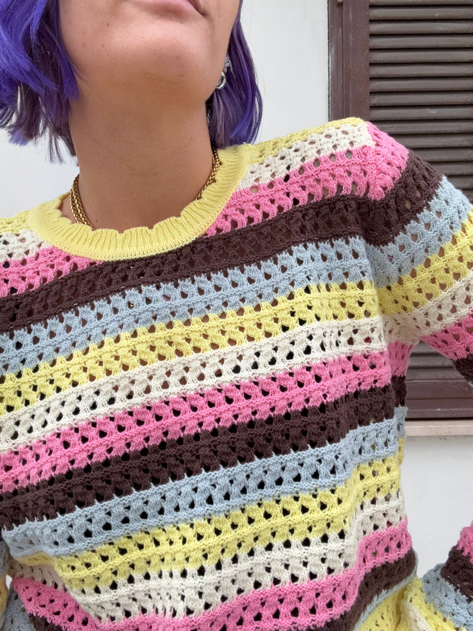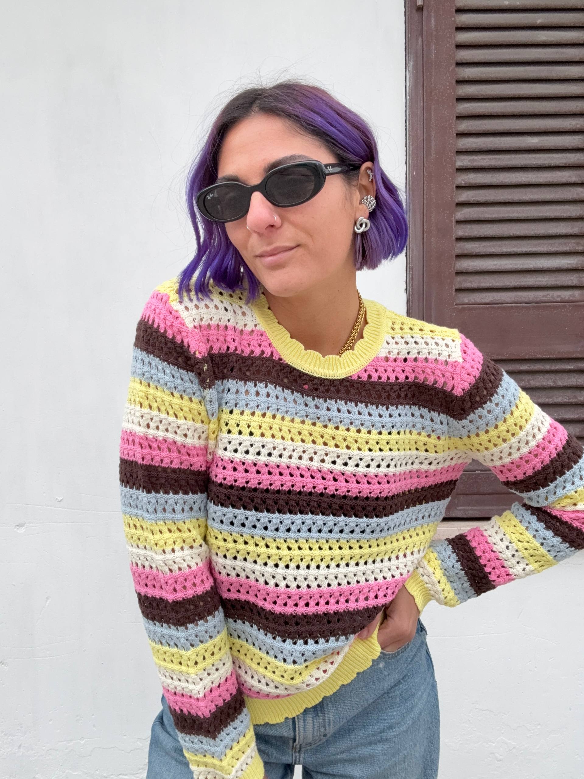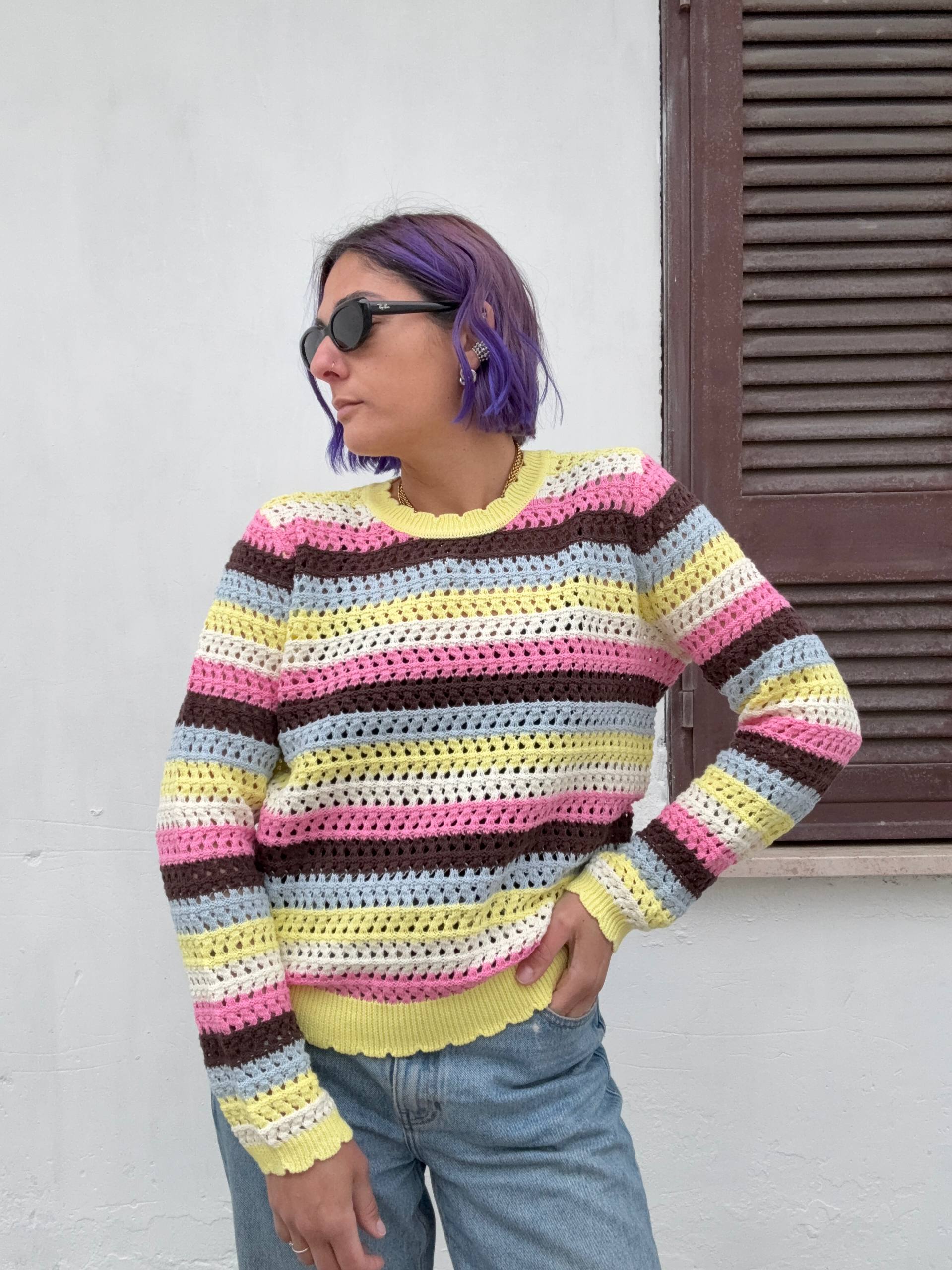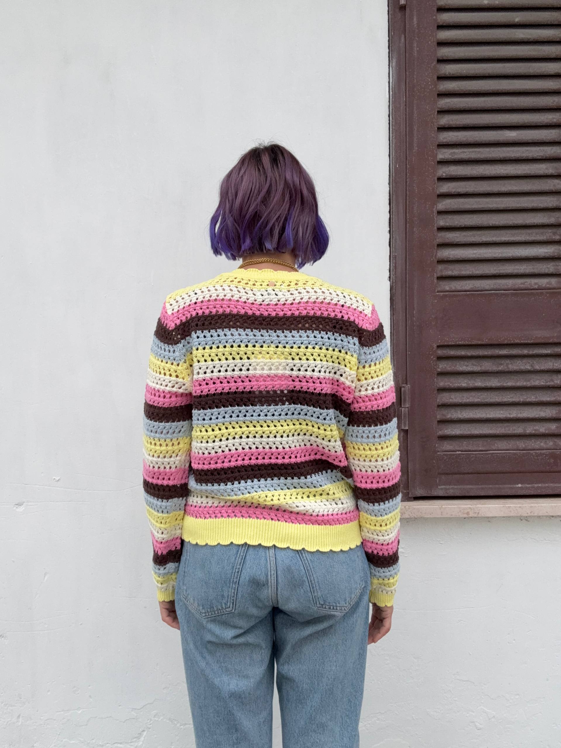 Maglia colorata traforata in cotone. Vestibilità morbida. Isabella indossa la S e veste una 42 ed è alta 1.68.