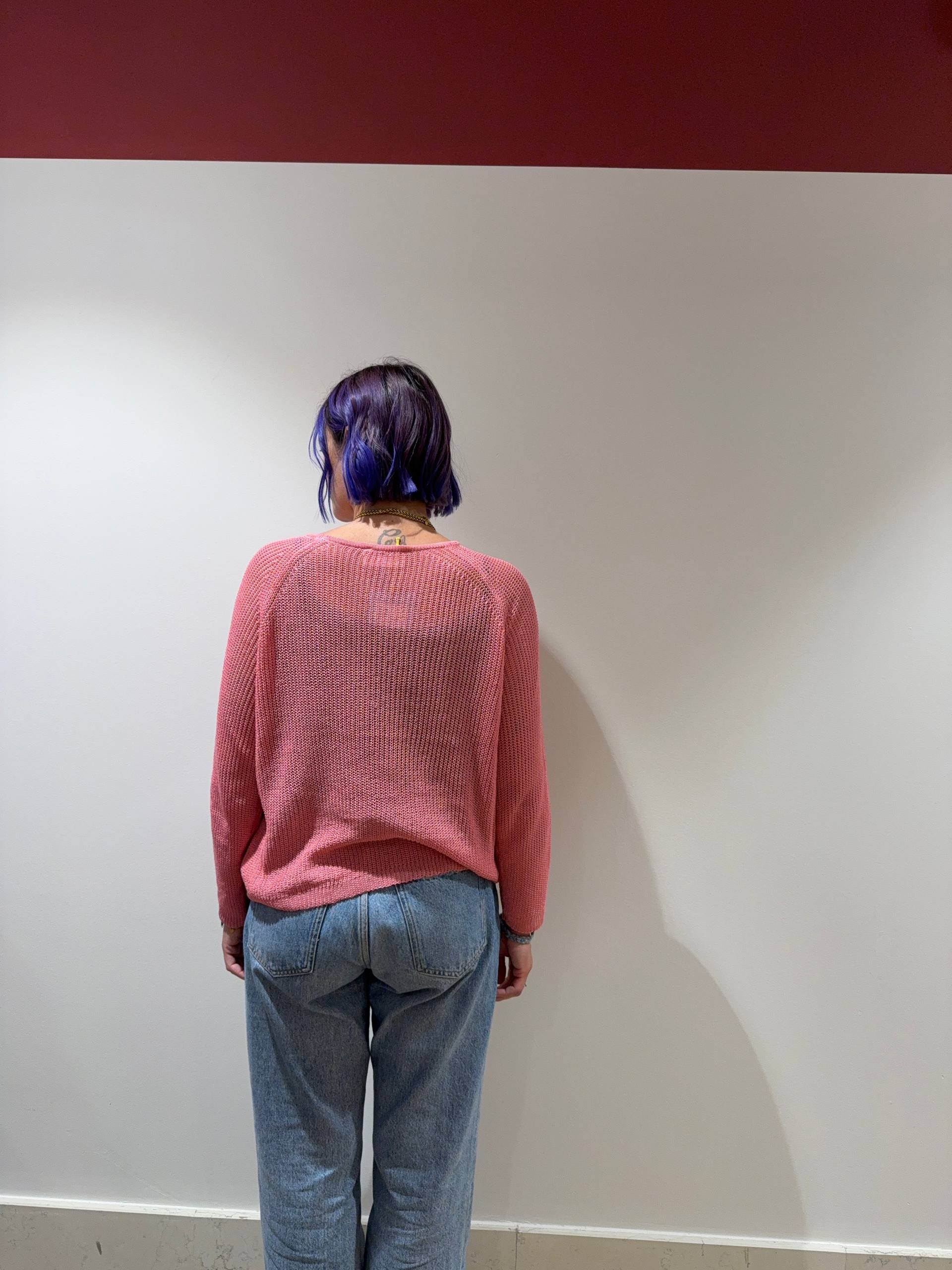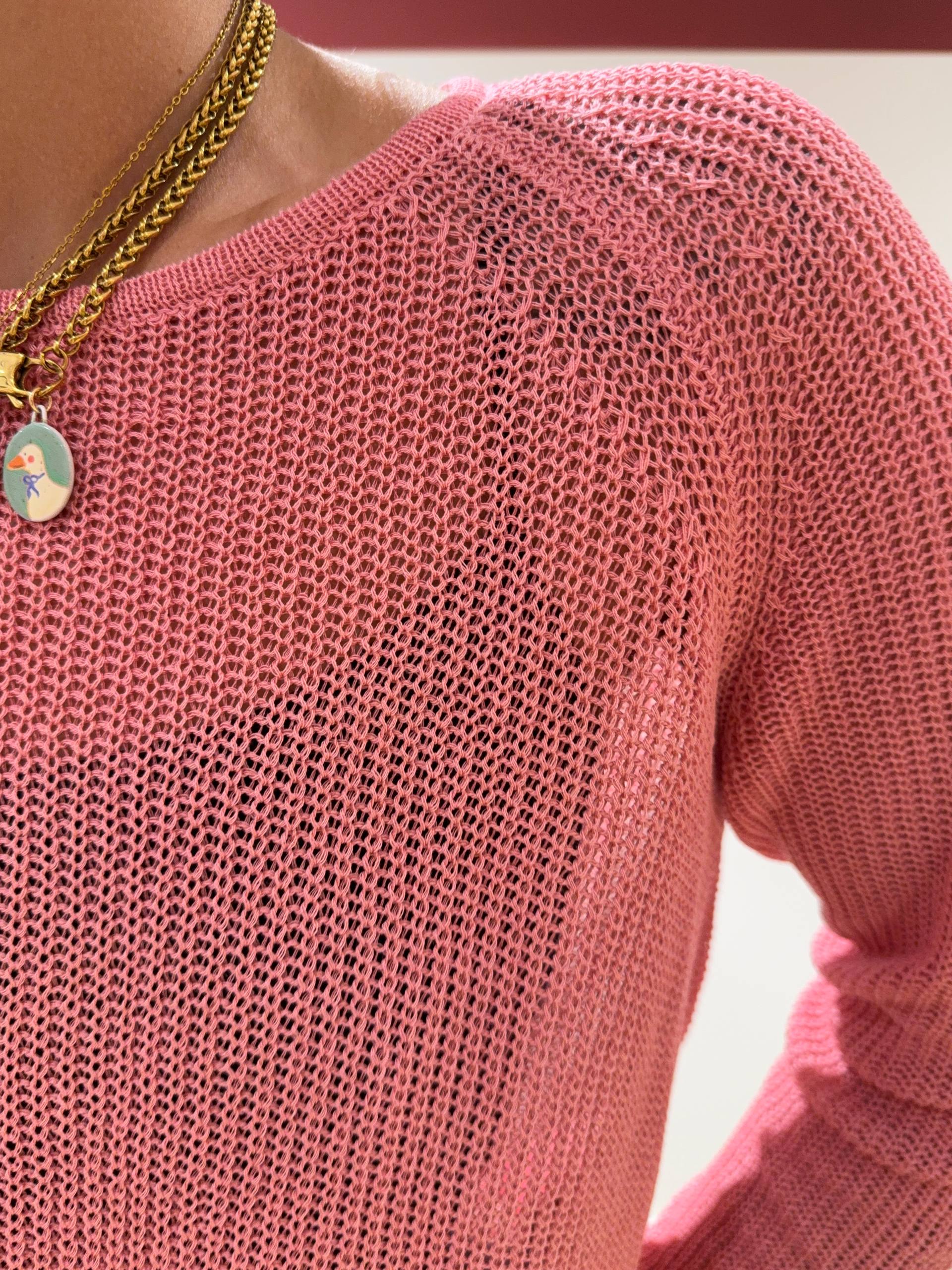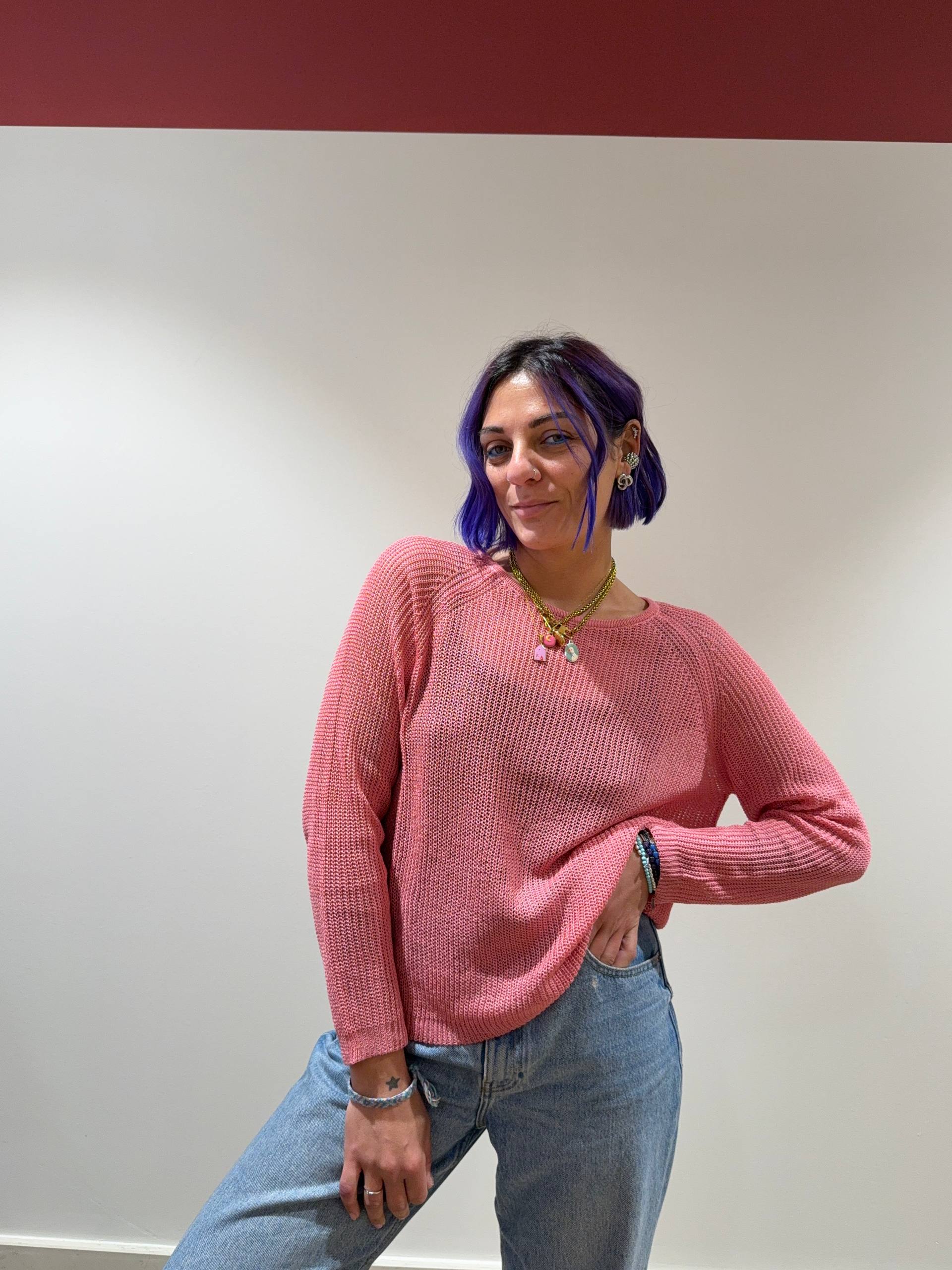 Maglia di filo traforata rosa. Vestibilità morbida. Isabella indossala M per portarla più morbida. Lei è una 42 ed è alta 1.68.