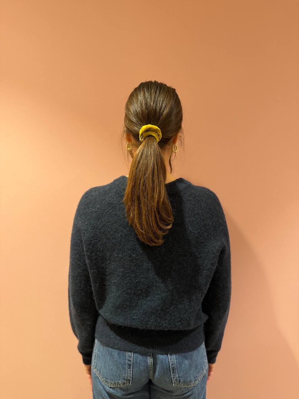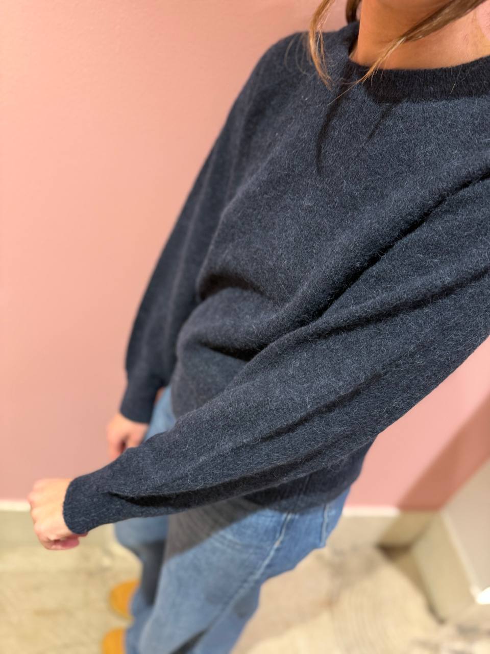 Maglione blu notte modello morbido. Giorgia indossa la taglia XS\S ed è alta 1.65.