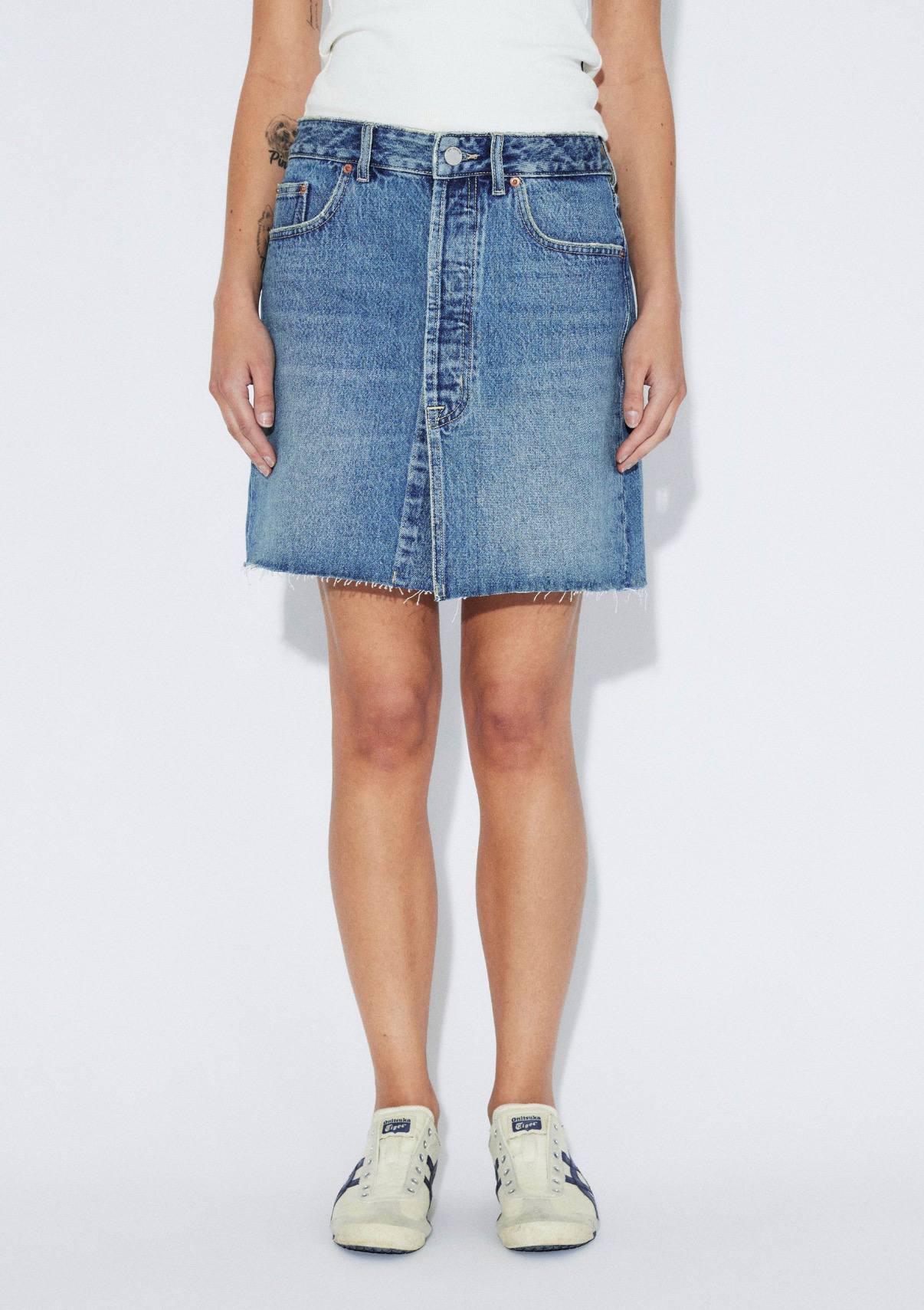 Mini gonna in denim con bottoni. Taglia vivo. Vita alta. Modello a campana. La modella indossa la S ed è alta 1.70.