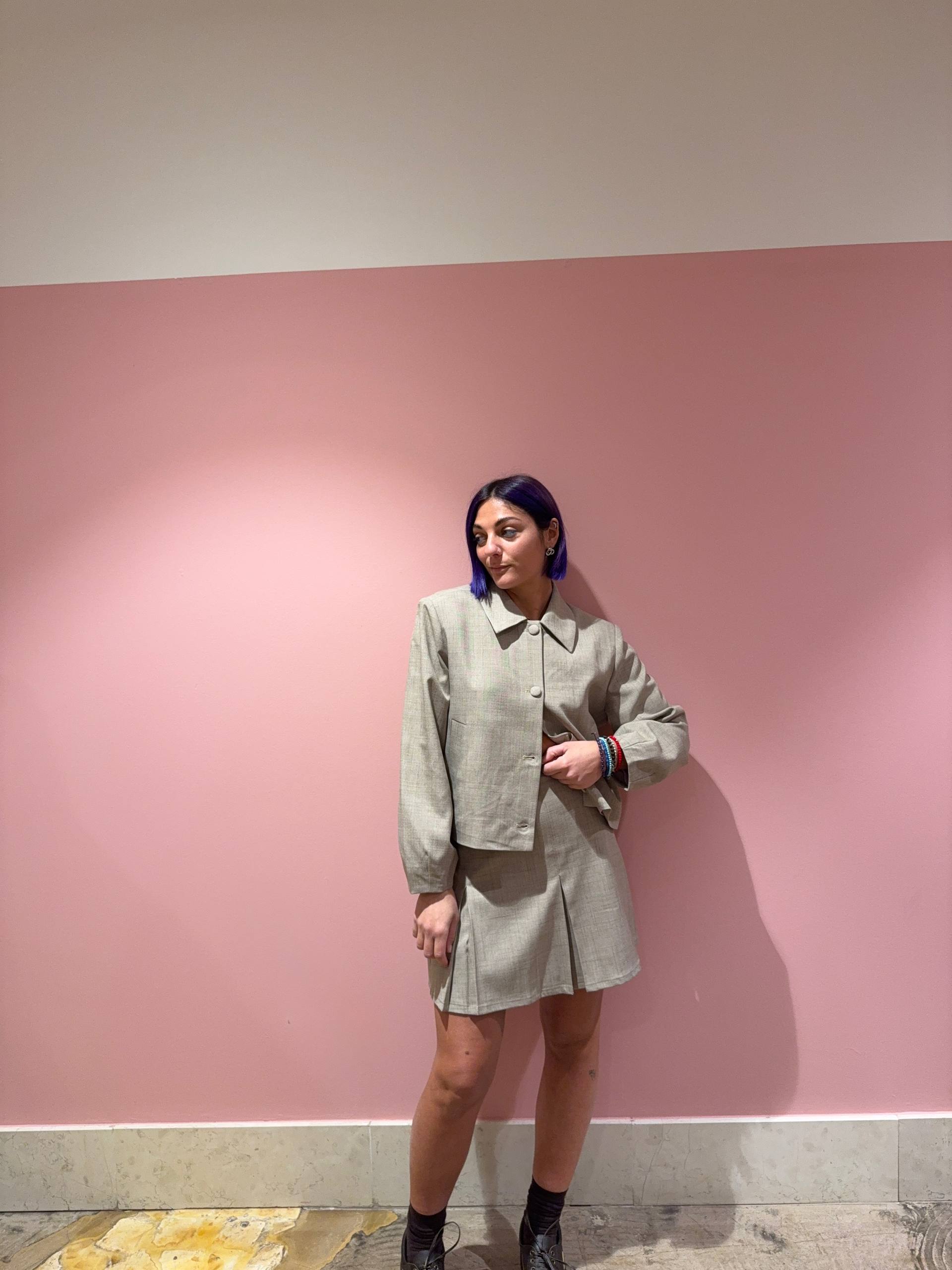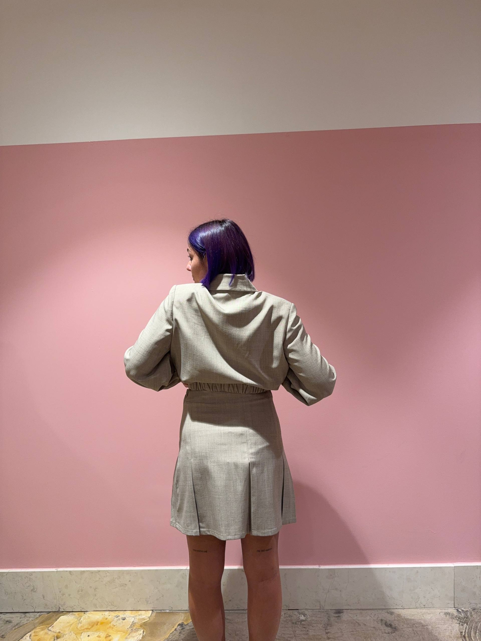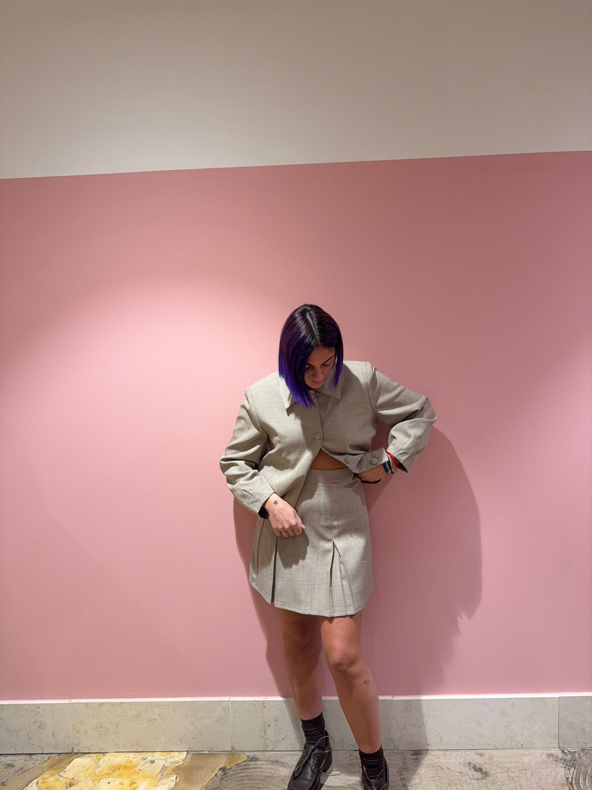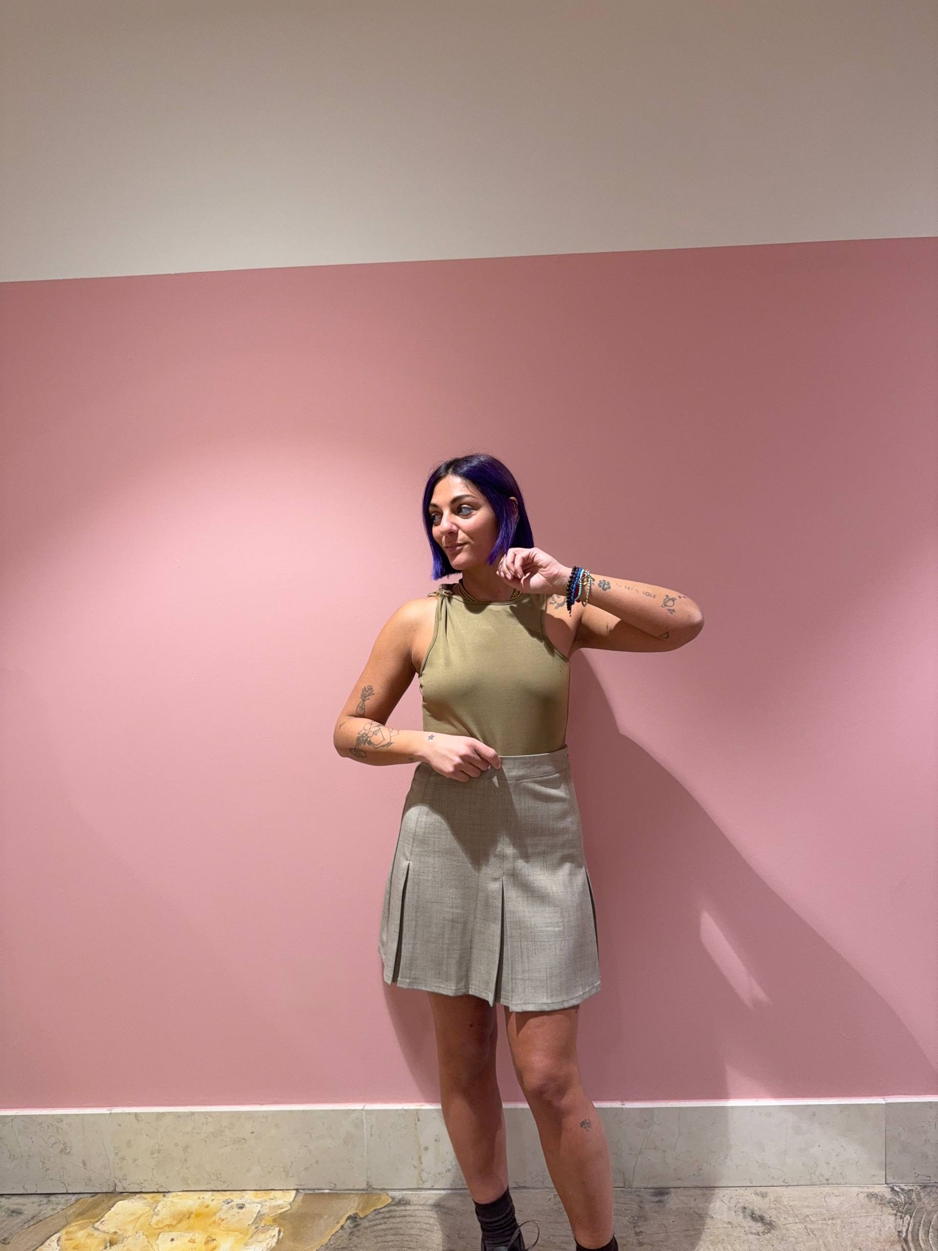 Minigonna a pieghe color sabbia melangiato. Chiusura con cerniera laterale. Isabella veste una 42 e indossa la S, è alta 1.68.