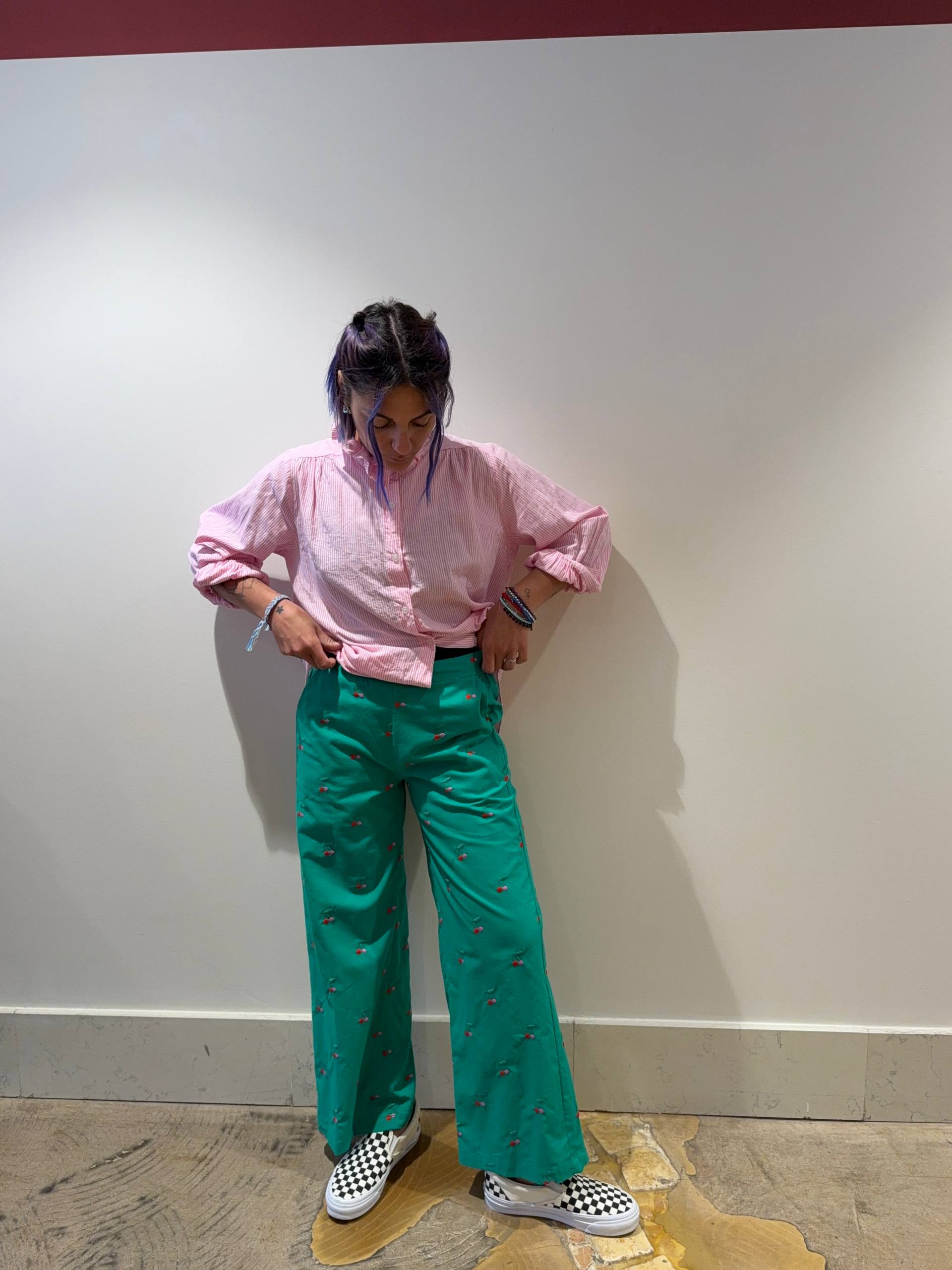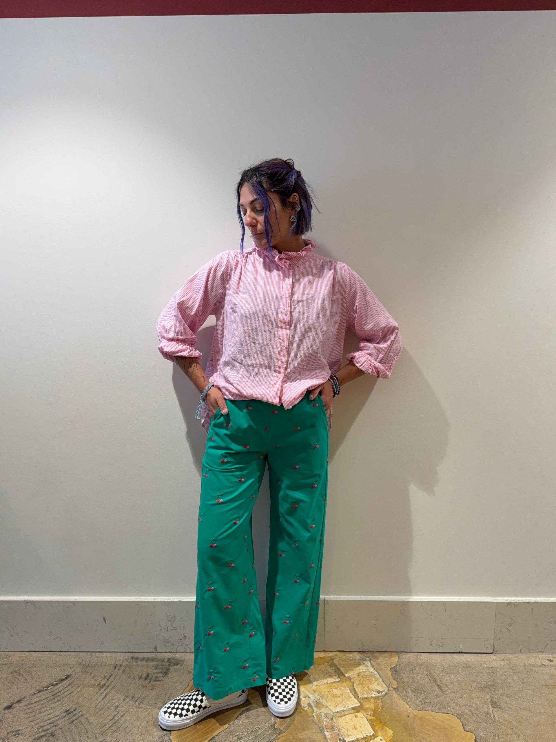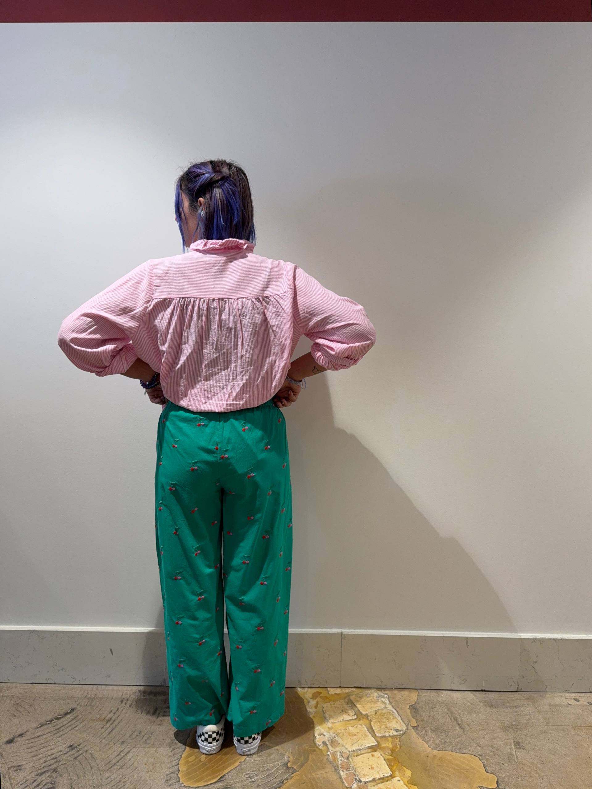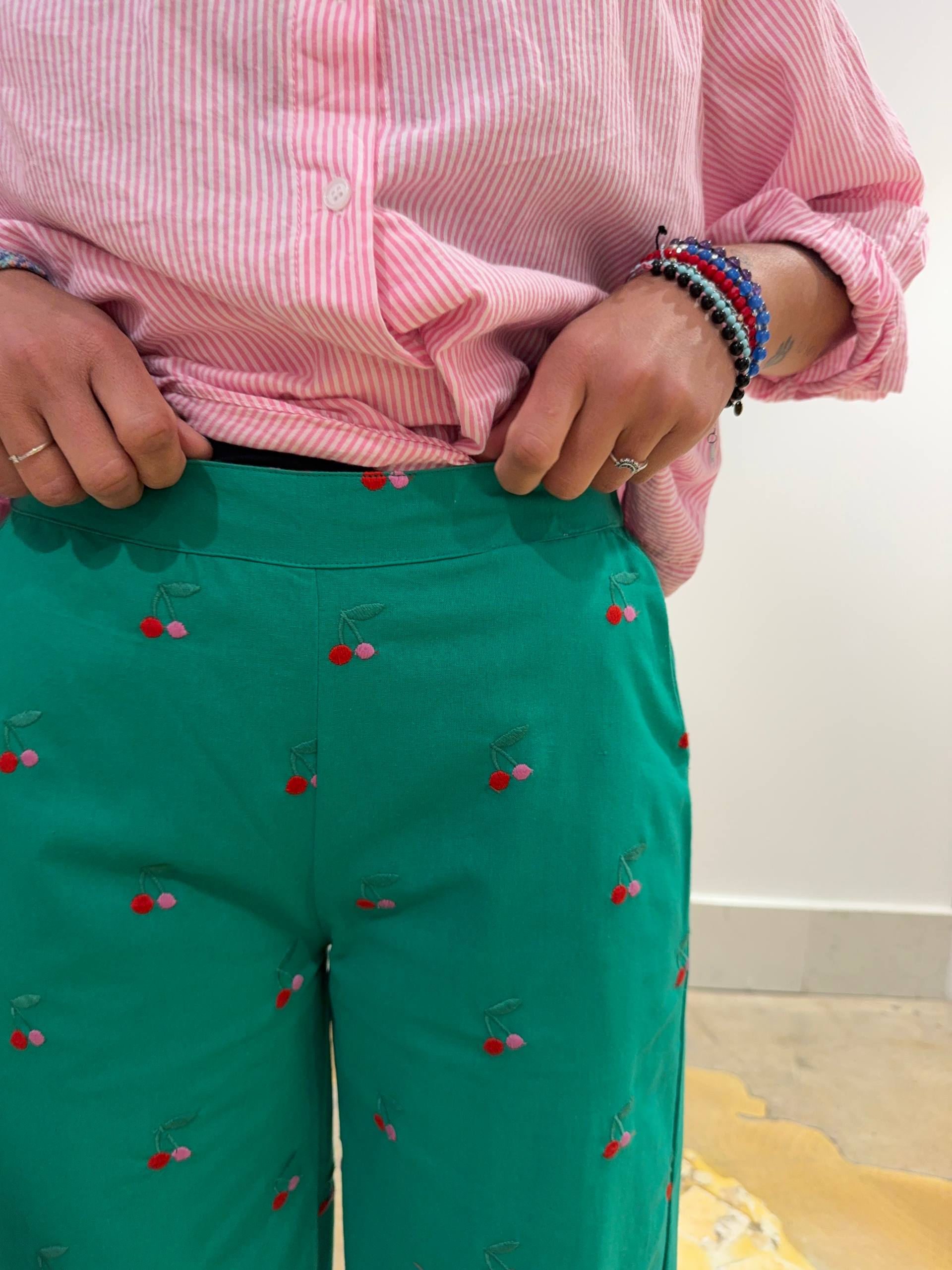 Pantalone verde con ciliegie ricamate. Elastico sul retro. Veste aderente sul sedere con gamba morbida. Isabella indossa la S e veste una 42 ed è alta 1.68.