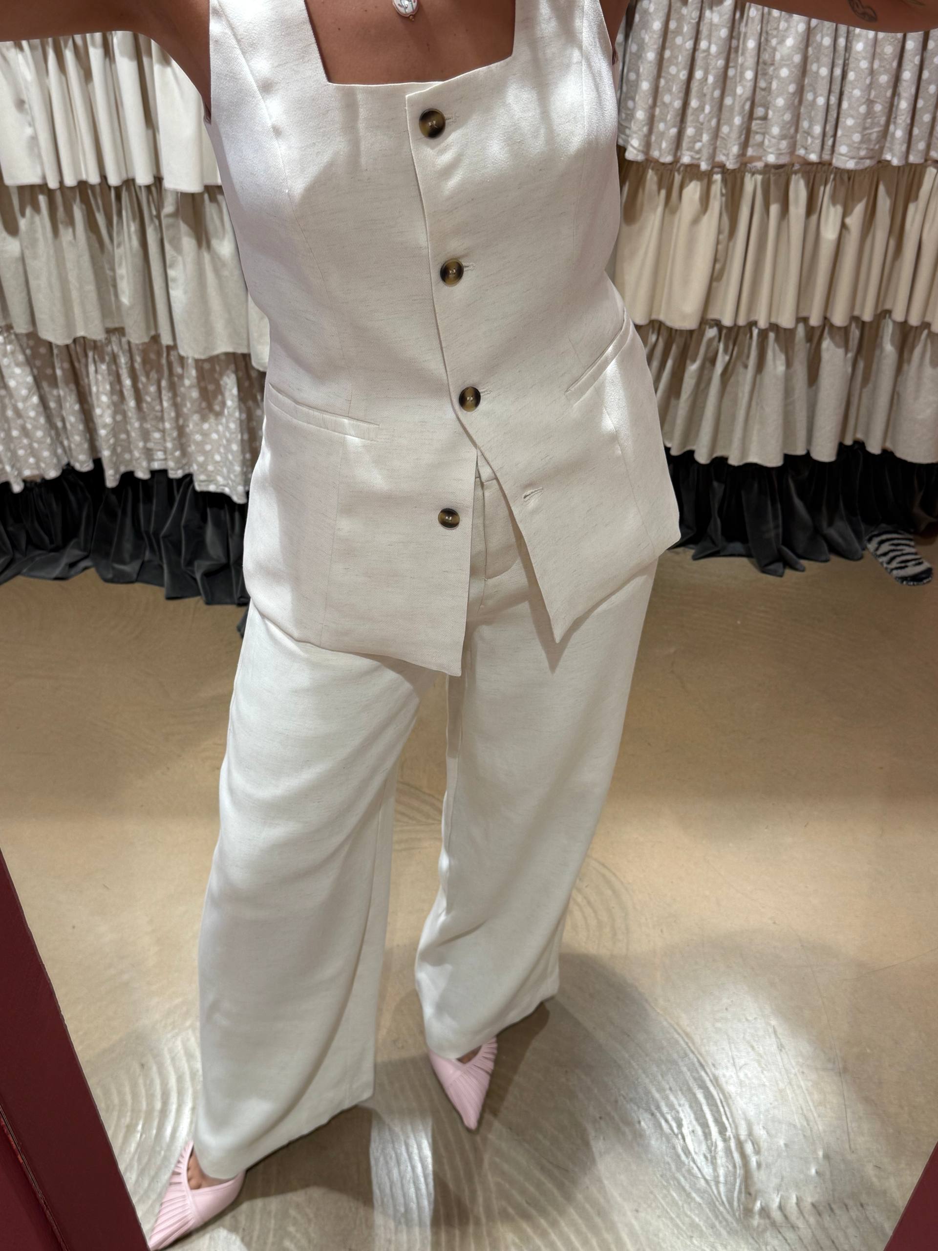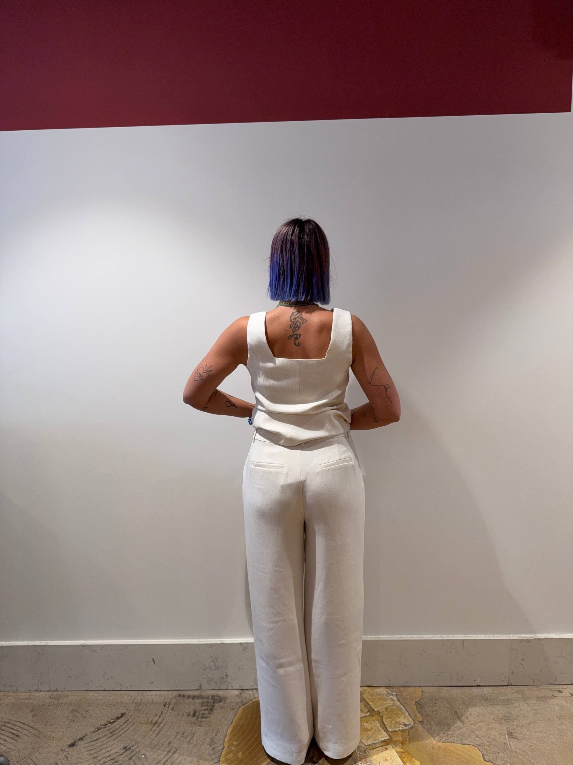 Pantalone con gamba dritta e larga. Vita alta. Tasche laterali. Chiusura con cerniera, due ganci e un bottone. Vestibilità morbida.