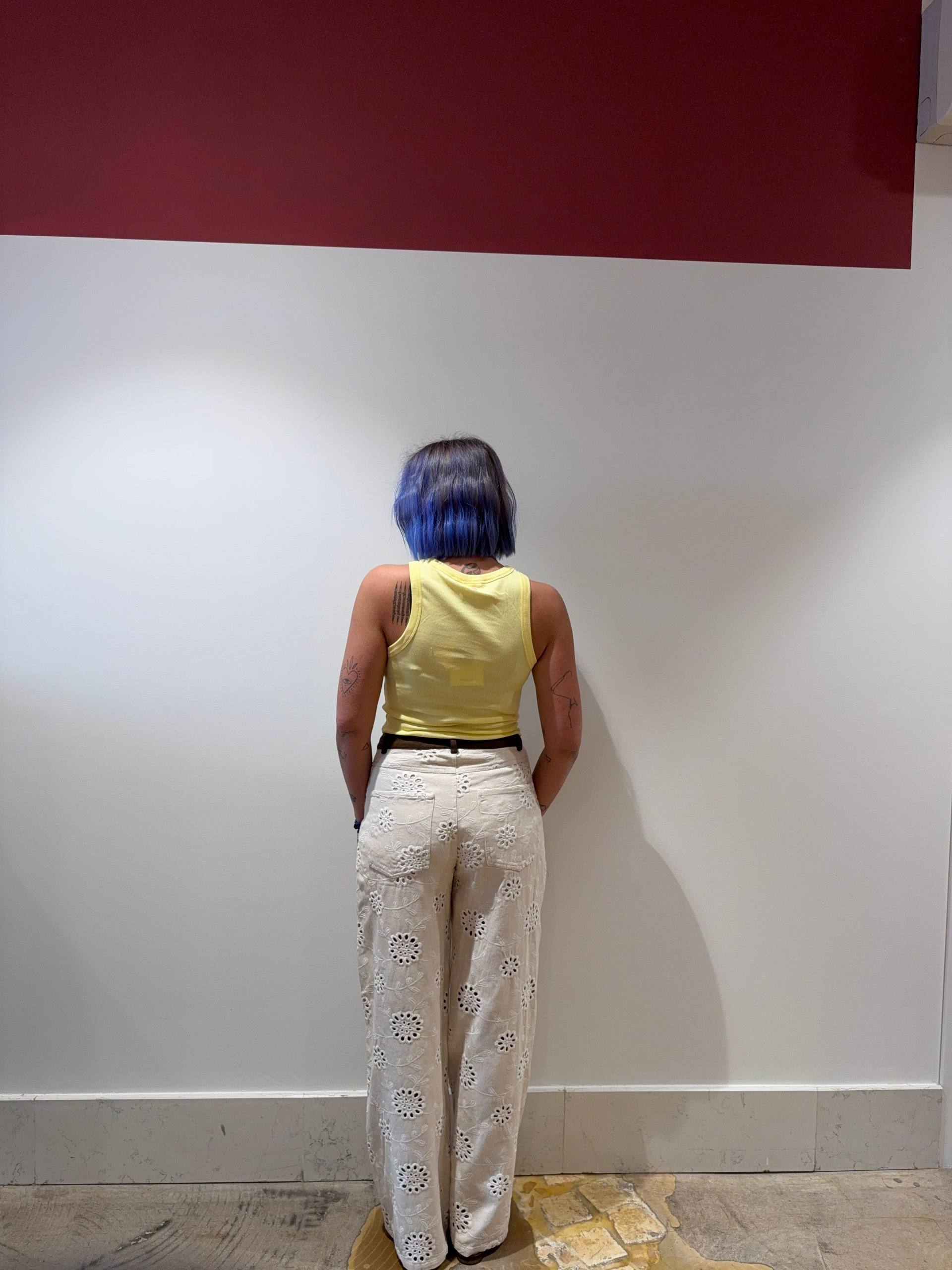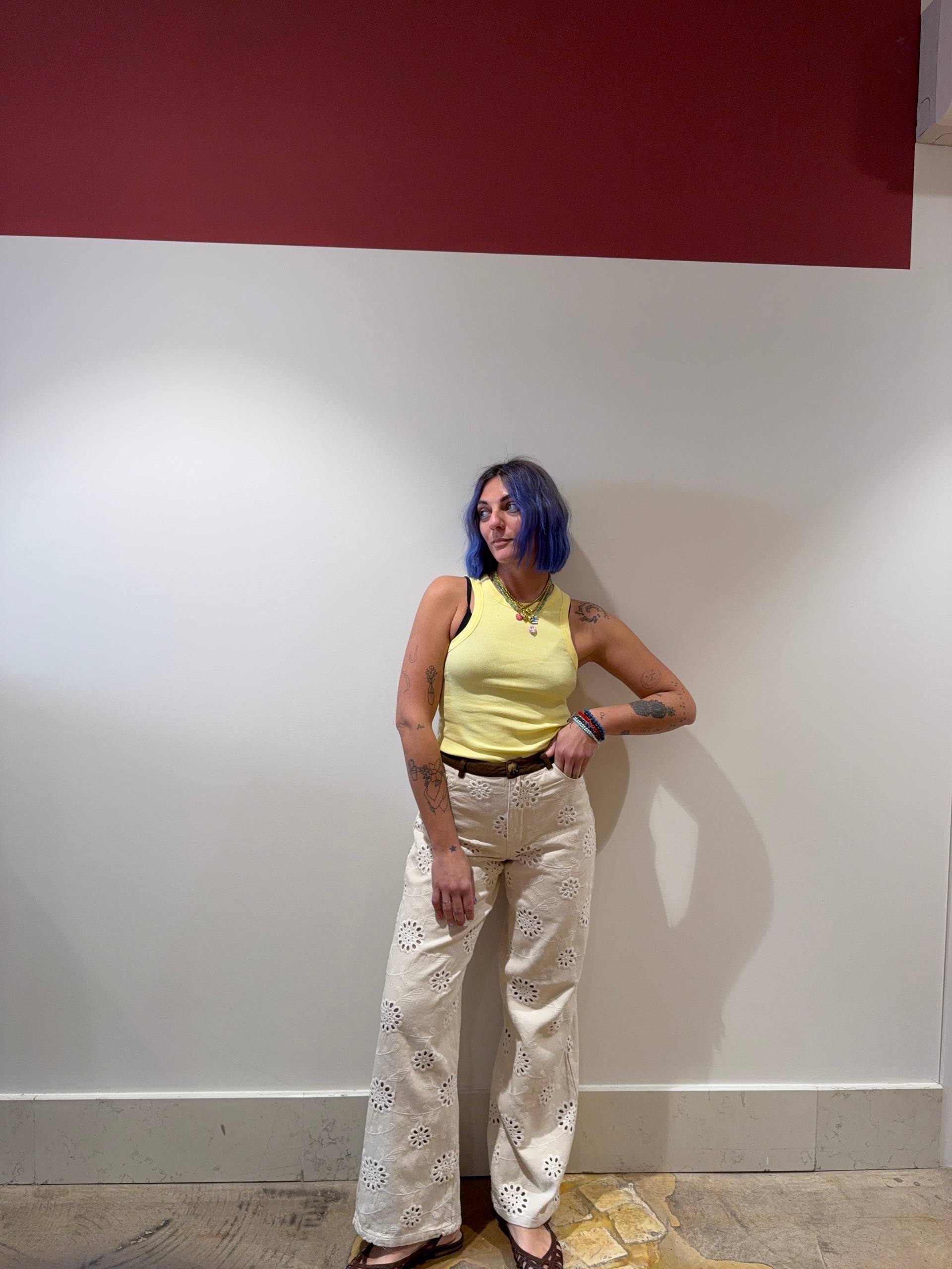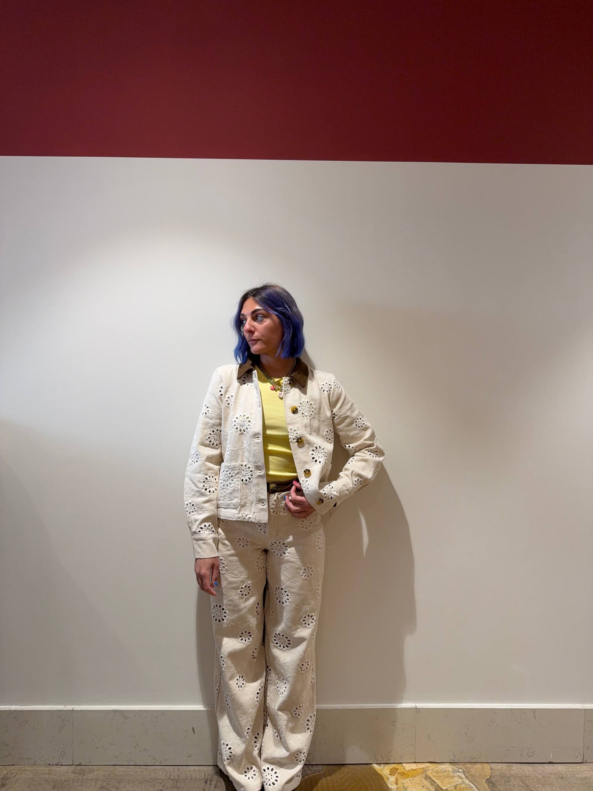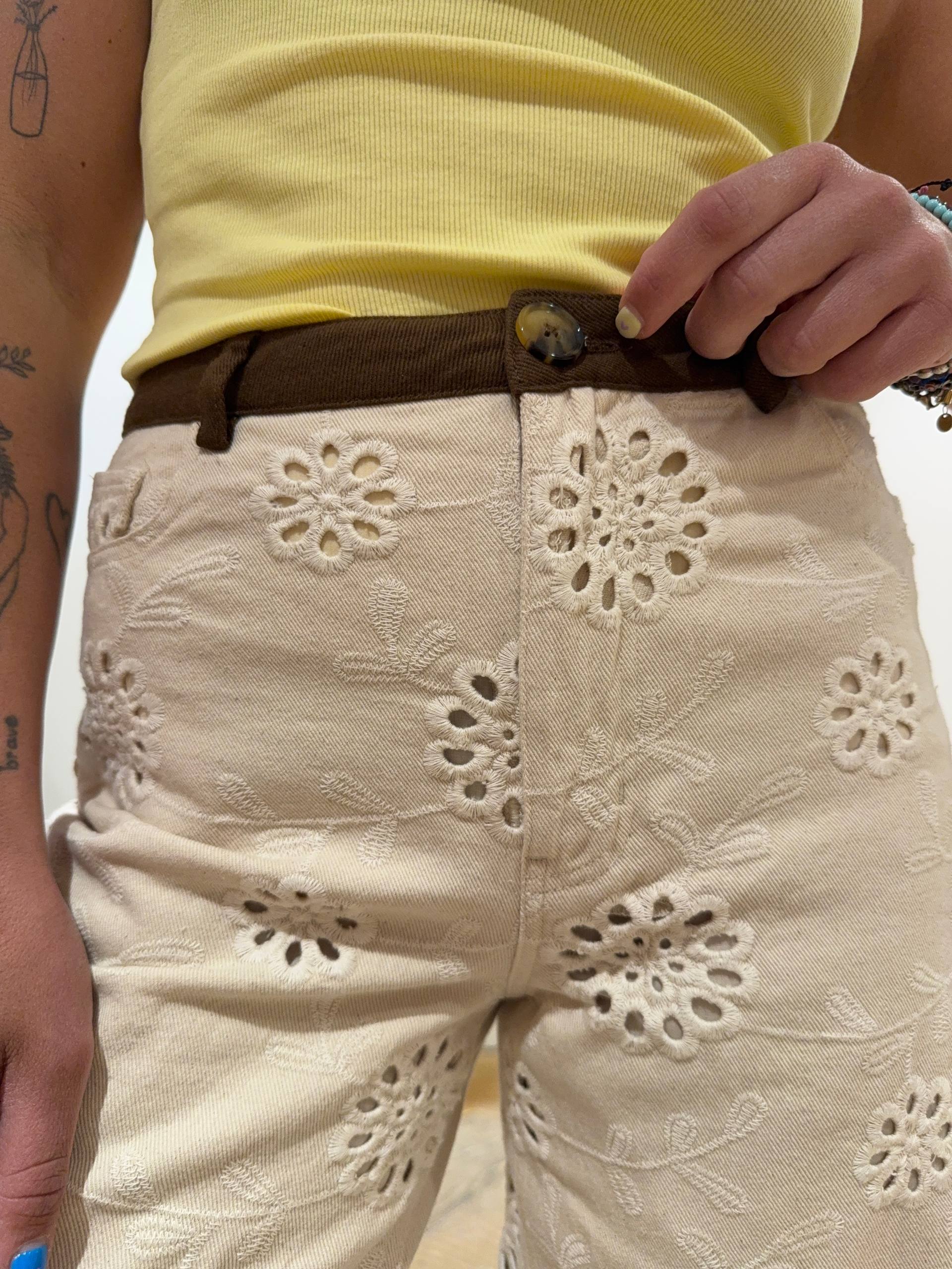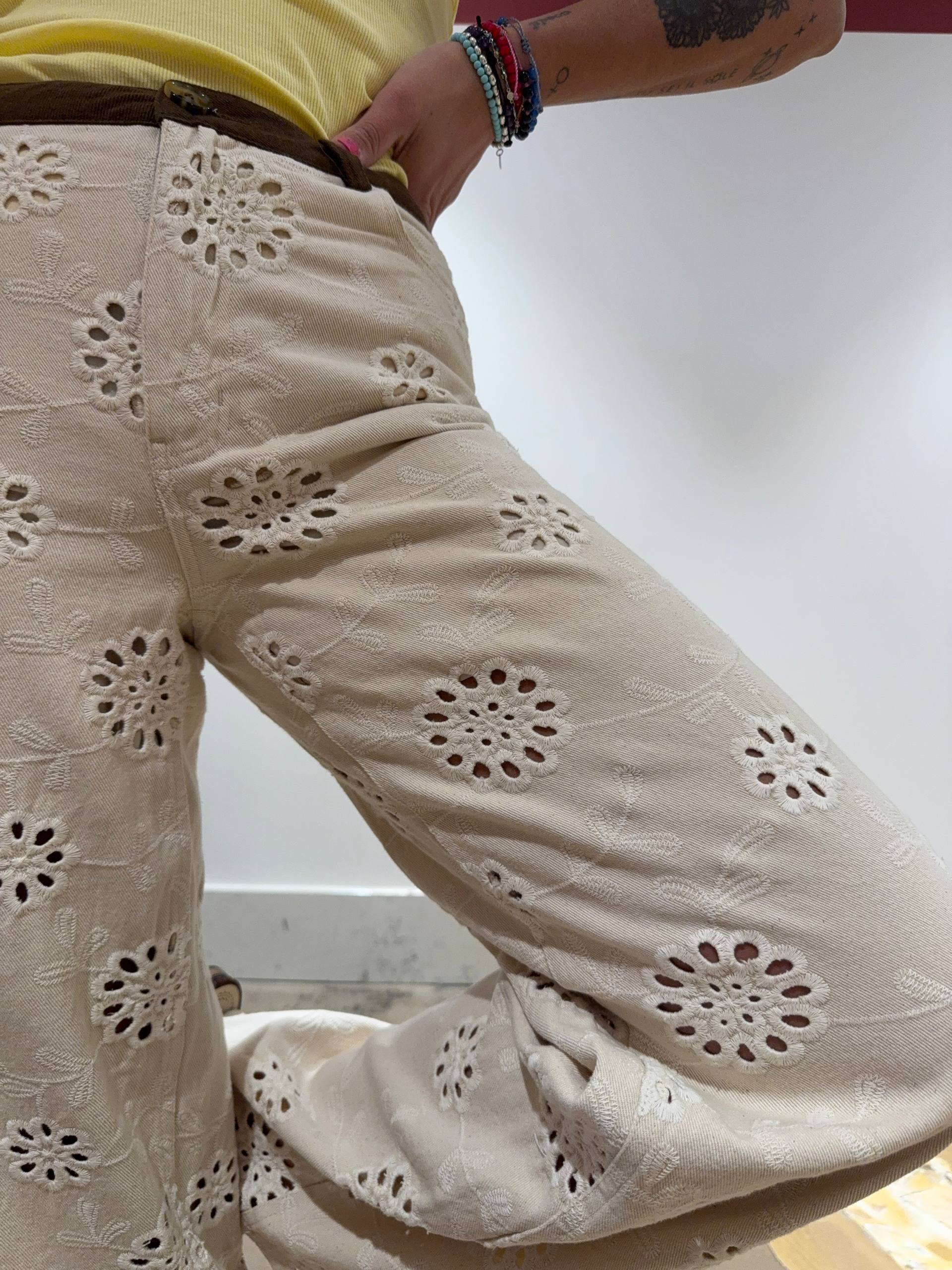 Pantalone in denim color crema lavorato in sangallo. Dettaglio bordo marrone a costine. Ha la sottoveste a culotte. Vestibilità regolare. Chiusura cerniera e bottone. Isabella indossa la S e veste una 42 ed è alta 1.68.