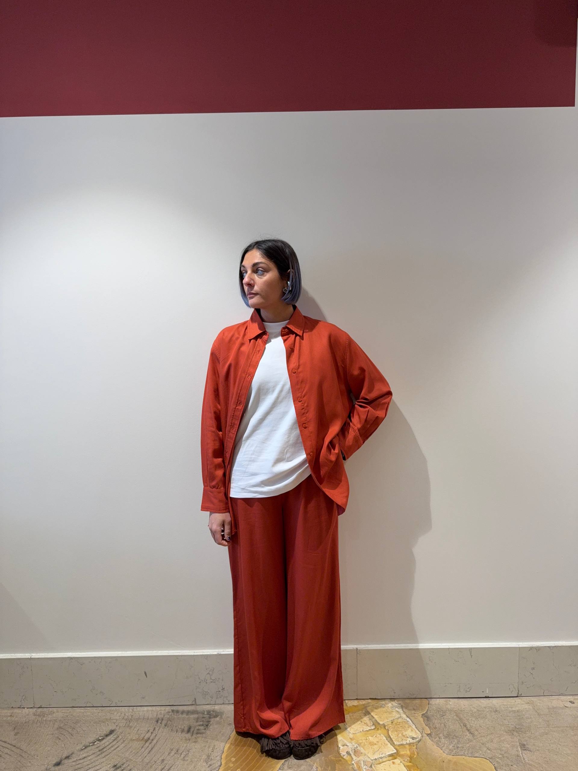 Pantalone in tencel a palazzo con gamba larga e dritta, vita aderente e tasche laterali. Elastico sul retro.