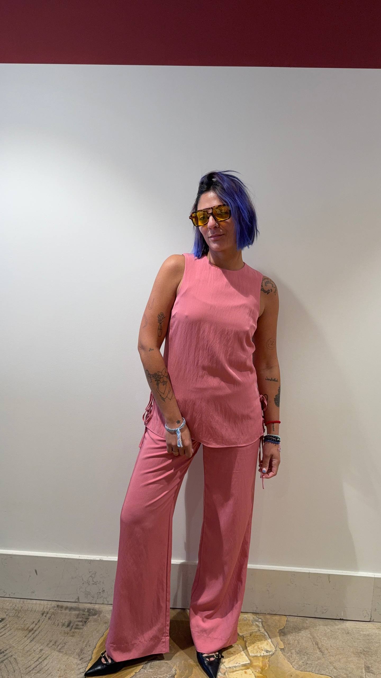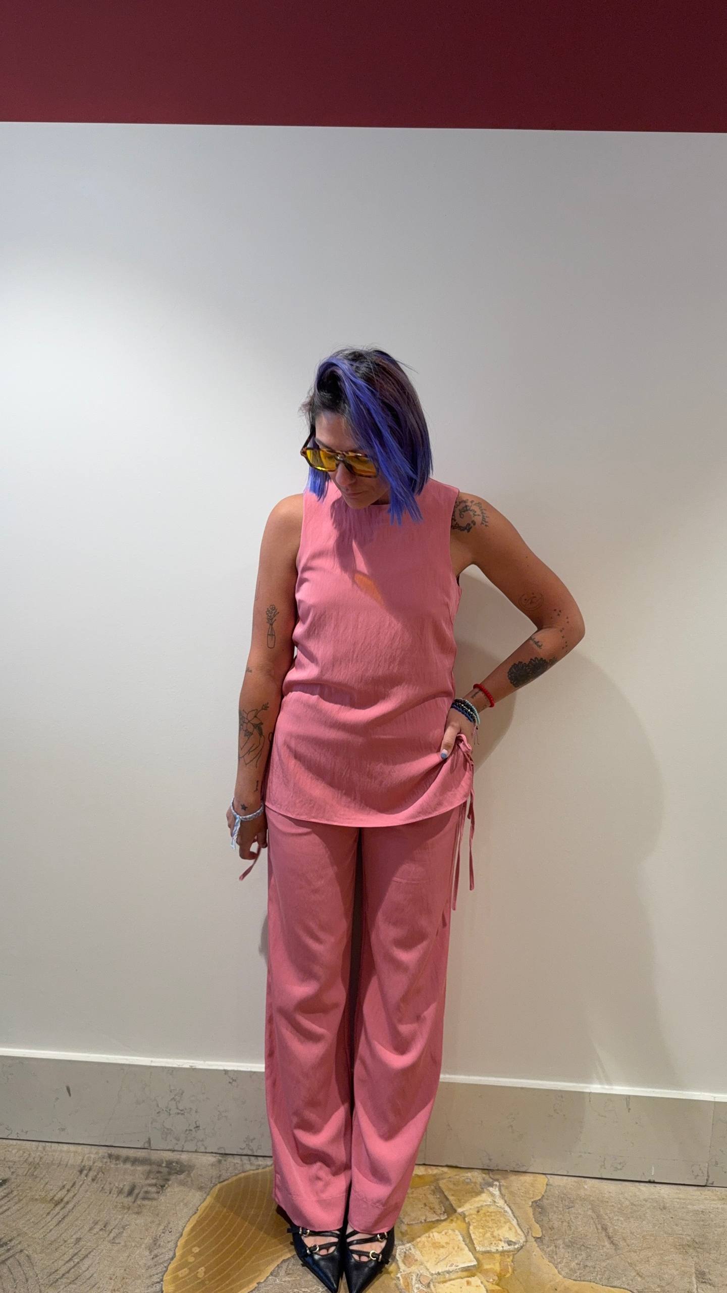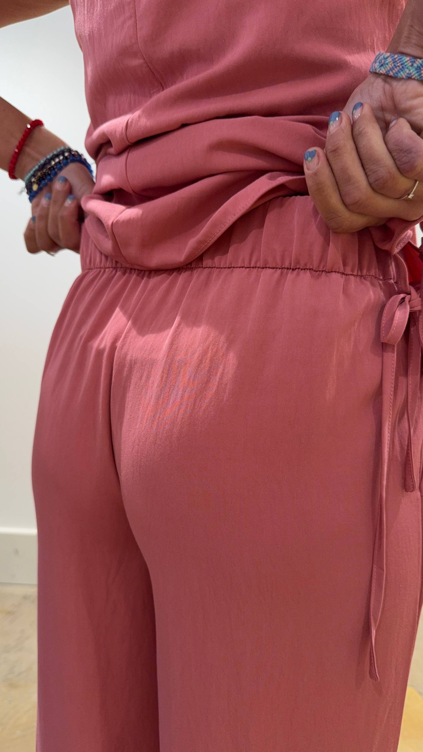 Pantalone rosa carminio. Elastico sul retro. Veste aderente sul sedere con gamba morbida. Isabella indossa la taglia S e veste una 42 ed è alta 1.68.