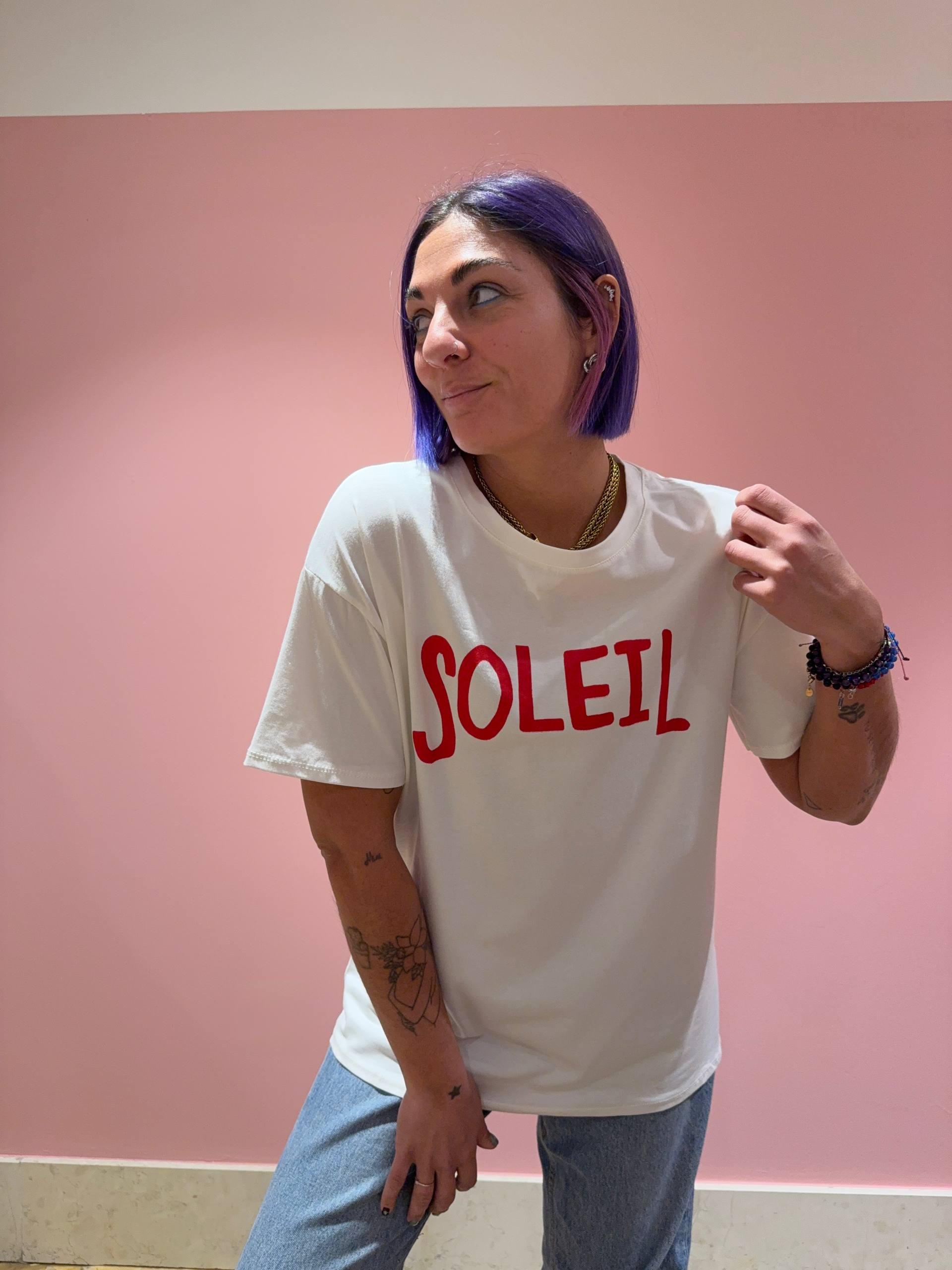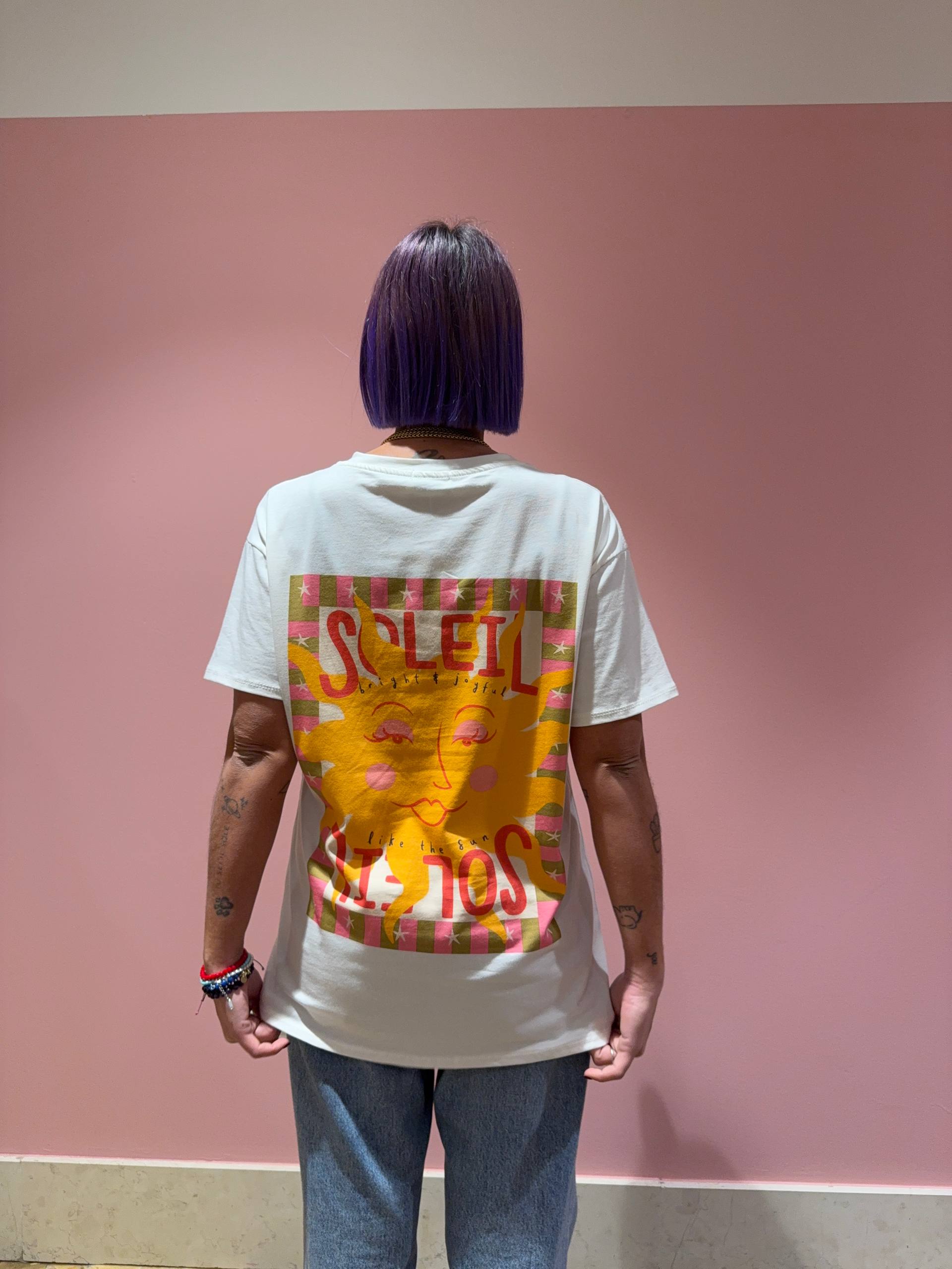 T-shirt con scritta SOLEIL e con disegno sul retro. Vestibilità morbida.