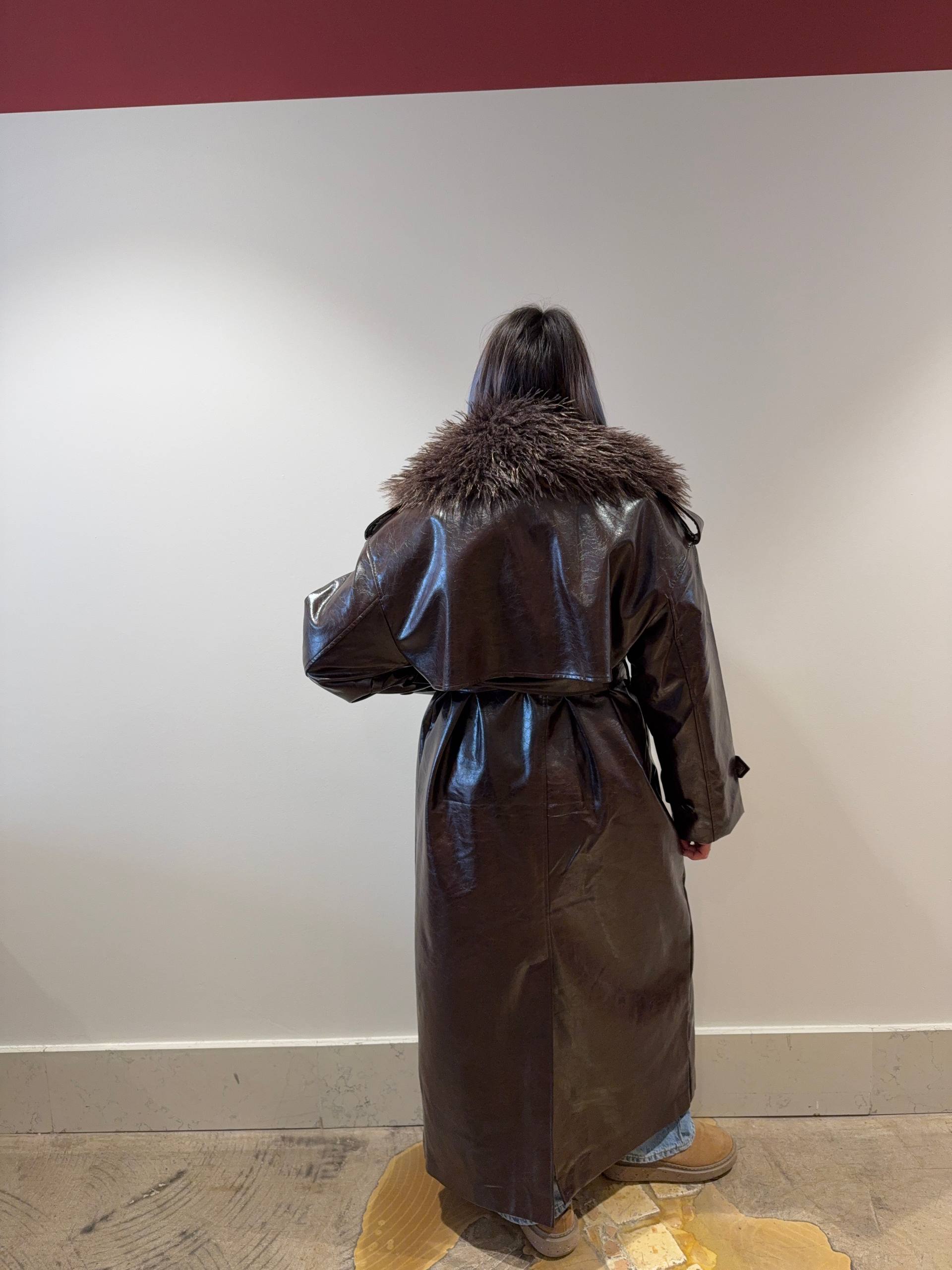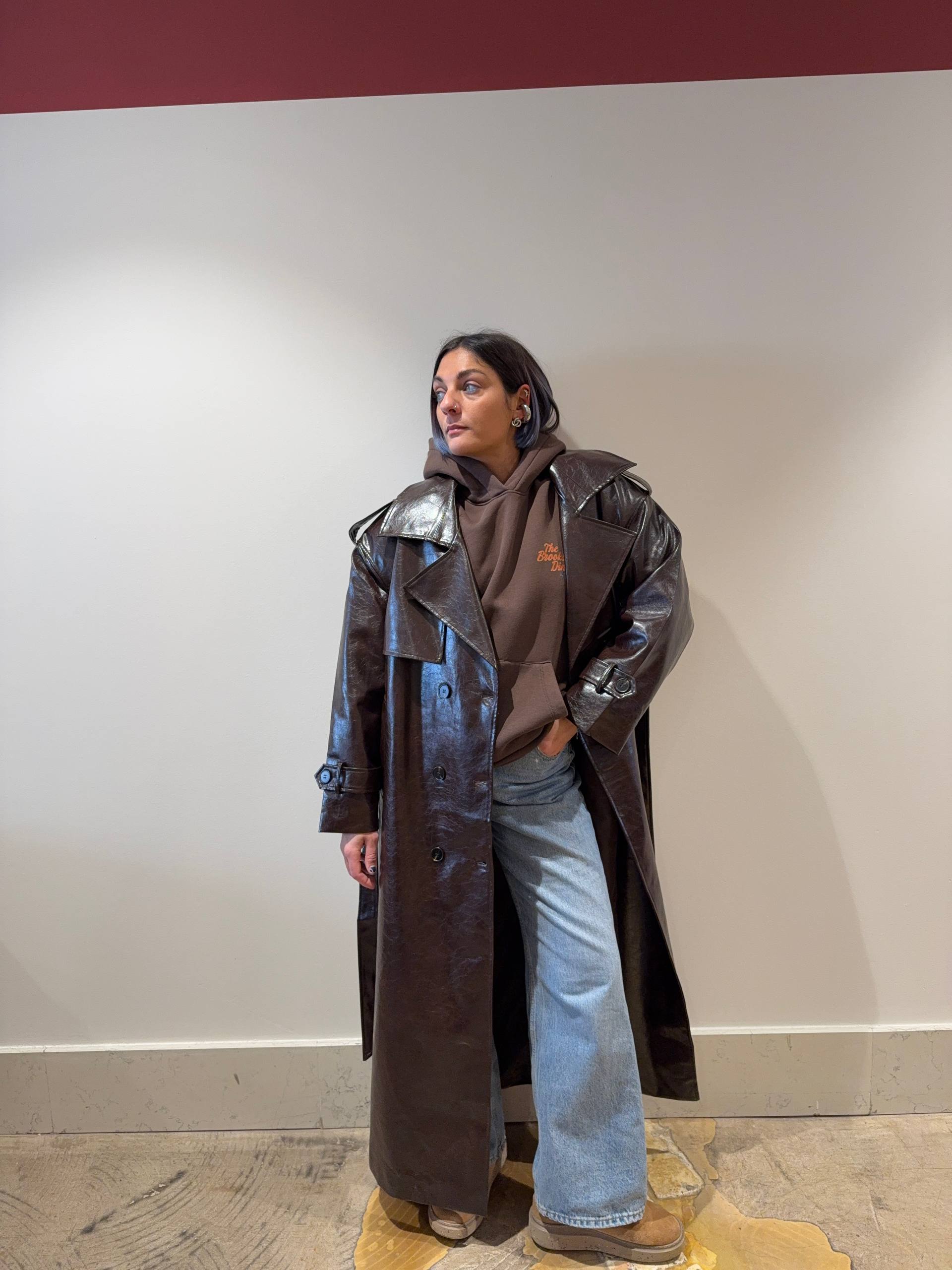 Trench lungo in ecopelle color cioccolato. Pelo ecologico removibile con bottoni.