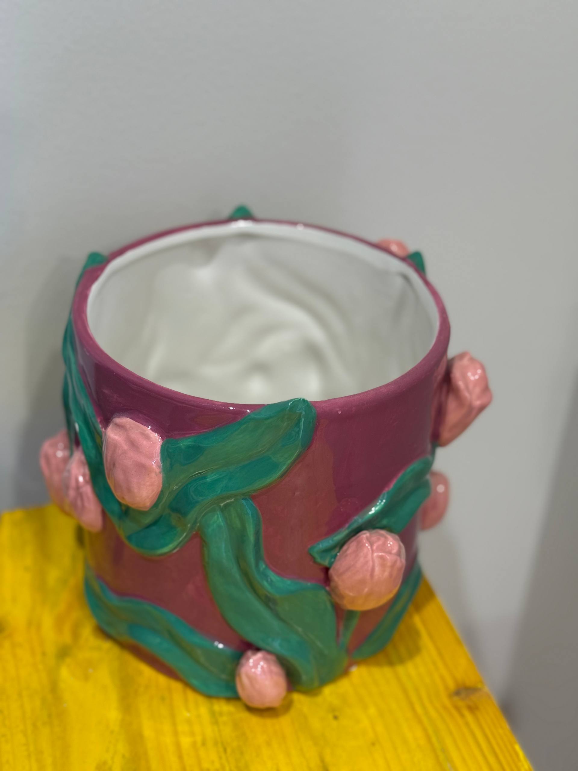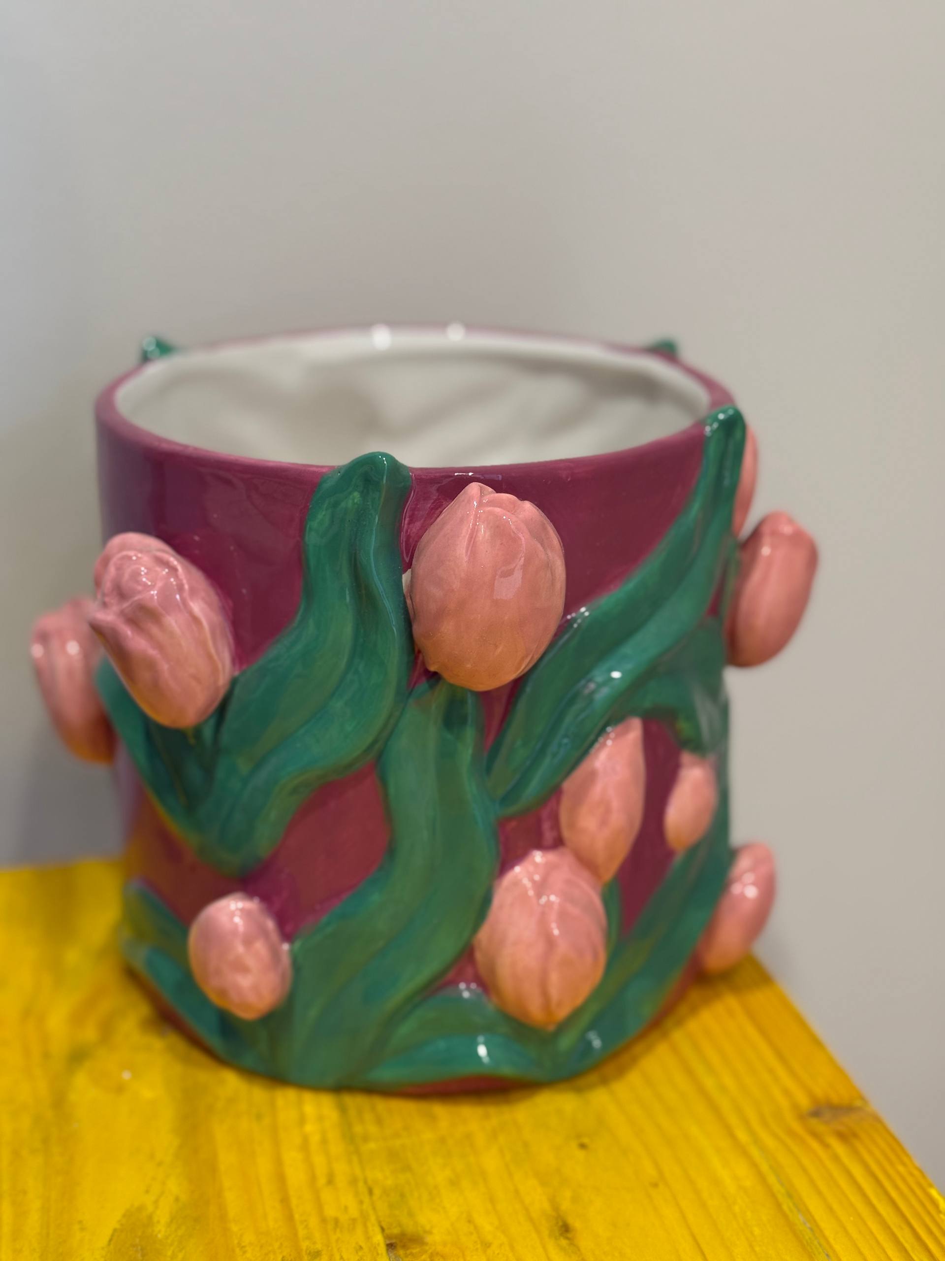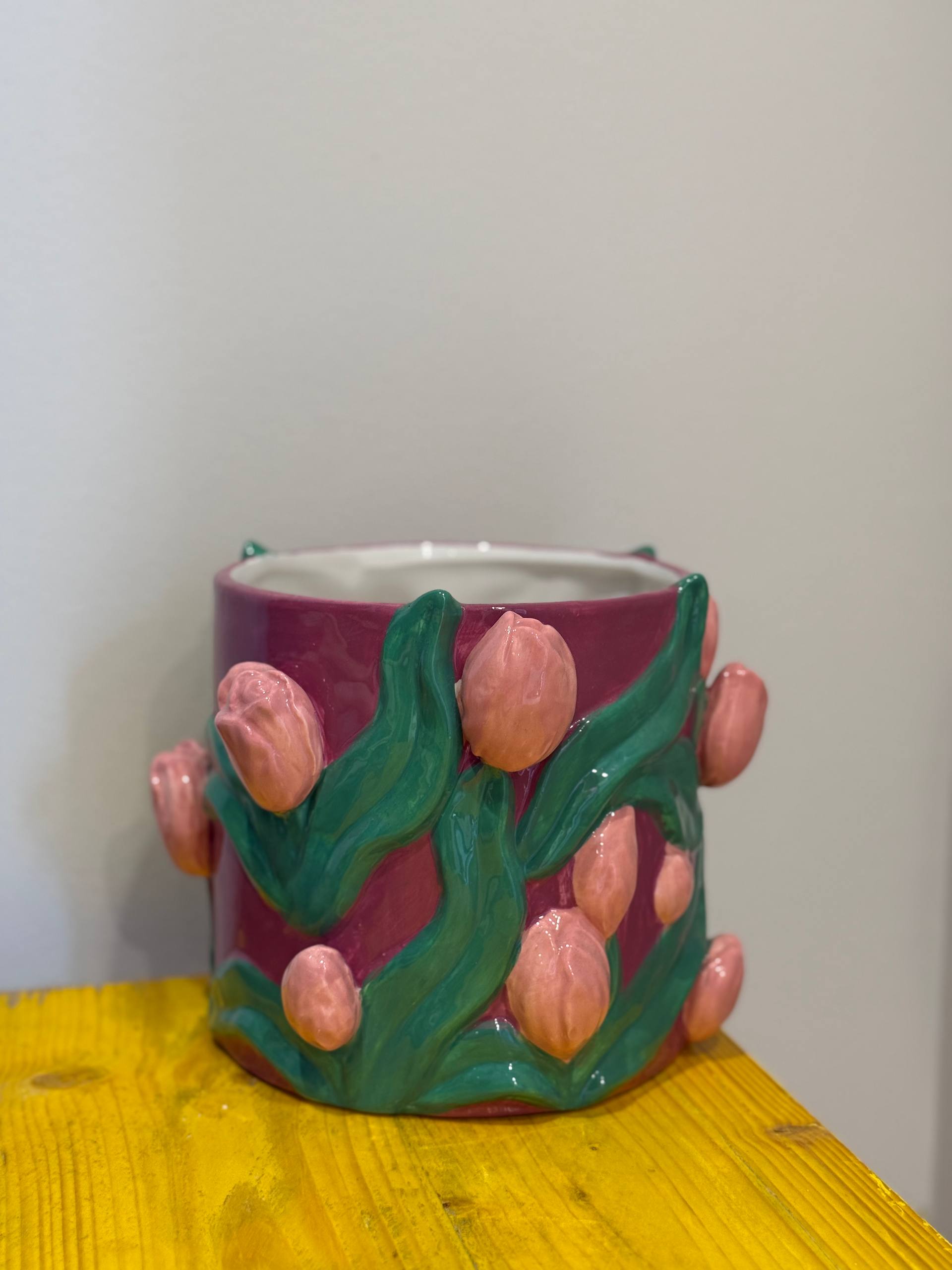 Vaso con sfondo color prugna e tulipani in rilievo rosa. Usalo per mettere in mostra i tuoi fiori preferiti o come portautensili.